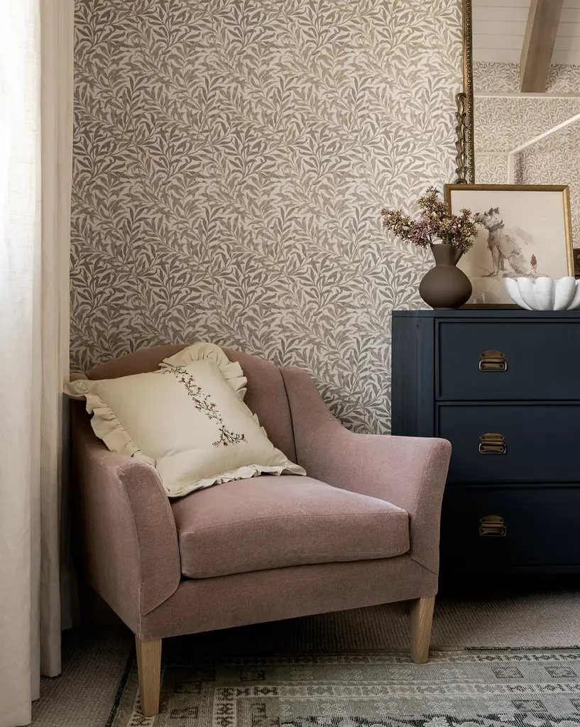 Made to order with a classic silhouette, the Prudence Chair has tapered oak legs that hold its frame with elegantly curved arms and a rounded top. Designed to complement and elevate your home, the chair is available in a selection of high-quality fabrics that highlight its timeless structure.