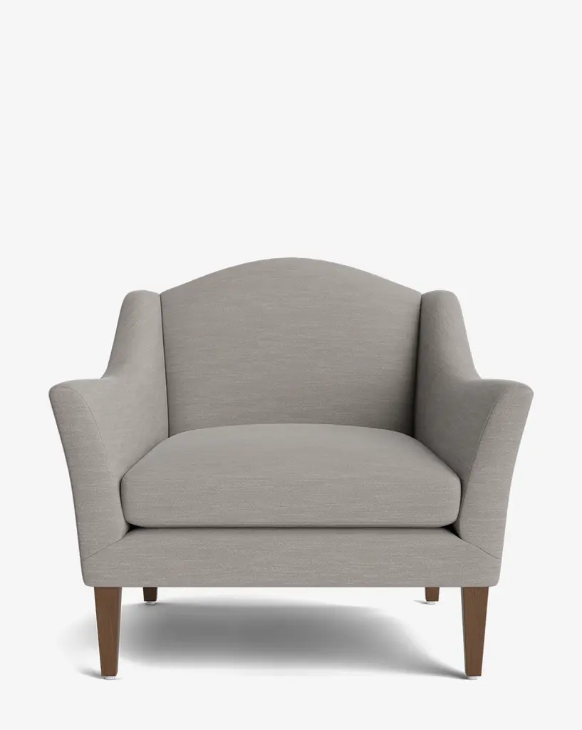 Made to order with a classic silhouette, the Prudence Chair has tapered oak legs that hold its frame with elegantly curved arms and a rounded top. Designed to complement and elevate your home, the chair is available in a selection of high-quality fabrics that highlight its timeless structure.