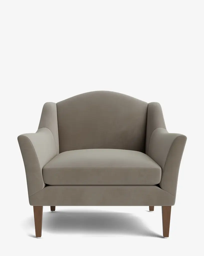 Made to order with a classic silhouette, the Prudence Chair has tapered oak legs that hold its frame with elegantly curved arms and a rounded top. Designed to complement and elevate your home, the chair is available in a selection of high-quality fabrics that highlight its timeless structure.