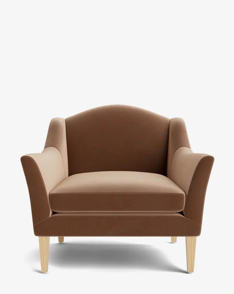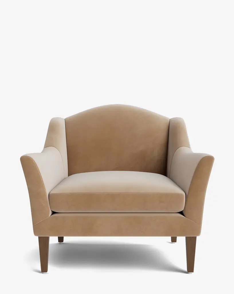 Made to order with a classic silhouette, the Prudence Chair has tapered oak legs that hold its frame with elegantly curved arms and a rounded top. Designed to complement and elevate your home, the chair is available in a selection of high-quality fabrics that highlight its timeless structure.