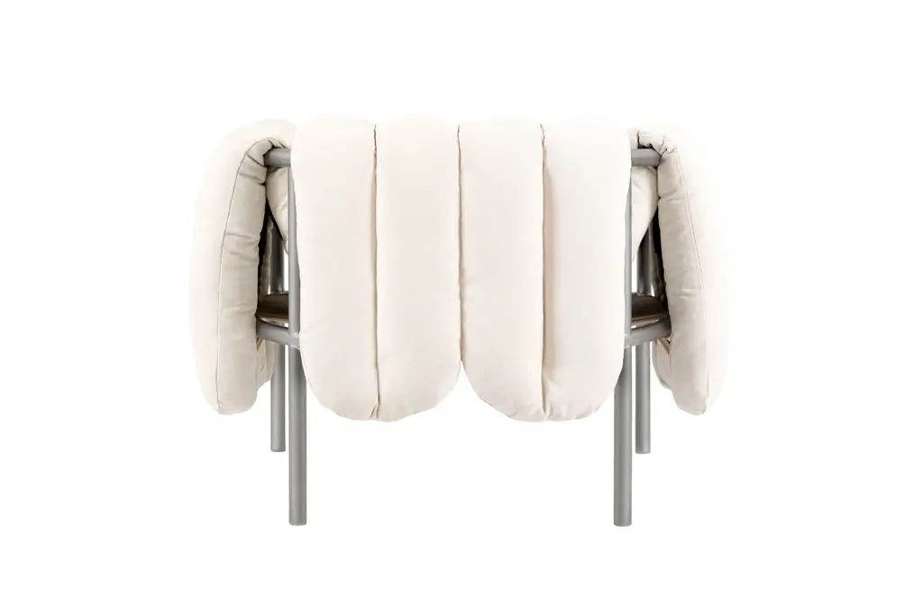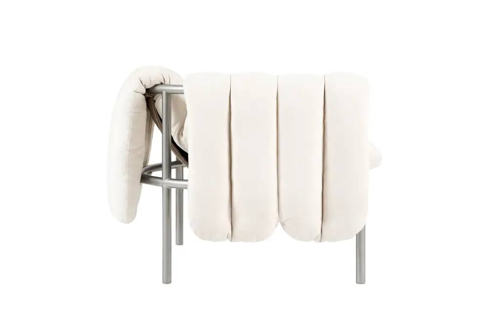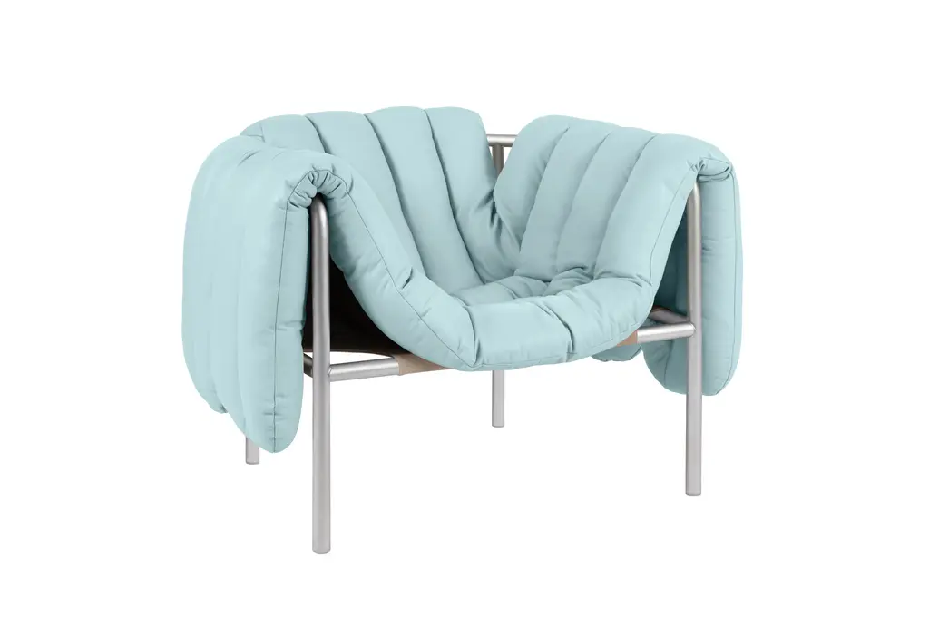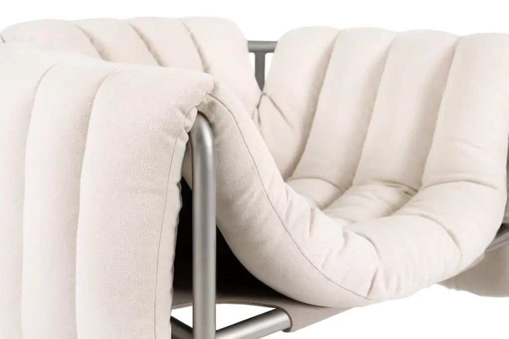 The detachable upholstery of the Puffy Lounge Chair is fat and plump, its generous shape spills freely over the sides of a tubular steel frame which, in stark contrast, is hard-lined and strong. The two key elements of this seating design by Faye Toogood are in purposeful and playful juxtaposition. The elementary frame is inspired by the rational structure of classic modernist design, whilst the extravagant quilt-like upholstery warmly embraces and envelopes, is comforting and reassuring. The Puffy Chair frame is available in powder-coated or sand-blasted steel finishes and a choice of thick canvas, chunky bouclé or luxurious leather upholstery.