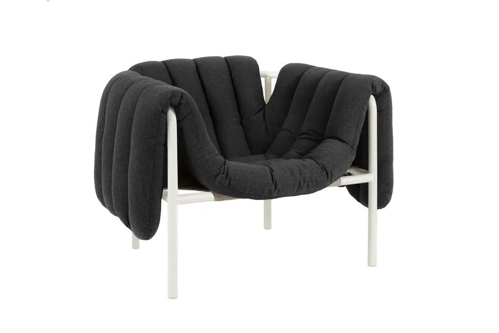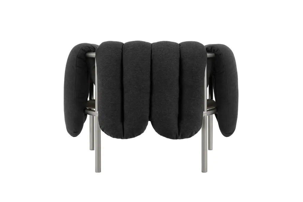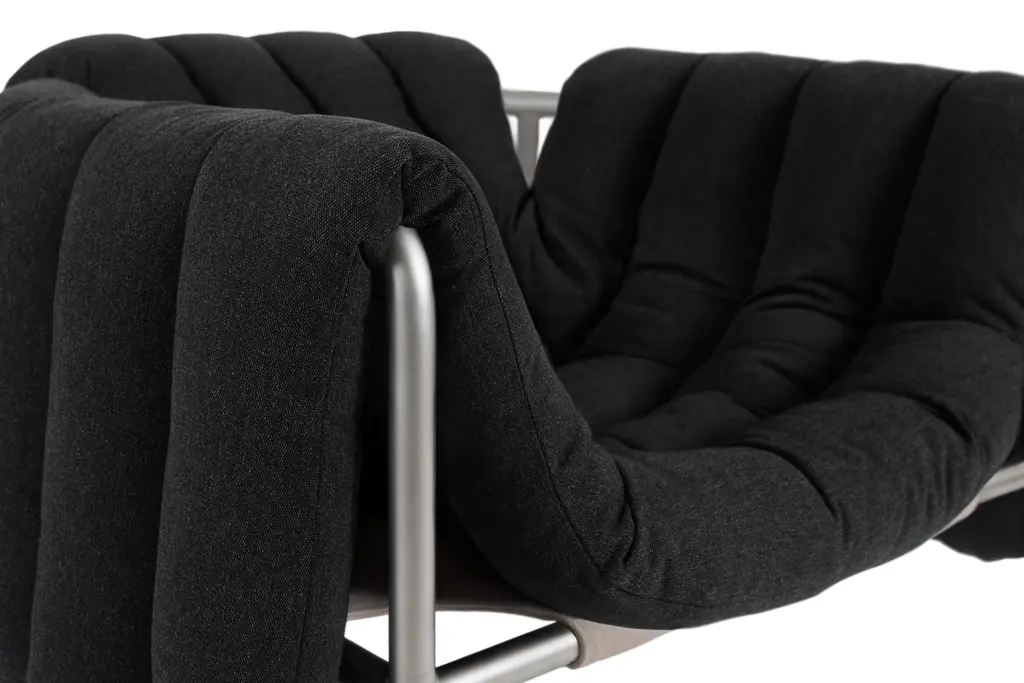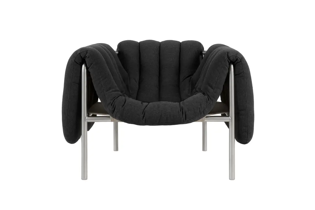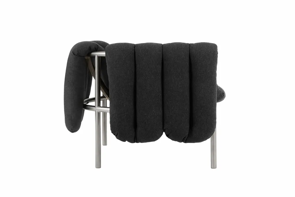 The detachable upholstery of the Puffy Lounge Chair is fat and plump, its generous shape spills freely over the sides of a tubular steel frame which, in stark contrast, is hard-lined and strong. The two key elements of this seating design by Faye Toogood are in purposeful and playful juxtaposition. The elementary frame is inspired by the rational structure of classic modernist design, whilst the extravagant quilt-like upholstery warmly embraces and envelopes, is comforting and reassuring. The Puffy Chair frame is available in powder-coated or sand-blasted steel finishes and a choice of thick canvas, chunky bouclé or luxurious leather upholstery.
