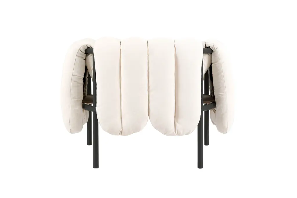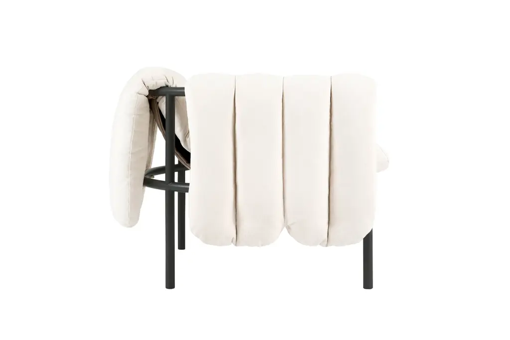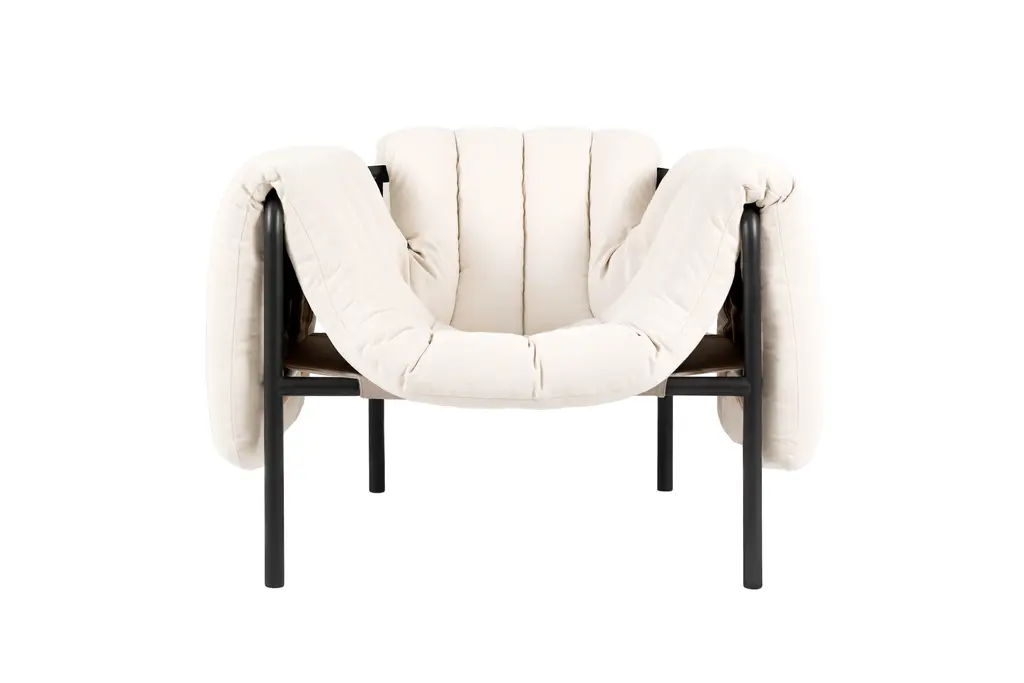 The detachable upholstery of the Puffy Lounge Chair is fat and plump, its generous shape spills freely over the sides of a tubular steel frame which, in stark contrast, is hard-lined and strong. The two key elements of this seating design by Faye Toogood are in purposeful and playful juxtaposition. The elementary frame is inspired by the rational structure of classic modernist design, whilst the extravagant quilt-like upholstery warmly embraces and envelopes, is comforting and reassuring. The Puffy Chair frame is available in powder-coated or sand-blasted steel finishes and a choice of thick canvas, chunky bouclé or luxurious leather upholstery.