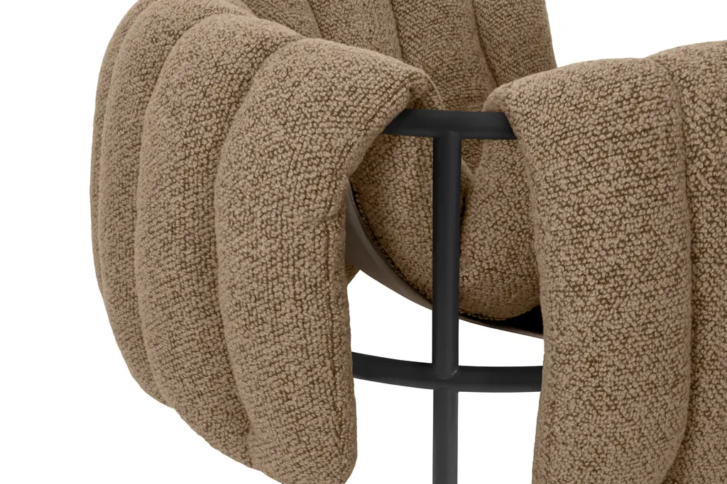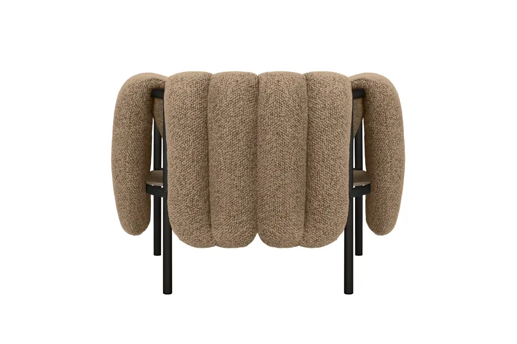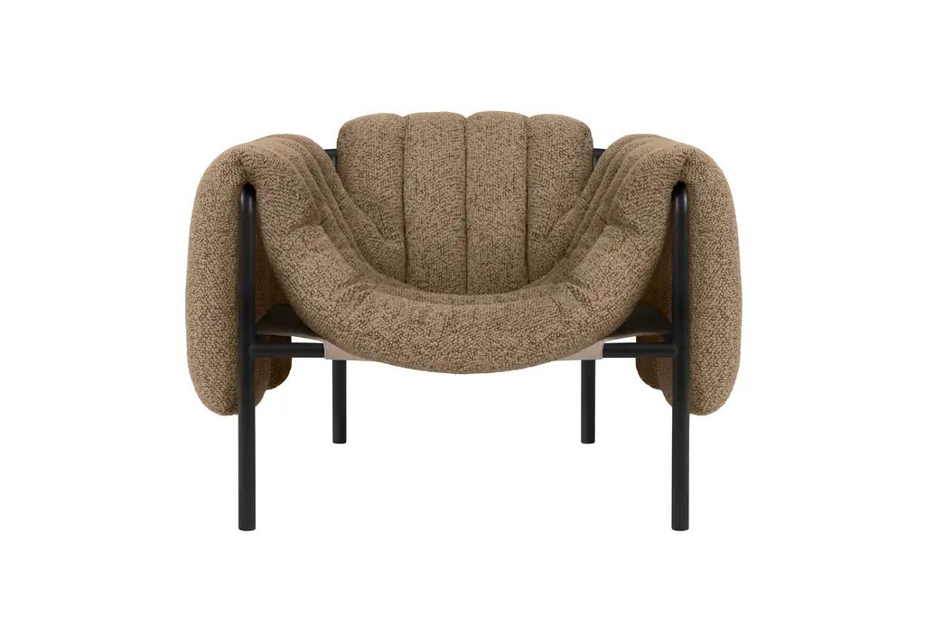 The detachable upholstery of the Puffy Lounge Chair is fat and plump, its generous shape spills freely over the sides of a tubular steel frame which, in stark contrast, is hard-lined and strong. The two key elements of this seating design by Faye Toogood are in purposeful and playful juxtaposition. The elementary frame is inspired by the rational structure of classic modernist design, whilst the extravagant quilt-like upholstery warmly embraces and envelopes, is comforting and reassuring. The Puffy Chair frame is available in powder-coated or sand-blasted steel finishes and a choice of thick canvas, chunky bouclé or luxurious leather upholstery.