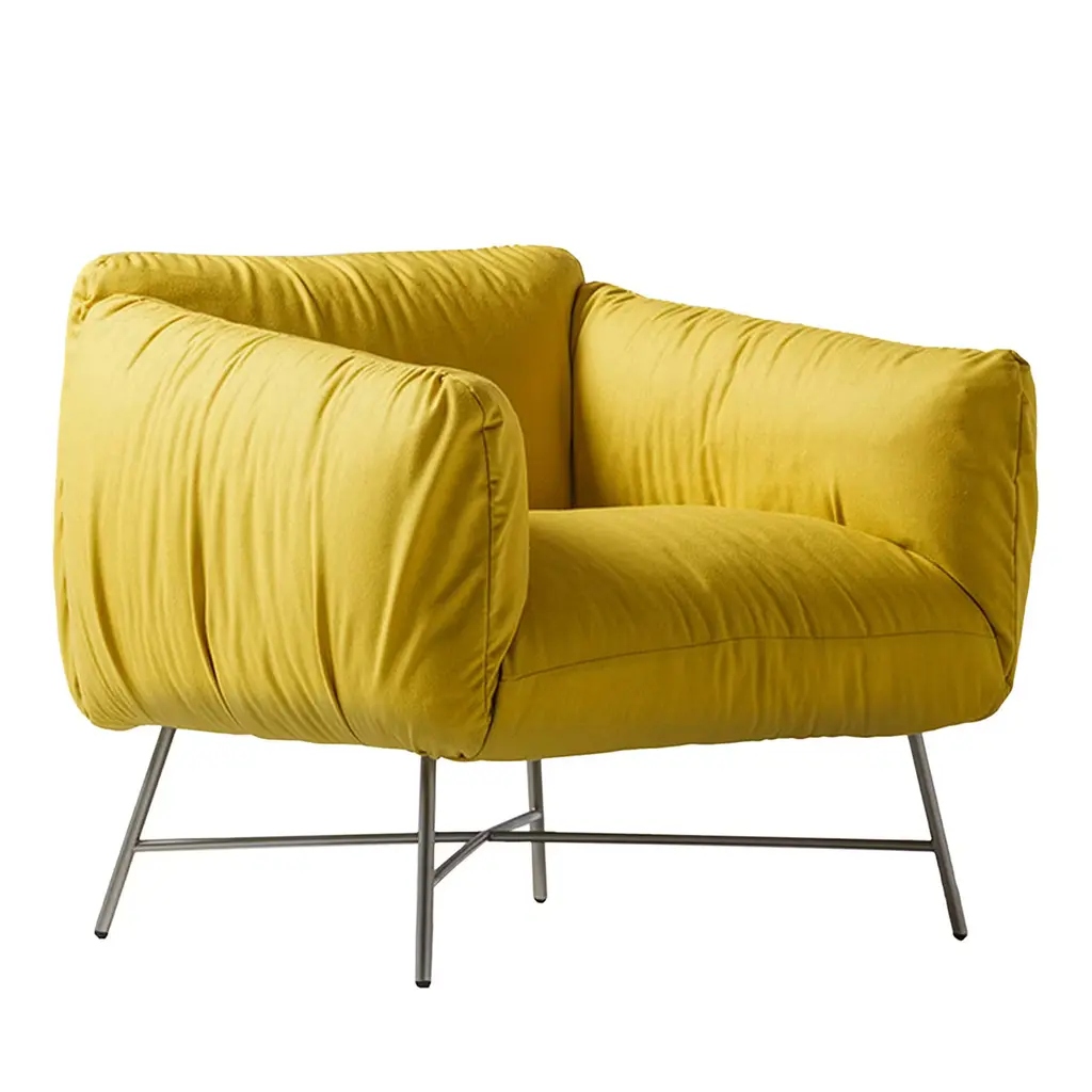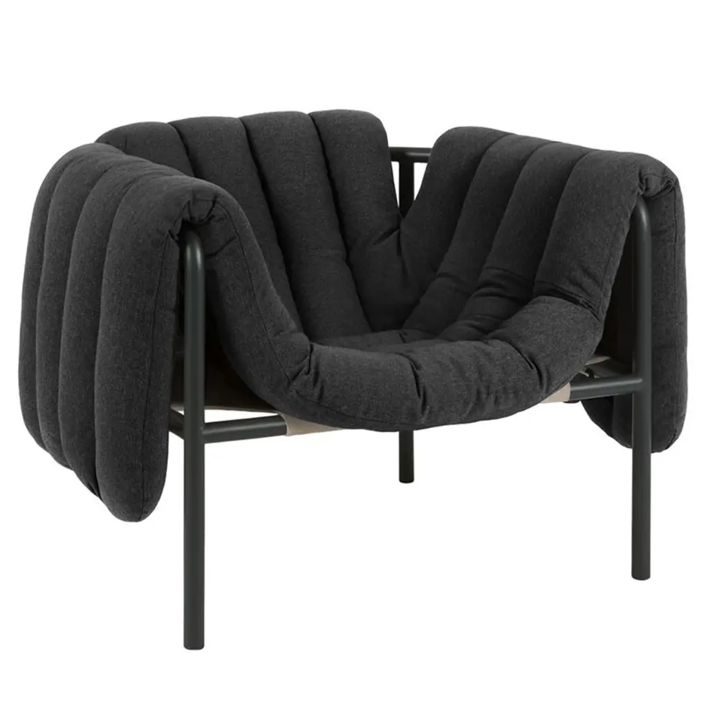 The detachable upholstery of the Puffy Lounge Chair is fat and plump, its generous shape spills freely over the sides of a tubular steel frame which, in stark contrast, is hard-lined and strong. The two key elements of this seating design by Faye Toogood are in purposeful and playful juxtaposition. The elementary frame is inspired by the rational structure of classic modernist design, whilst the extravagant quilt-like upholstery warmly embraces and envelopes, is comforting and reassuring. The Puffy Chair frame is available in powder-coated or sand-blasted steel finishes and a choice of thick canvas, chunky bouclé or luxurious leather upholstery.