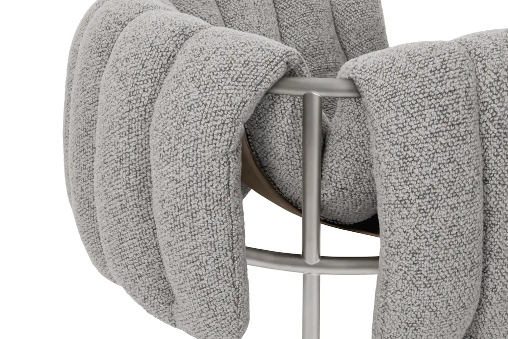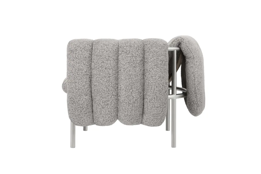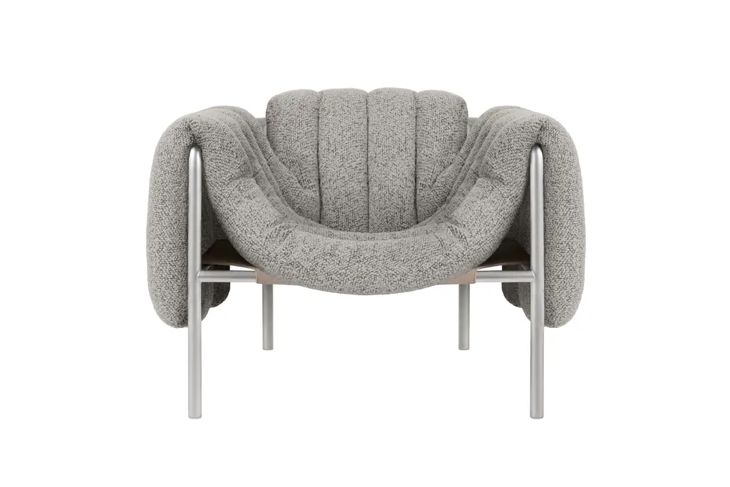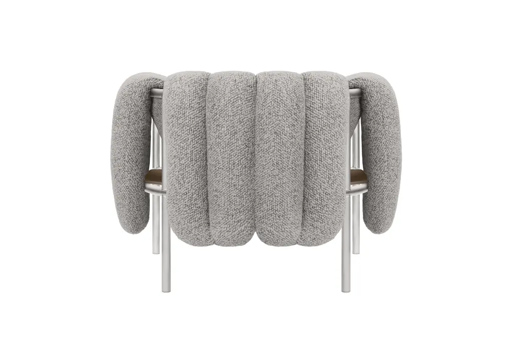The detachable upholstery of the Puffy Lounge Chair is fat and plump, its generous shape spills freely over the sides of a tubular steel frame which, in stark contrast, is hard-lined and strong. The two key elements of this seating design by Faye Toogood are in purposeful and playful juxtaposition. The elementary frame is inspired by the rational structure of classic modernist design, whilst the extravagant quilt-like upholstery warmly embraces and envelopes, is comforting and reassuring. The Puffy Chair frame is available in powder-coated or sand-blasted steel finishes and a choice of thick canvas, chunky bouclé or luxurious leather upholstery.