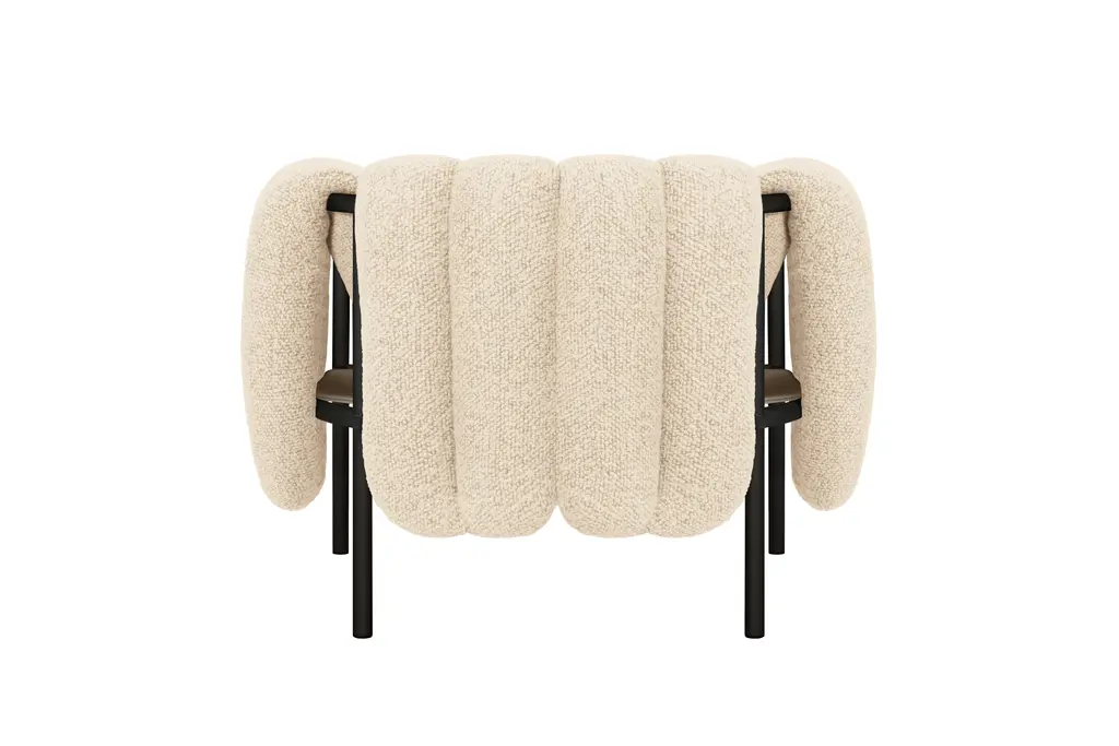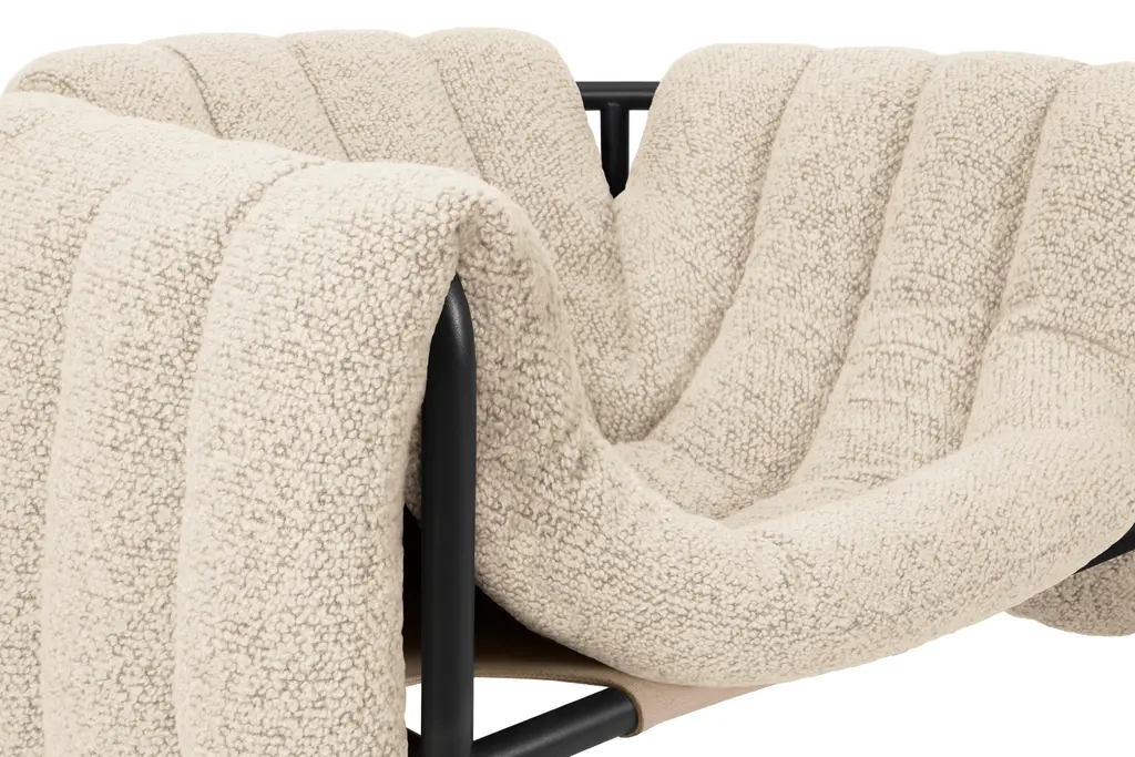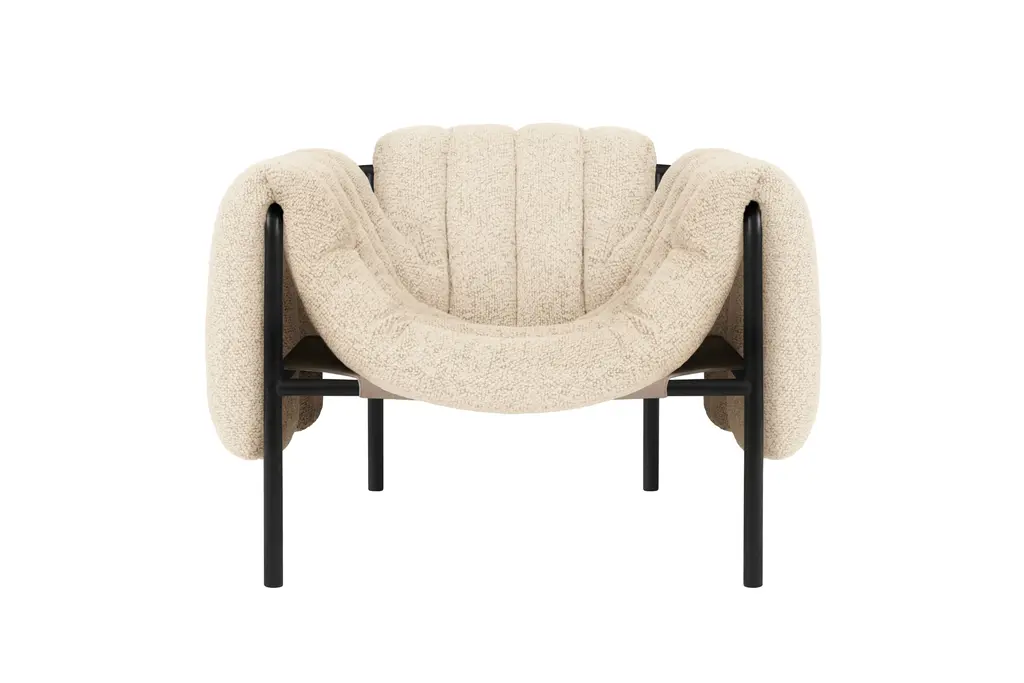 The detachable upholstery of the Puffy Lounge Chair is fat and plump, its generous shape spills freely over the sides of a tubular steel frame which, in stark contrast, is hard-lined and strong. The two key elements of this seating design by Faye Toogood are in purposeful and playful juxtaposition. The elementary frame is inspired by the rational structure of classic modernist design, whilst the extravagant quilt-like upholstery warmly embraces and envelopes, is comforting and reassuring. The Puffy Chair frame is available in powder-coated or sand-blasted steel finishes and a choice of thick canvas, chunky bouclé or luxurious leather upholstery.
