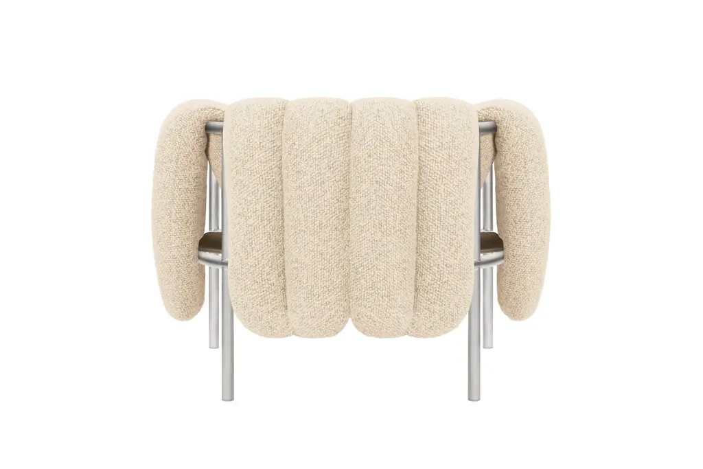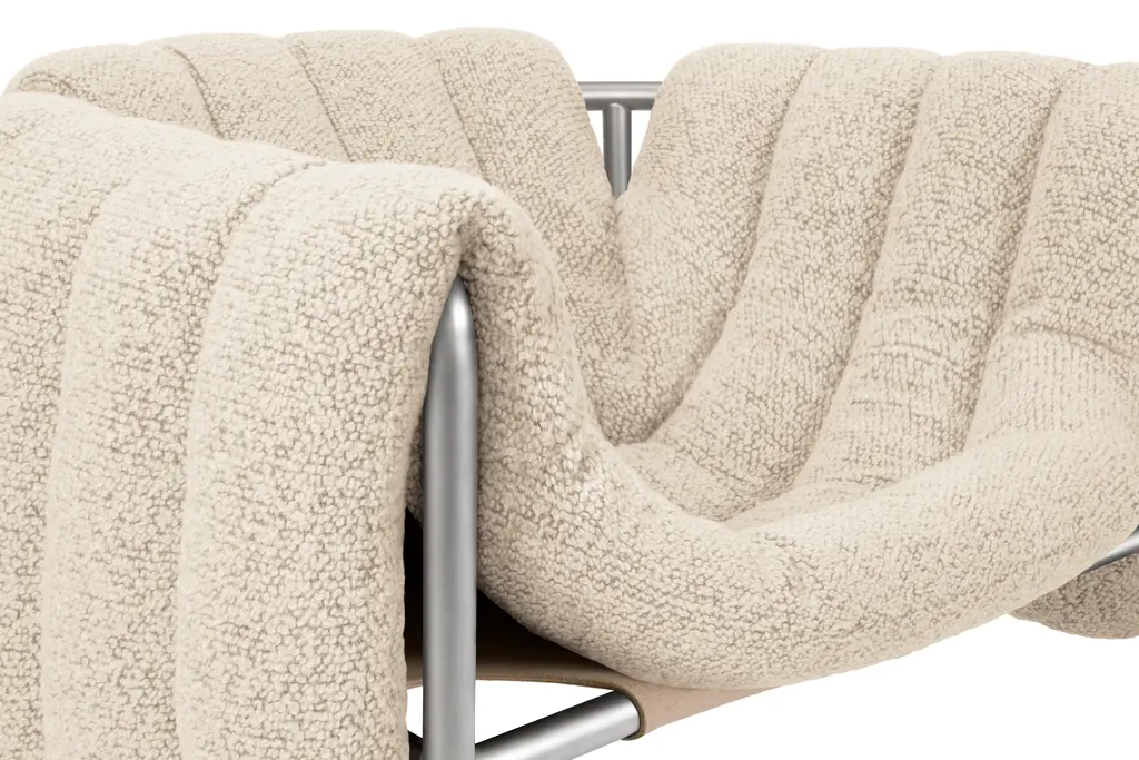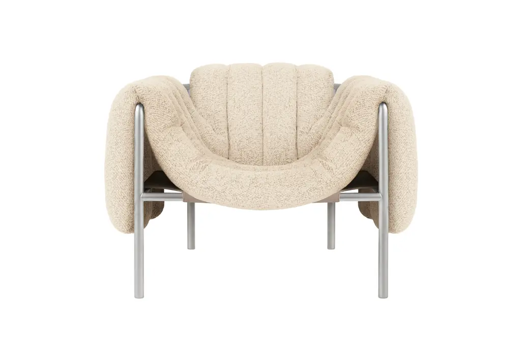 The detachable upholstery of the Puffy Lounge Chair is fat and plump, its generous shape spills freely over the sides of a tubular steel frame which, in stark contrast, is hard-lined and strong. The two key elements of this seating design by Faye Toogood are in purposeful and playful juxtaposition. The elementary frame is inspired by the rational structure of classic modernist design, whilst the extravagant quilt-like upholstery warmly embraces and envelopes, is comforting and reassuring. The Puffy Chair frame is available in powder-coated or sand-blasted steel finishes and a choice of thick canvas, chunky bouclé or luxurious leather upholstery.
