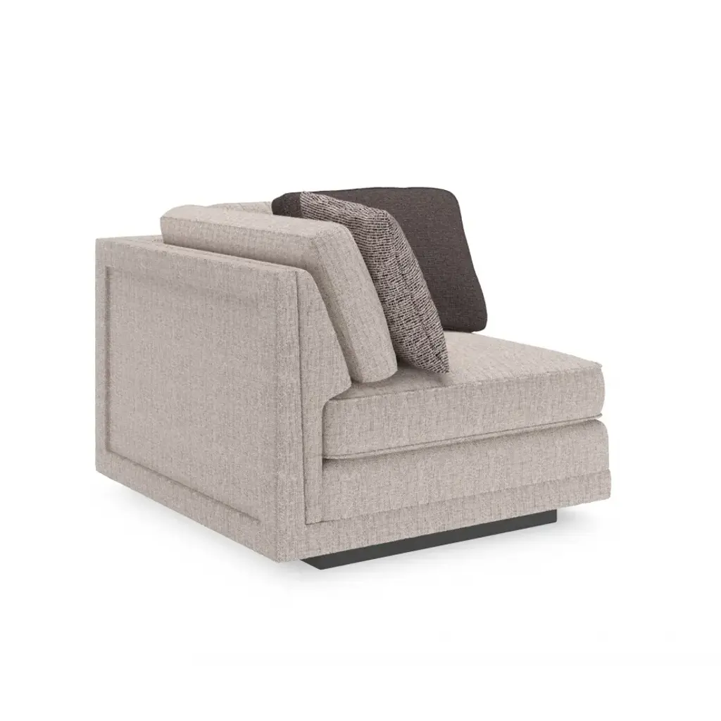 Dimensions: H: 28 1 ⁄ 2” L: 37 3 ⁄ 8” D: 39 3 ⁄ 8” H: seat 14 15 ⁄ 16”A collection of sofas and armchairs with geometric lines, some with generously-proportioned armrests and others with a more slender style, rounded off with essential benches and poufs. This gives rise to a wide range of solutions: from the two- or three-seater sofa or the single or double sofa bed to linear and corner compositions. The structure consists of a wooden frame covered with non-deforming, expanded polyurethane padding of different thicknesses and polyester fibres, with goose feather cushions on the back and seat. The cushions also feature an expanded polyurethane padding insert of variable density. Lacquered wood or aluminium feet with a polished or opaque finish. The upholstery comes in removable fabric or nonremovable leather.