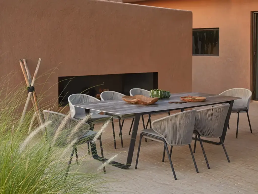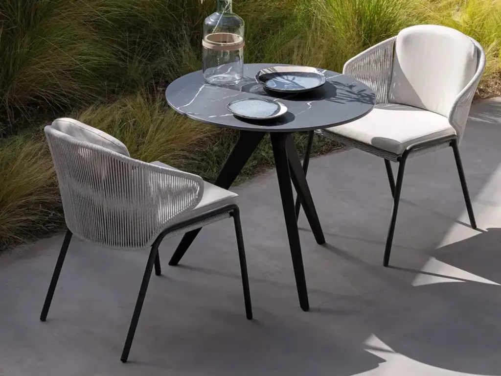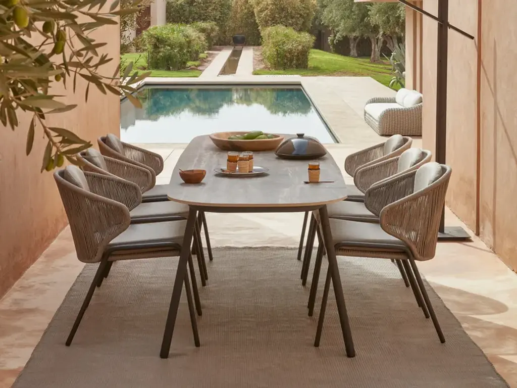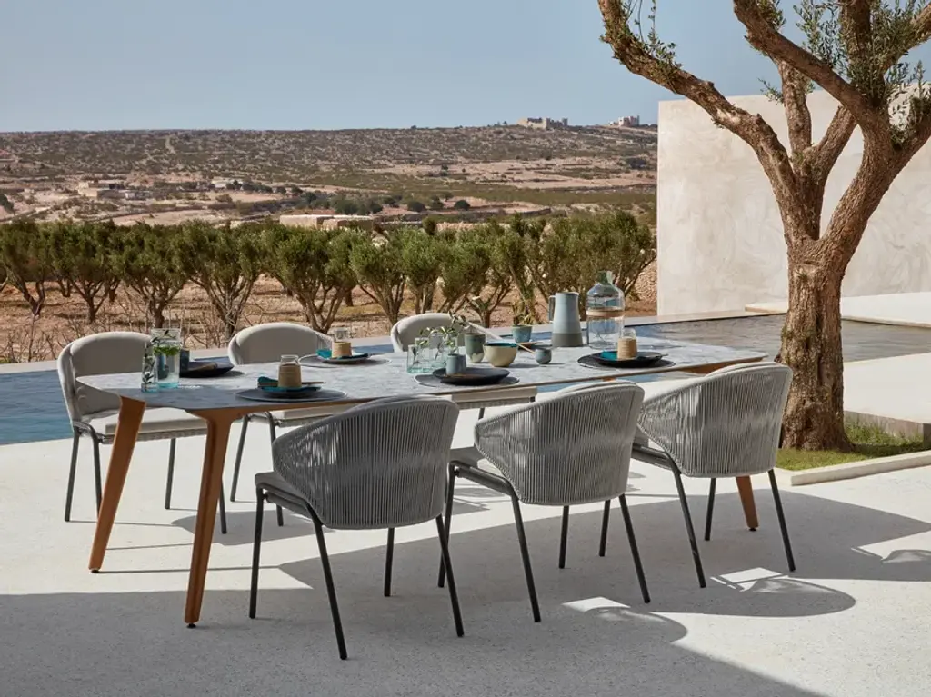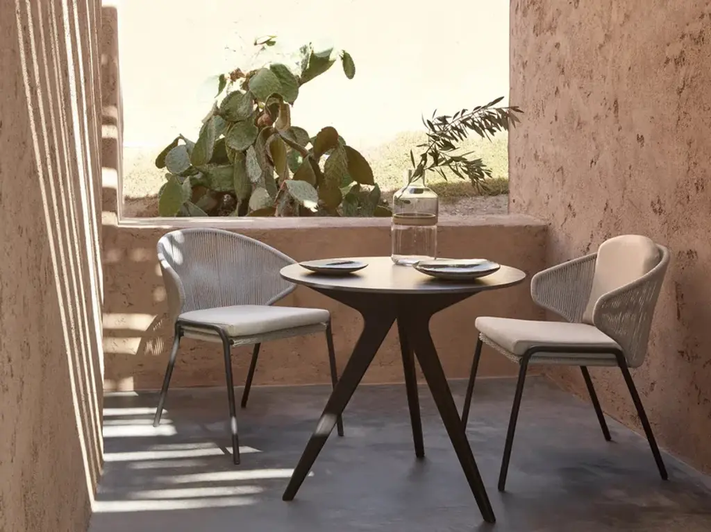 The Radius chair certainly makes an impression with its wrap-around backrest that also integrates the armrests. Made entirely of rope, its neomodern style is timeless. An optional backrest cushion offers optimal comfort for long get-togethers. Another striking feature, Radius chairs are ultra-lightweight.The unique, airy design of the RADOC chair, footstool, lounge chair and sofa collection is perfect for exquisite moments of warmth and closeness. The wrap-around back and armrests, made entirely out of rope, blend seamlessly and give each piece a neomodern yet timeless look and feel. Keep it sober or opt for matching backrest cushions designed for optimal seating comfort for long get-togethers.