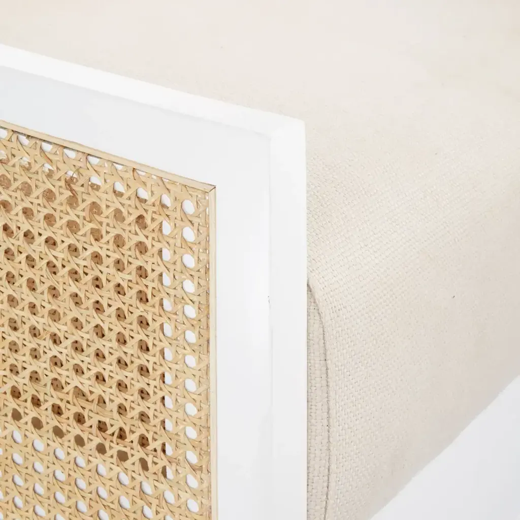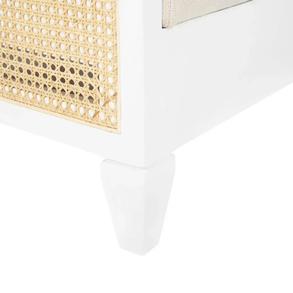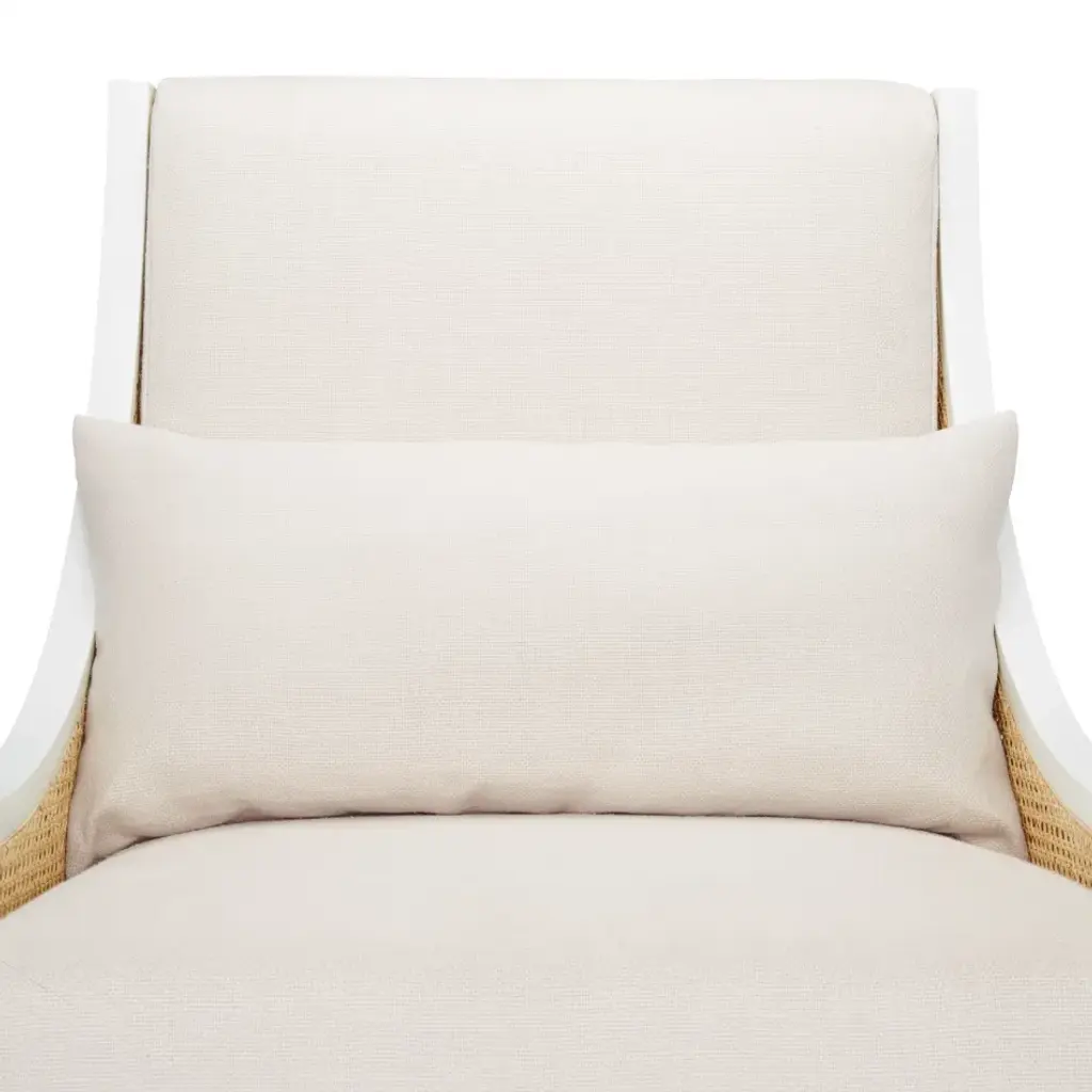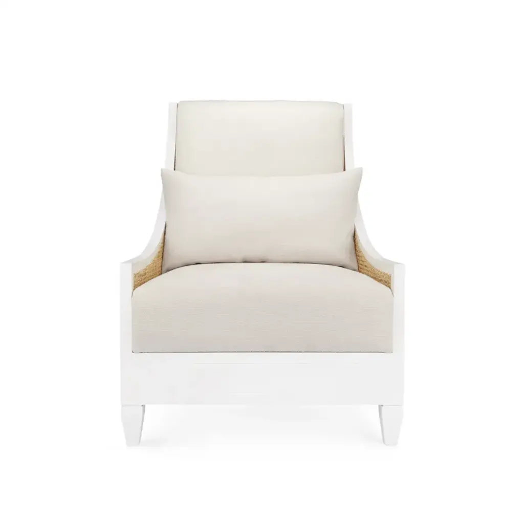 With classic profiles and light, natural materials, our Raleigh Collection embraces old school charm—with a few upscale updates, of course. Bring the vacation vibes home with our Raleigh Club Chair, a modern, resort-inspired evolution of a French favorite. Its robust silhouette recalls the Bergères chair in the Louis XV style, though our masterful craftsmen have reimagined it to achieve a relaxed and refined aura that feels more laid-back. Fashioned from mahogany with a modern white lacquered finish, the gracefully sloping framework provides arm support with the look of ultimate elegance. Artisanally hand-tied caning has been applied to its back and sides, lending the Raleigh a luxuriously organic look fit for a modern farmhouse or breezy beach home. It’s topped with drop-in linen upholstery for chic comfort and cool neutrality. Whether posed as an accent in a sitting room or set in a pair in an indoor-outdoor space, the Raleigh provides a plush seat with regal ambitions.