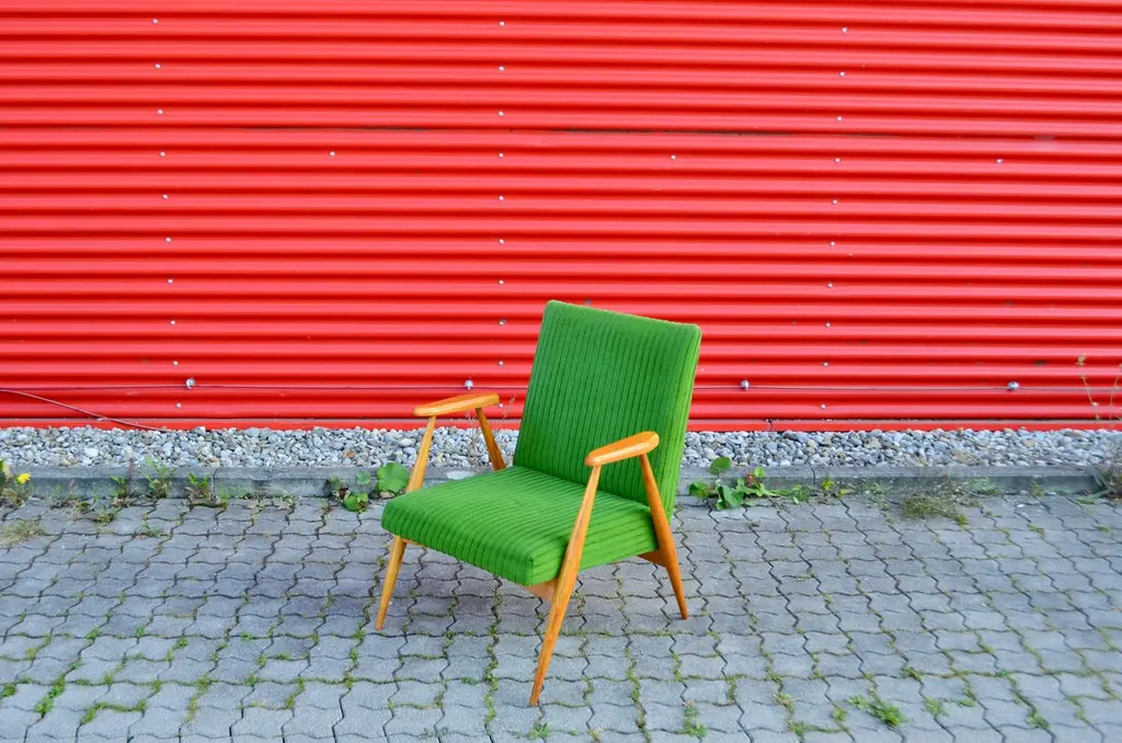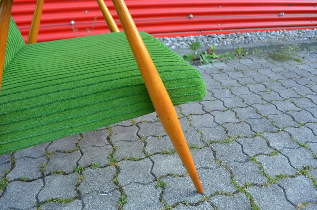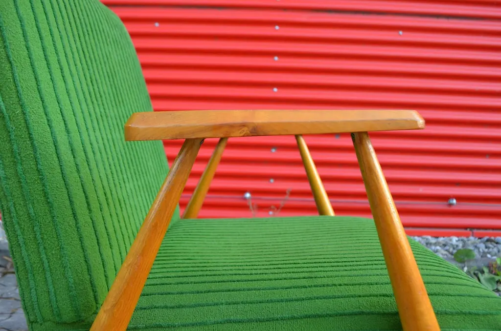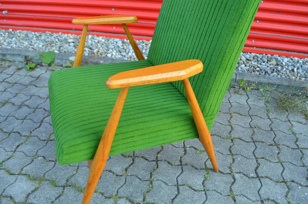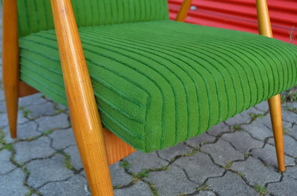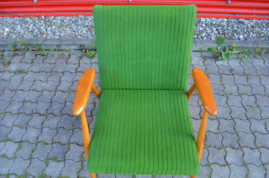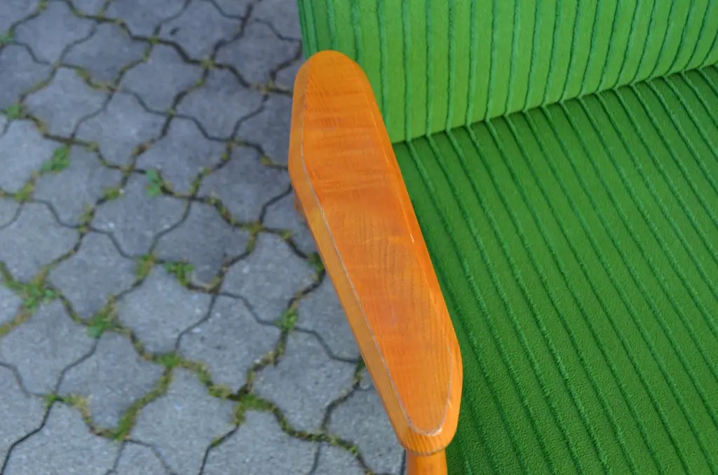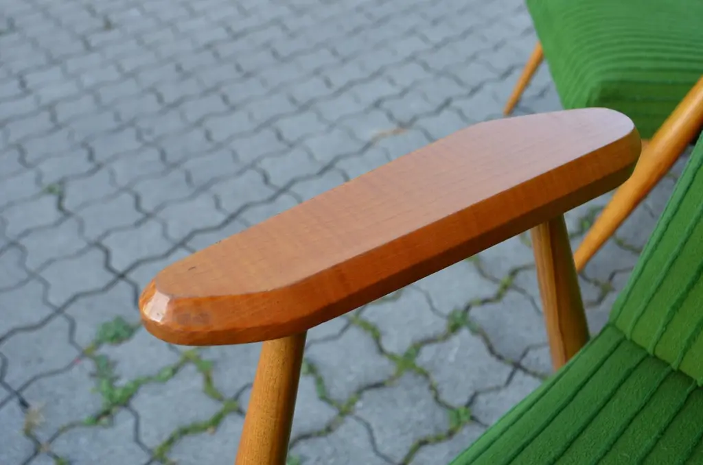 These rare and stunning Mid century Modern Easy chairs comes from Czech /Prague.The designer and producer is still unknown.The frame is made from elmwood and the sculptural armrests has references to the Czech Kubism.As you can see that the thin legs are only strong in the joints when it needs.The beautiful green velour fabric is still original.A truly masterpiece of Czech midcentury design and very rare and hard to find.We have 3 armchairs in stockPrice per item.
