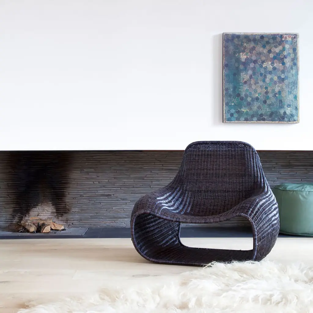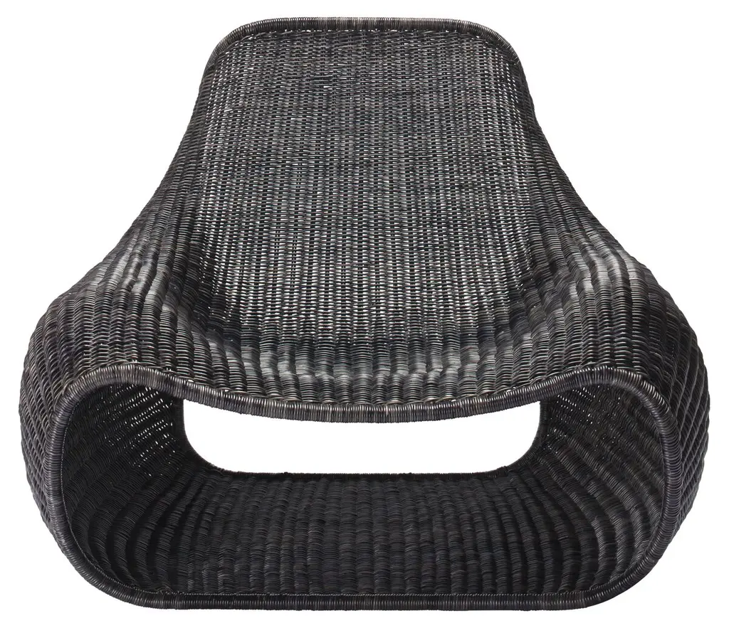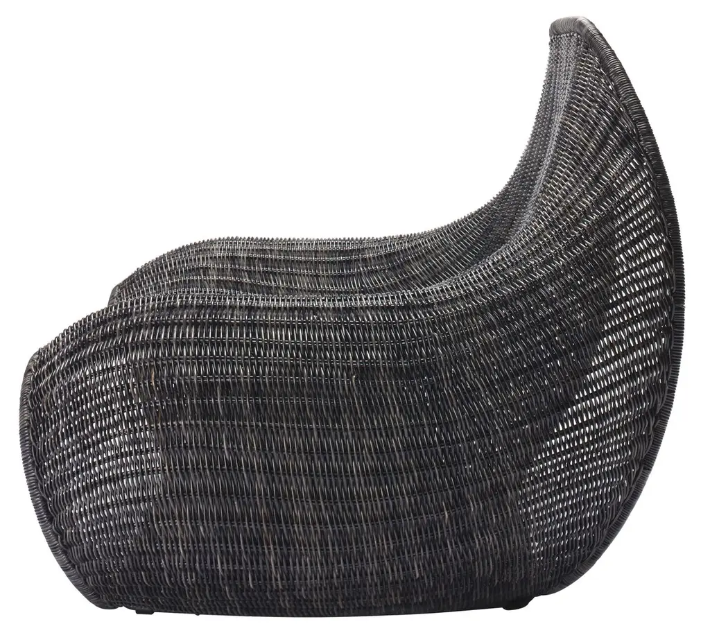 The casual, comfy curves of beanbag cushions inspired this low-slung chair. The steel frame is covered with woven rattan that includes a protective outer layer for added durability.