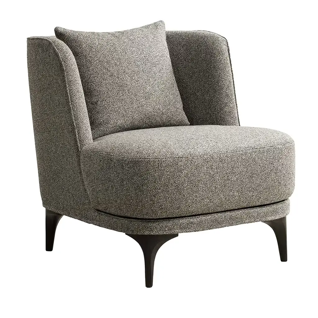 Relax small lounge chair, made of an internal wooden structure, polyurethane padding in different densities, and solid wood feet in Canaletto walnut tone. Also available in dark Tay shade. Upholstery is available in various fabrics, leather, and Nabuk.