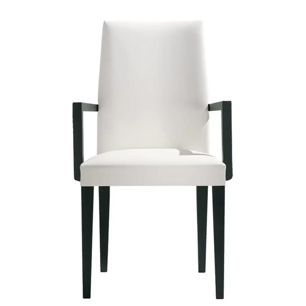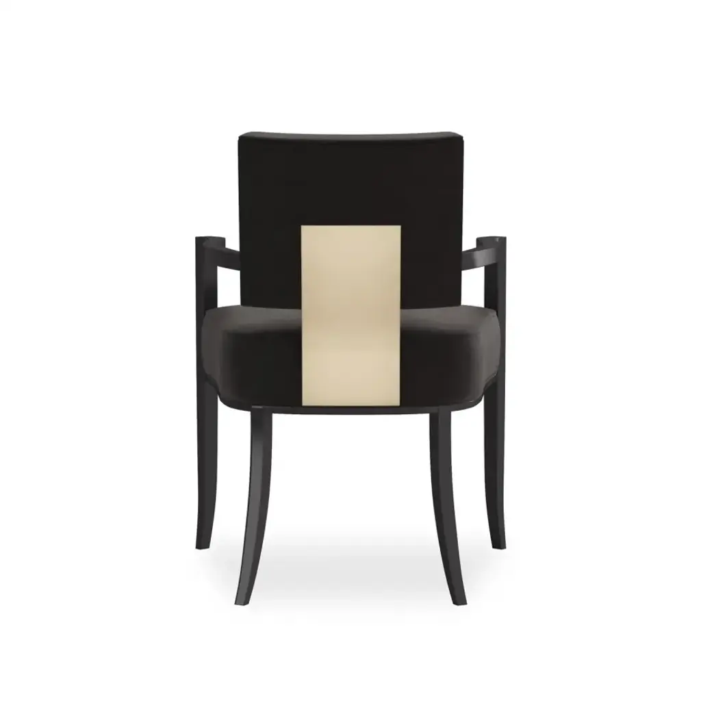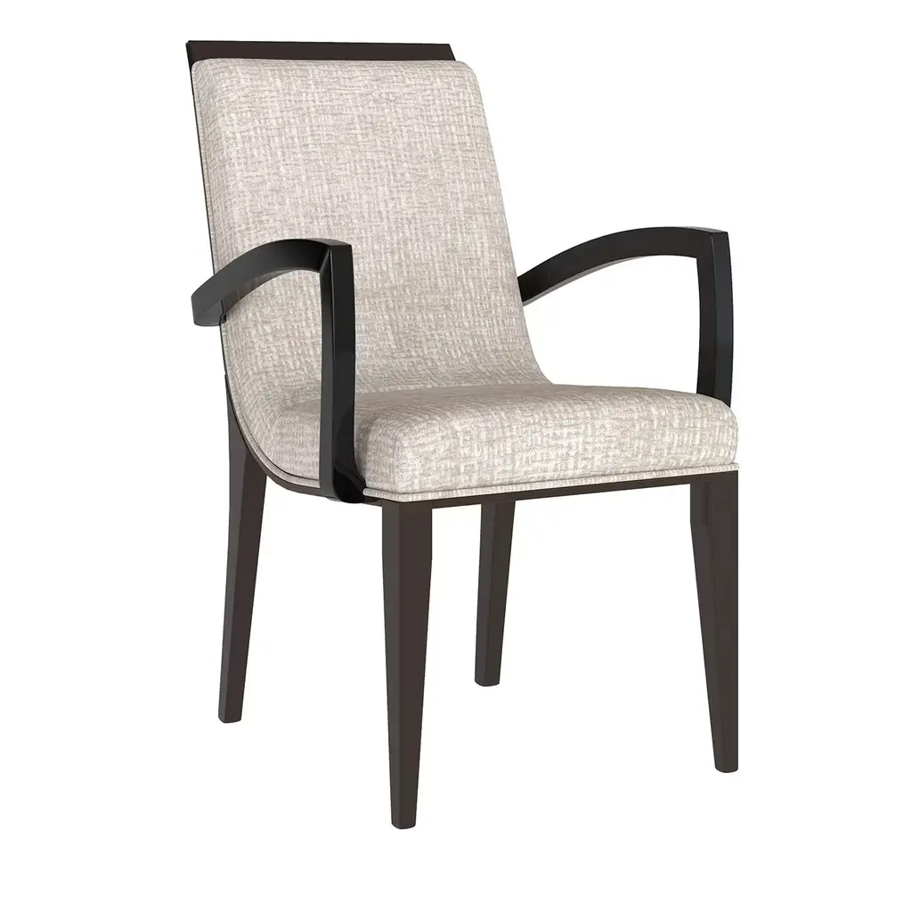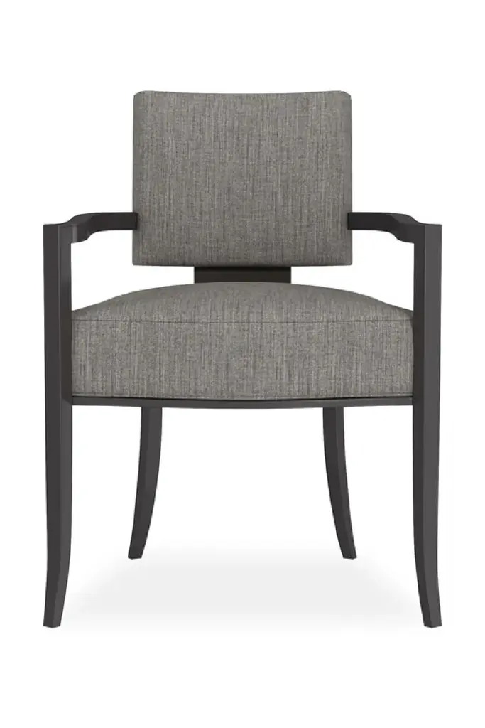 This contemporary arm chair takes on dramatic style when you view the wide, Whisper of Gold panel that shines off its back. Neutral fabric fully surrounds the square upper back and seat cushion that rest on an exposed wood frame, sabre legs and gracefully curving arms finished in Seal Skin. This is a low, klismos chair with truly polished appeal.