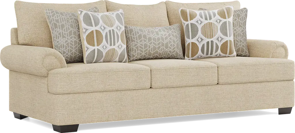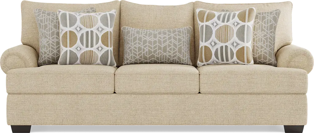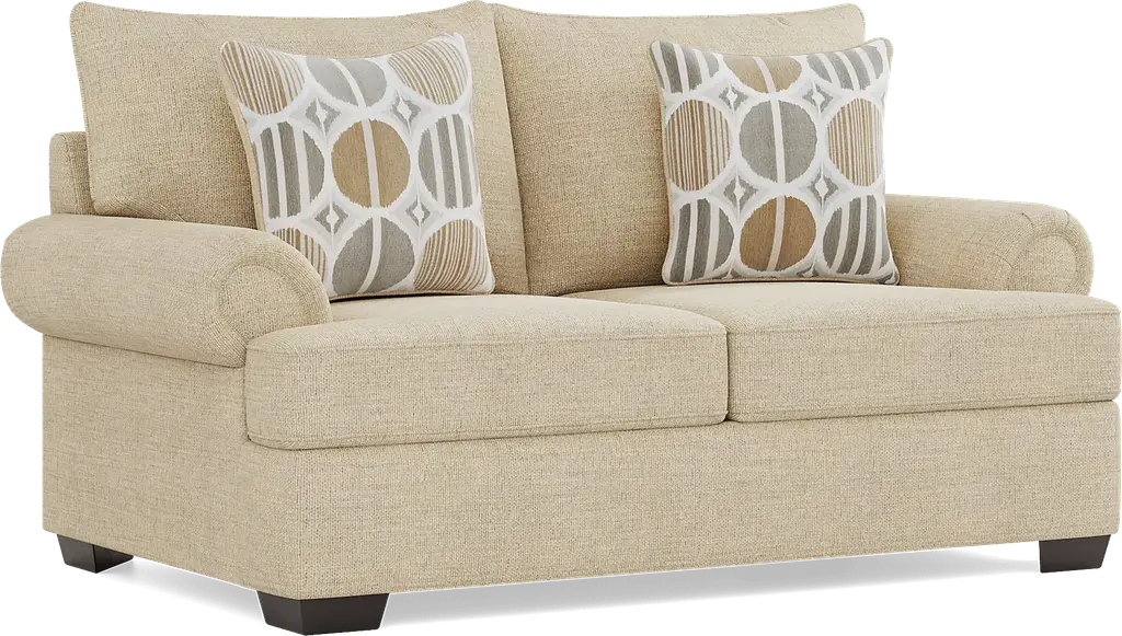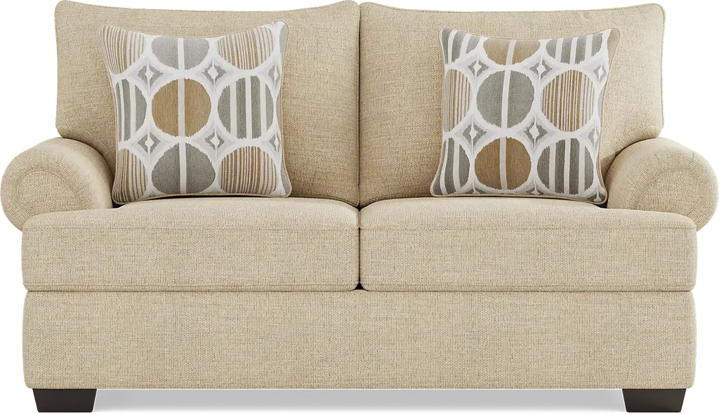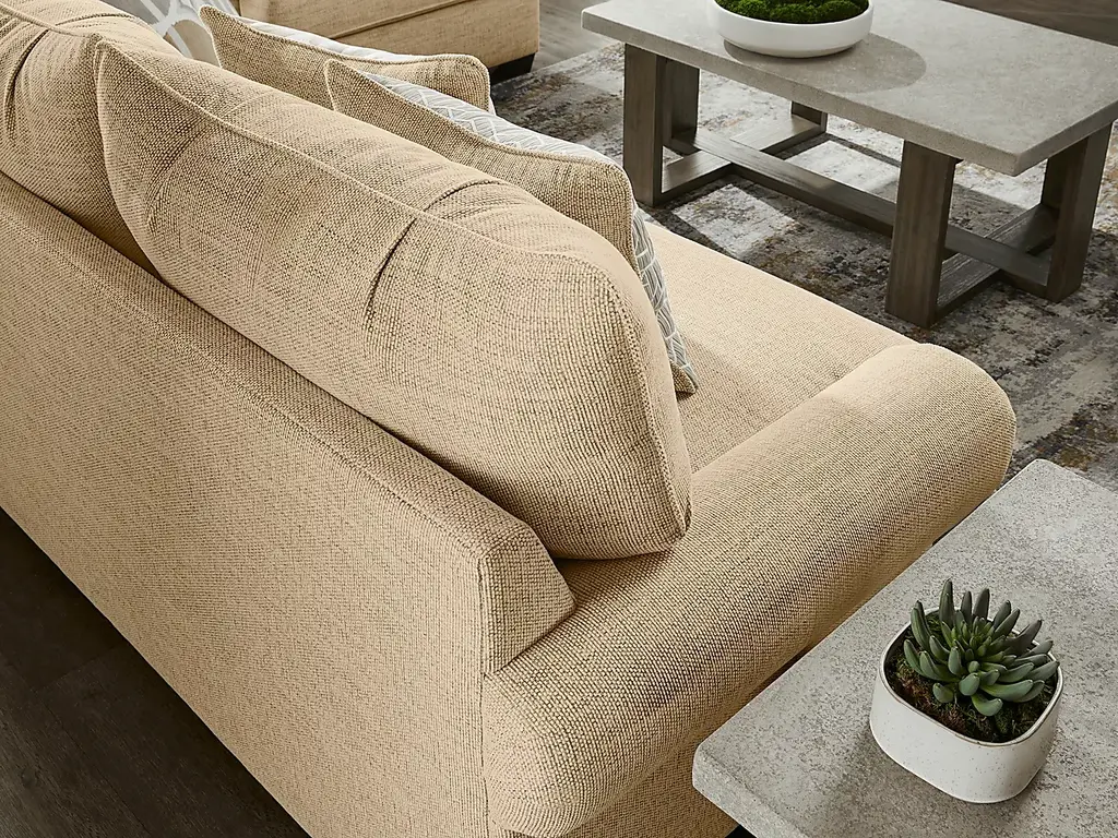Bright neutral tones trace soft shapes and angles to highlight the Reyna Point living room's elegant, easygoing charm. This contemporary collection's tan colored woven fabric offers a substantial and comforting feel. The subtle wedge-shaped back and reversible back cushion on each seat ensures the ideal angle and support for maximum comfort, inviting guests to relax into the deep seats. Adjusting positions is easy with convenient roll arms to either side, and welted seams on each cushion provide subtle visual poise throughout the room. Upholstery: 100% Polyester. Cleaning Instructions: Use water-based cleaning agents or foam. Tables and lamps not as shown in room image.