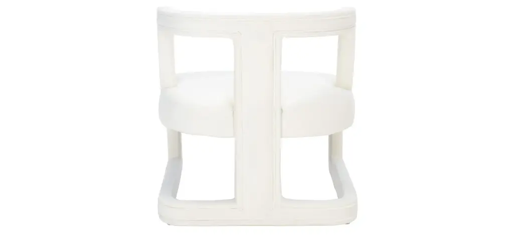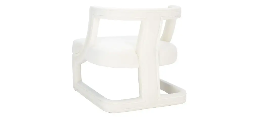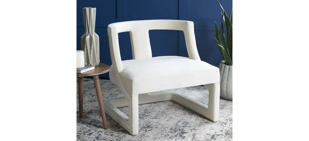 A must-have statement piece for today's fashion-forward d_cor, this Rhyes Accent Chair is absolutely striking. Rhyes takes inspiration from architectural modern sculpture, flaunting its artistic prowess and striking sense of depth with its intriguing open frame fully upholstered in luxurious cream velvet.