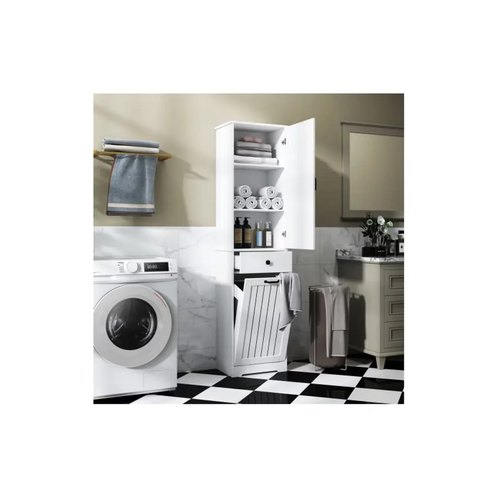This laundry cabinet features storage functionality, with a top shelf for storing towels, clothing, and toiletries, a middle drawer for small items like toothpaste and toothbrushes, and a laundry basket for dirty clothes.