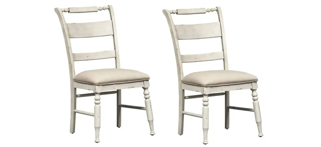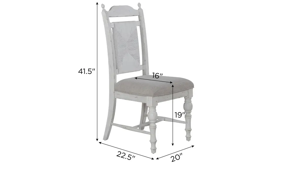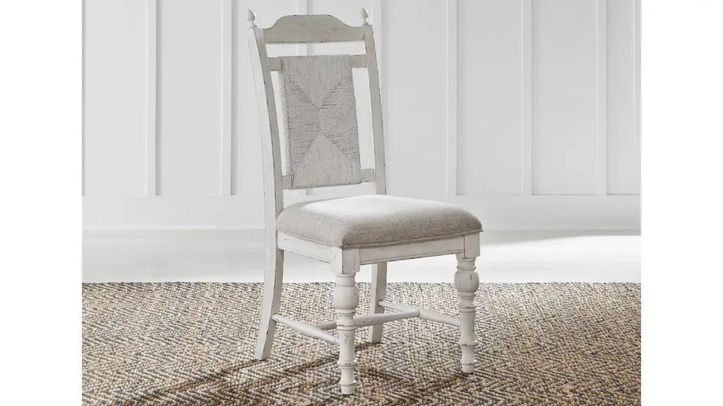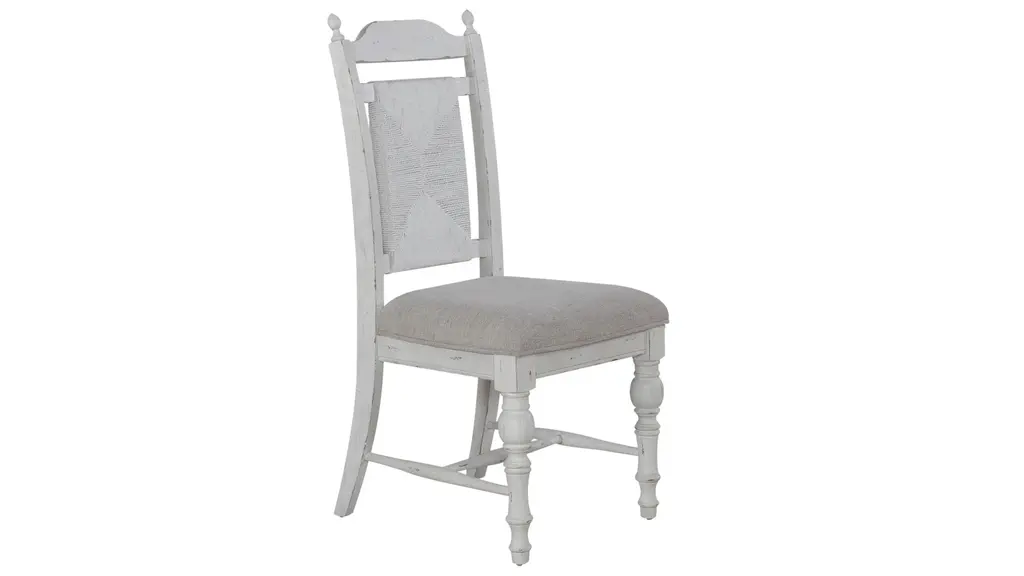 The River Place side chair strikes the perfect balance of life on the coast and a comfy home tucked away in the hills. Crafted with Pine solids, this chair features a Riverstone White finish. It has a woven weave panel back and a padded seat upholstered in a Textured Linen fabric. The cap rail has a softly shaped arched and finial accents. The heavy round turned legs feature nylon chair glides to protect your flooring. The River Place collection creates an inviting airy atmosphere in your home while providing comfort in your own private getaway.