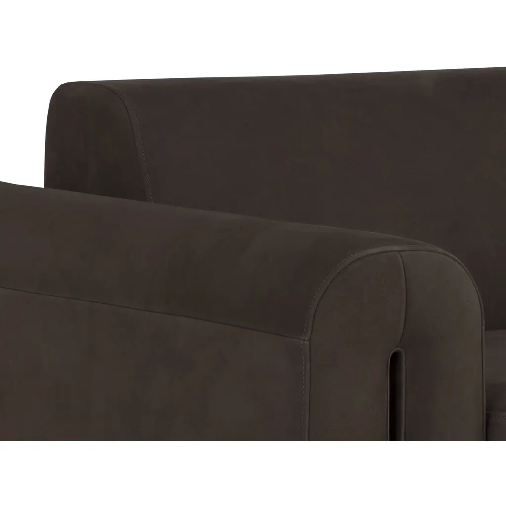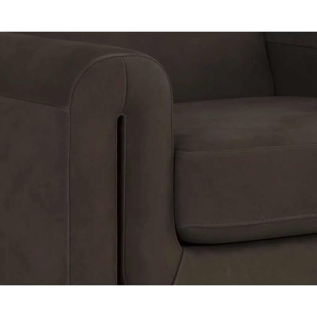 Cozy and luxuriously smooth, the Romer Armchair brings a sense of warmth and comfort to any living area. Expertly designed with sculpted curves that lend a modern aesthetic. Upholstered in nubuck cocoa leather with metal accents on the legs. Handle with Care: This design has been crafted with 100% leather. Leather is a natural material as such, colour variations, markings, wrinkles, grooves and light scratches are acceptable and appreciated characteristics. No two pieces are alike. Visit our Product Care page for more information on how to ensure the lasting beauty of this piece.