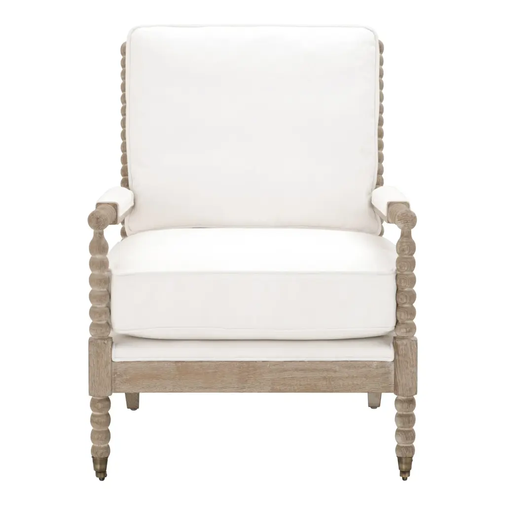 This charming club chair will elevate your living space with its transitional style and neutral tones. The chair frame is beautifully shaped with spool carvings for an eye-catching design. The seat and back cushions are reversible and detailed with welt edging, adding a soft and finished look to the seats. The seats are upholstered with a high-performance fabric that is easy to clean and very durable. Brass castors on the front feet and upholstered arm rests add traditional style to this transitional club chair. It will be the perfect finishing touch to many living room styles.