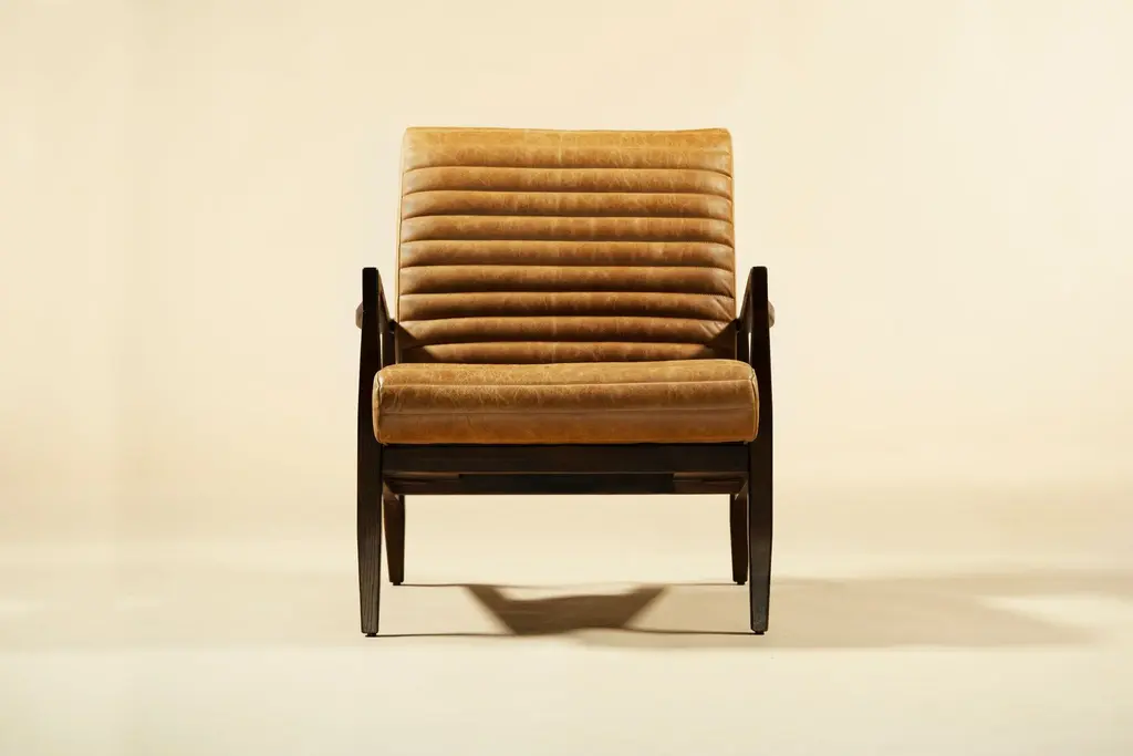 A signature piece for your stylish space, the Rowan Lounge Chair exudes modern luxury with unique ribbed seat texture and shapely frame. The solid ash wood frame is kiln-dried to prevent warping and features a rich walnut finish. It wraps around the high-density foam cushions, creating artful angles and curves from arms to tapered legs. It’s crafted with pure-aniline dyed leather (cognac tan) or semi-aniline dyed leather (other colors) upholstery, which is preferred globally for the hide’s natural markings and creases, plus its ability to take on scuffs, patinating nicely with use. This chic lounge chair promises to evolve along with your tastes over time.
