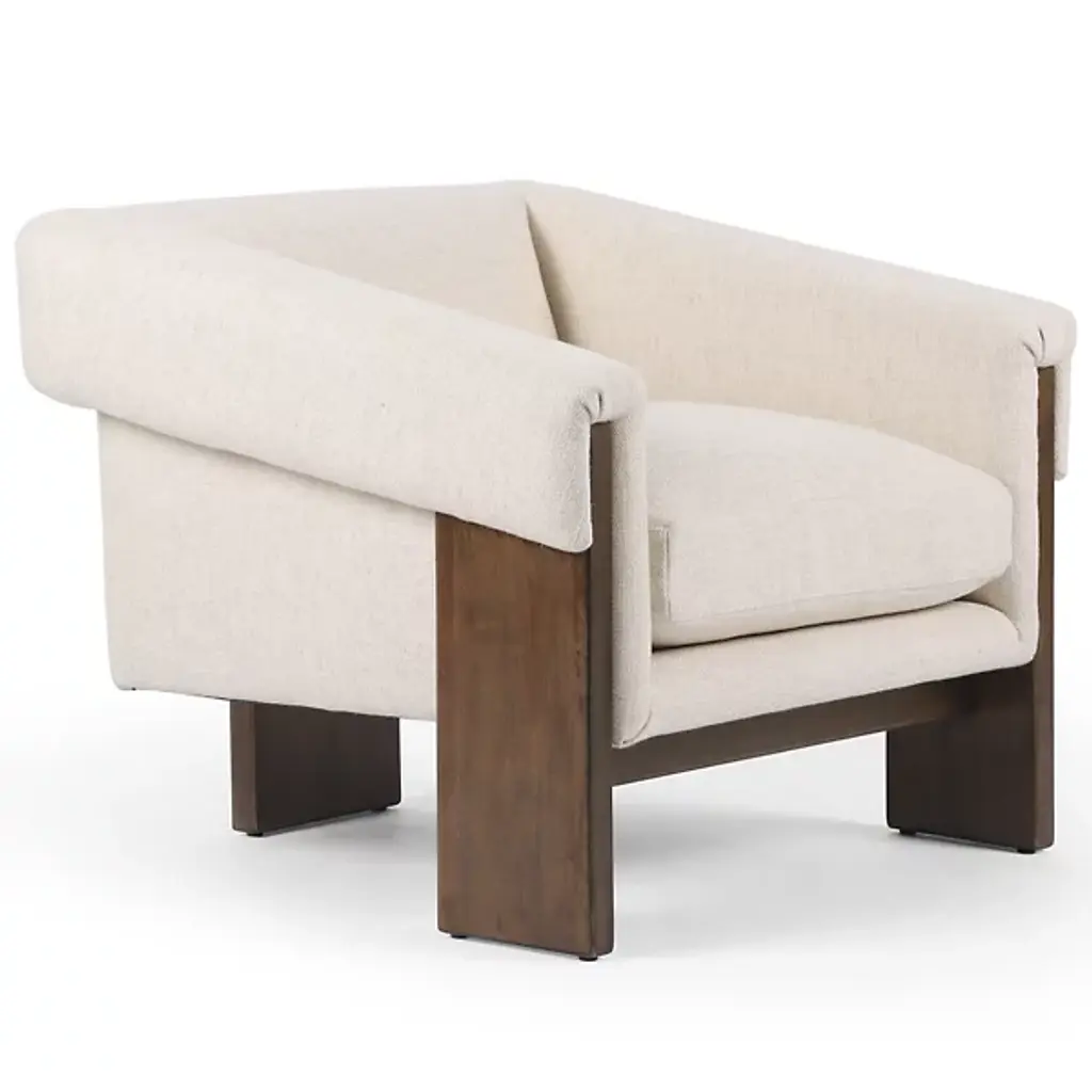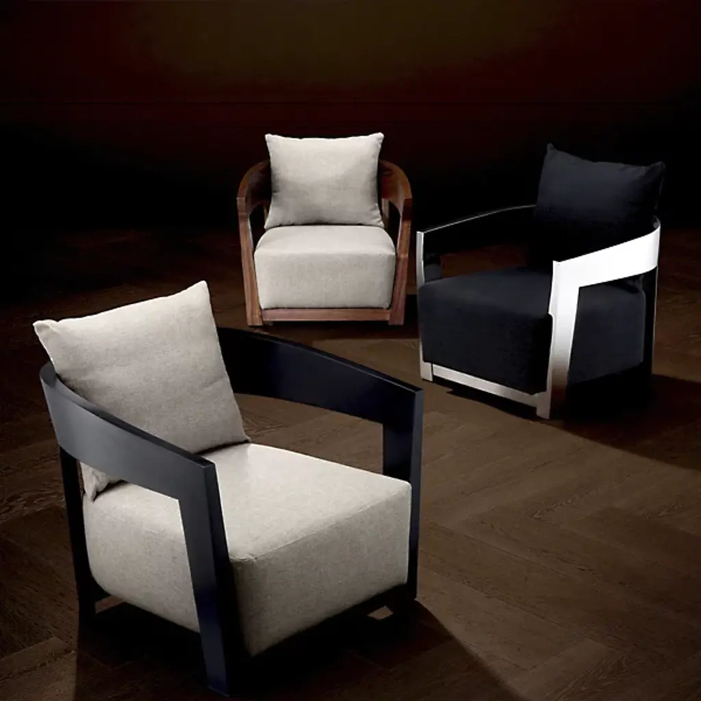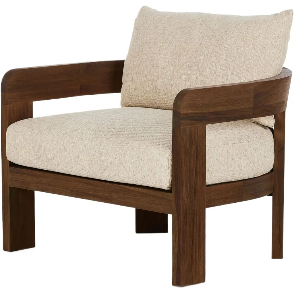 The Rubautelli Lounge Chair from Eichholtz envelops the body like a wide embrace. It conjures a smile with curvy shapes modeled after vintage modern designs. The wooden frame makes a sophisticated first impression through its clean, sweeping cuts. The long panels of the frame make it easy to appreciate its natural warm hues and intricate grain marks. This natural texture accentuates the clean comfort of the upholstered cushions nestled inside. With arms propped up, and back leaning, the cushions offer plump support for a true lounging experience.