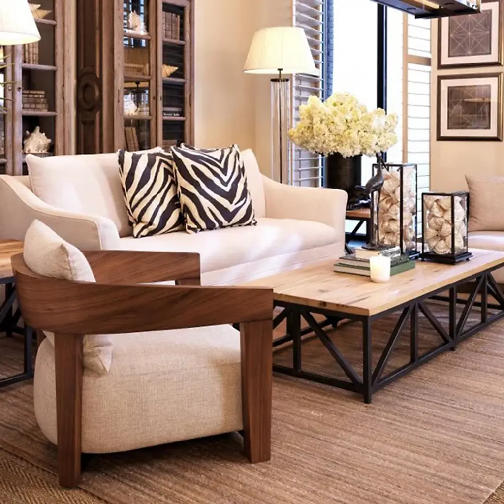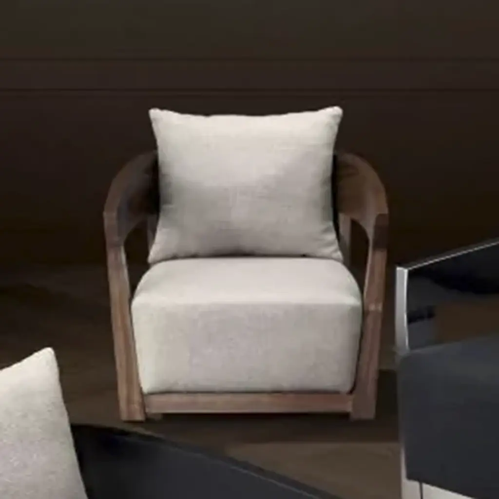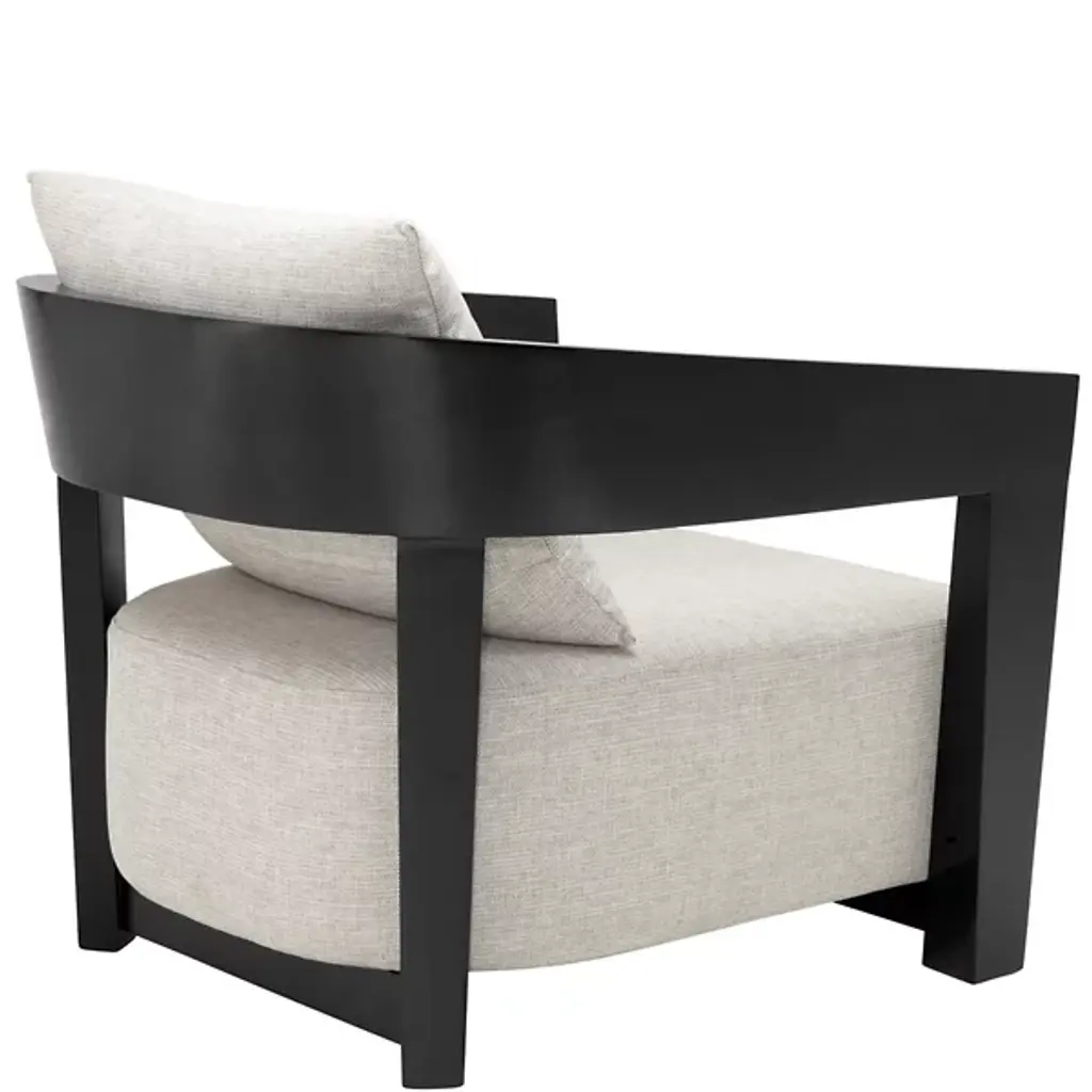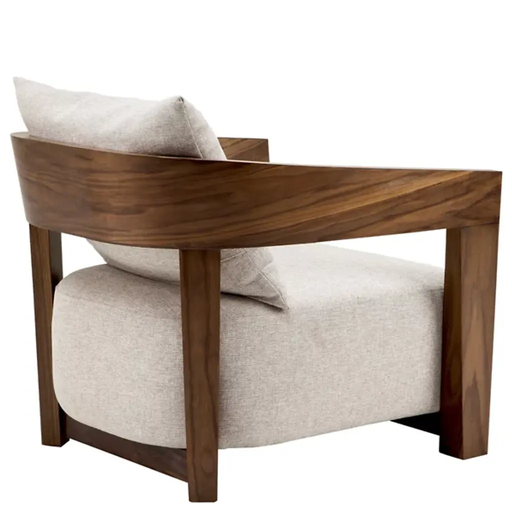 The Rubautelli Lounge Chair from Eichholtz envelops the body like a wide embrace. It conjures a smile with curvy shapes modeled after vintage modern designs. The wooden frame makes a sophisticated first impression through its clean, sweeping cuts. The long panels of the frame make it easy to appreciate its natural warm hues and intricate grain marks. This natural texture accentuates the clean comfort of the upholstered cushions nestled inside. With arms propped up, and back leaning, the cushions offer plump support for a true lounging experience.