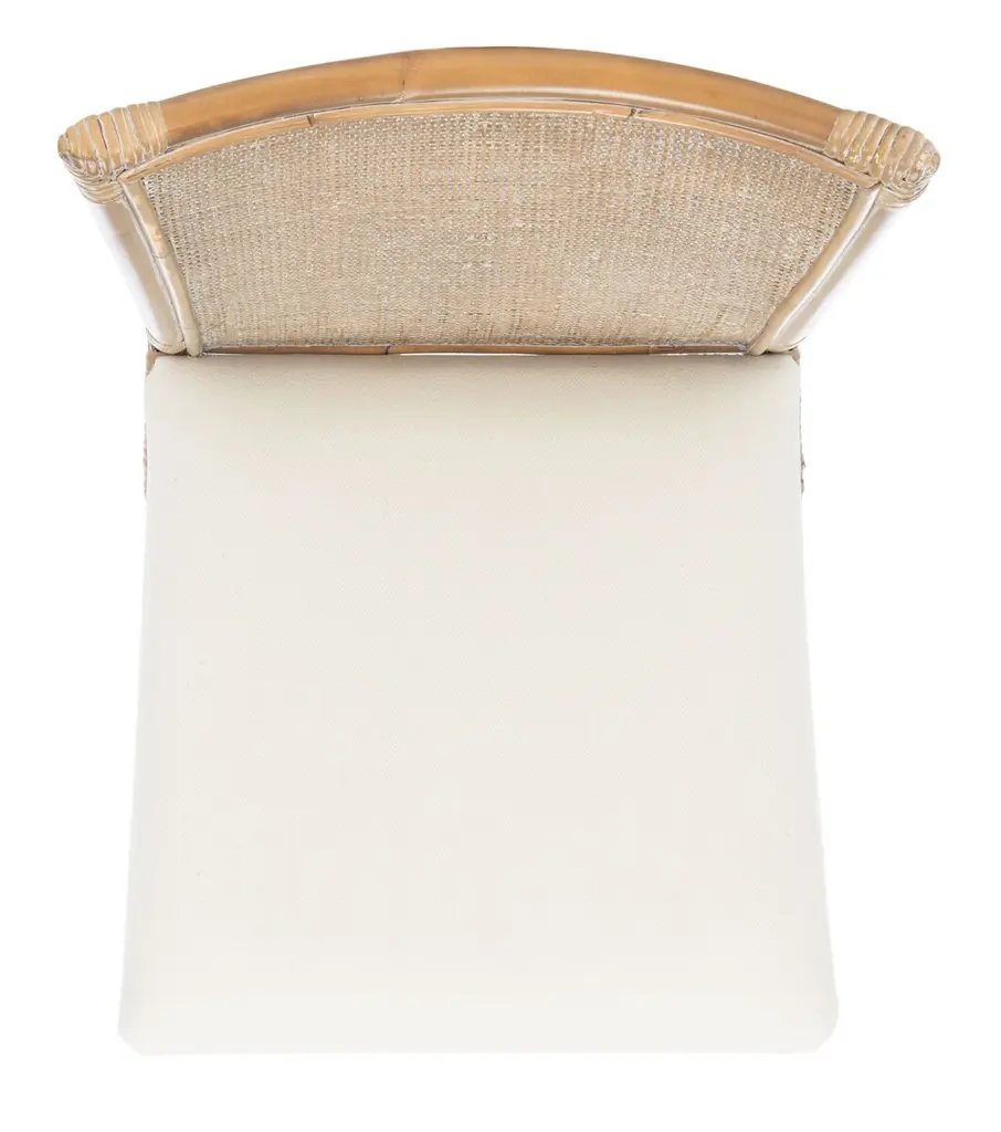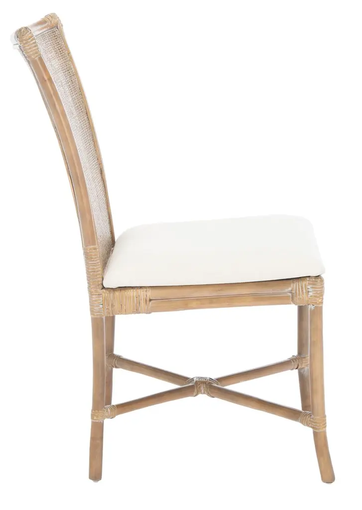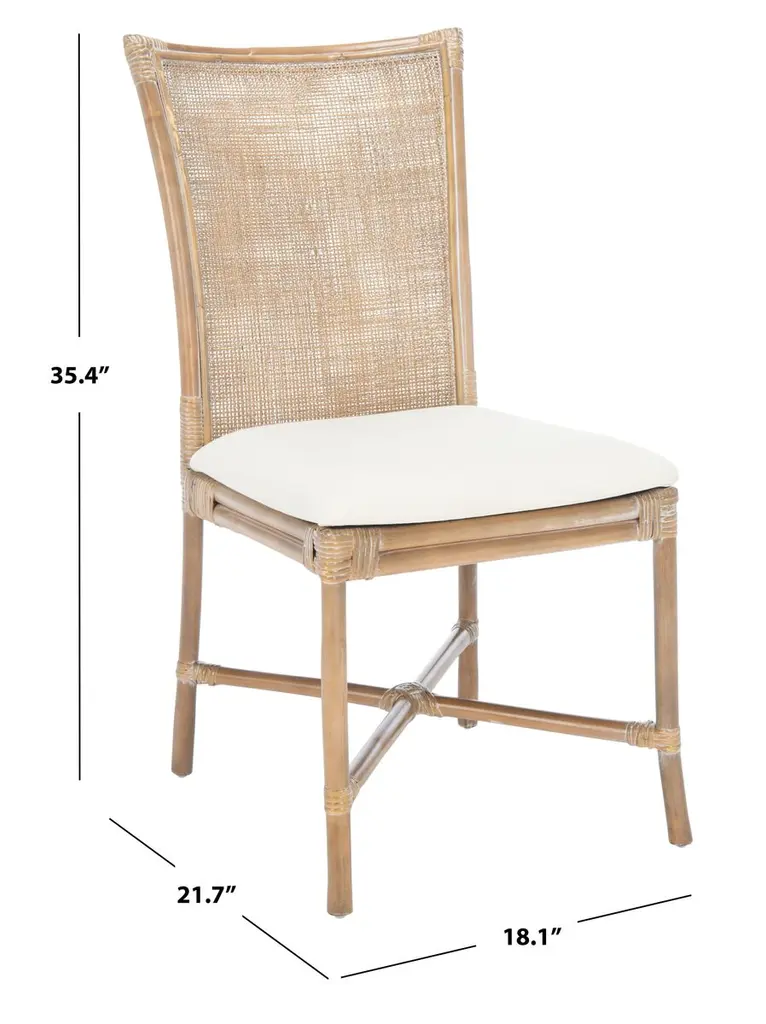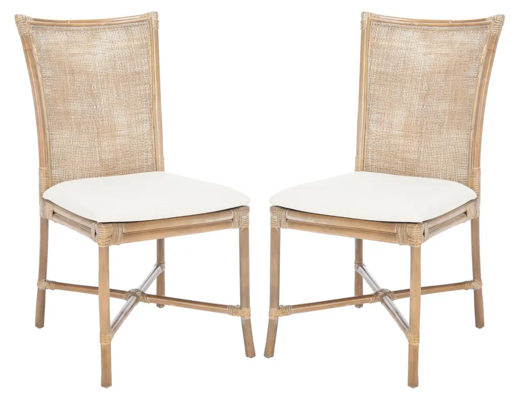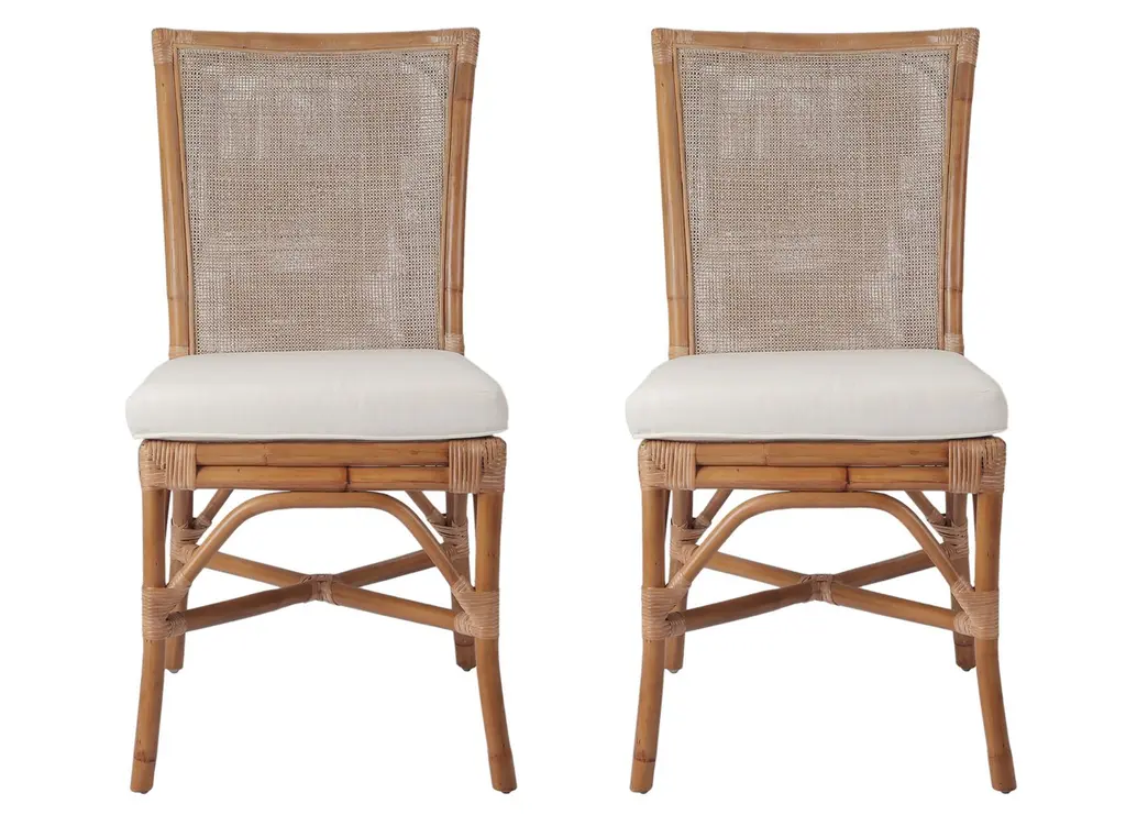 This pair of chairs show how versatile rattan can be. The frames are crafted of the durable, sustainable material, as are the woven back inserts and the bindings wrapped around the joints. The generously padded seat cushions ensure long-lasting comfort.