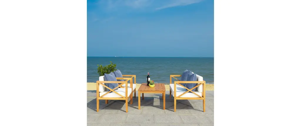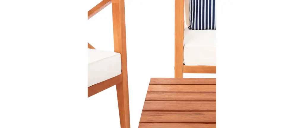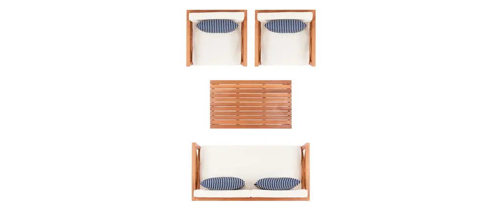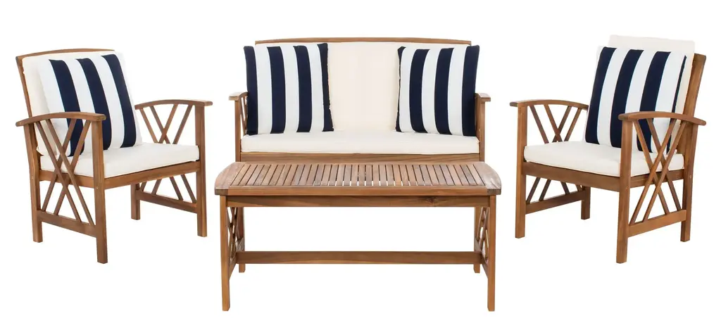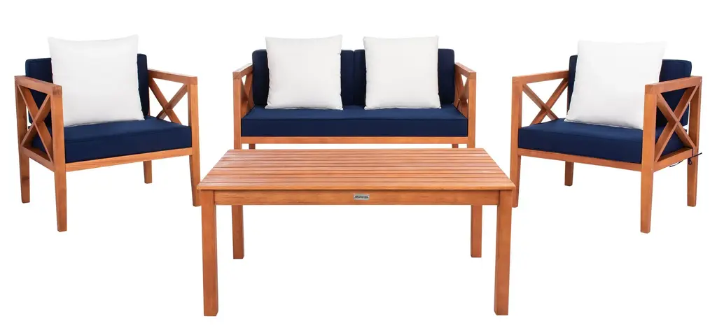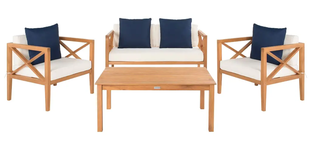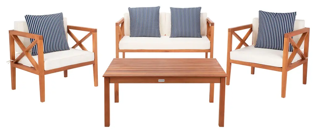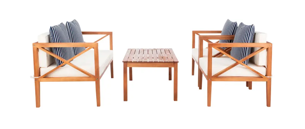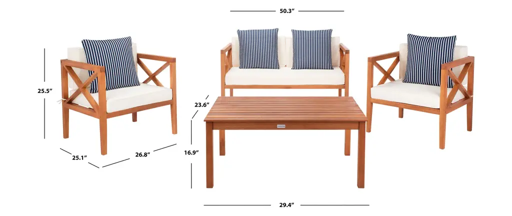 Update any outdoor living space with this contemporary 4 Piece outdoor set. Naturally finished to highlight its chic wooden frame, designers love its modern cross back style. Ideal for any outdoor entertaining, its plush upholstery and accent pillows make it a great investment.Bench: 50.3 x 25.1 x 25.5Armchair: 26.8 x 25.1 x 25.5Table: 29.37 x 23.6 x 16.9Upholestry Material: PolyesterMaterial: Eucalyptus, Galvantized SteelFinish Surface Treatment: OiledStore outdoor furniture indoors or cover well when not in use. Remove wooden furniture from standing water. Dust regularly with small brush or vacuum. Spills should be taken care of immediately before they harden or stain with a slightly dampened sponge. Do not use bleach solutions.