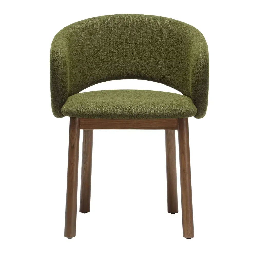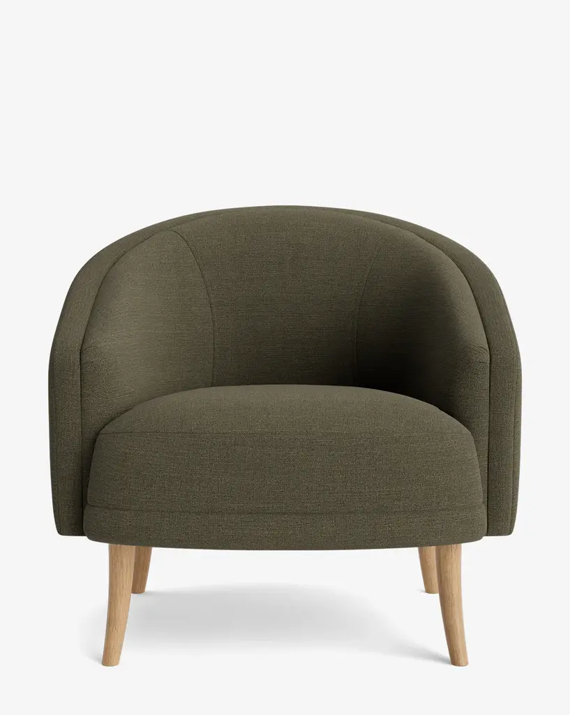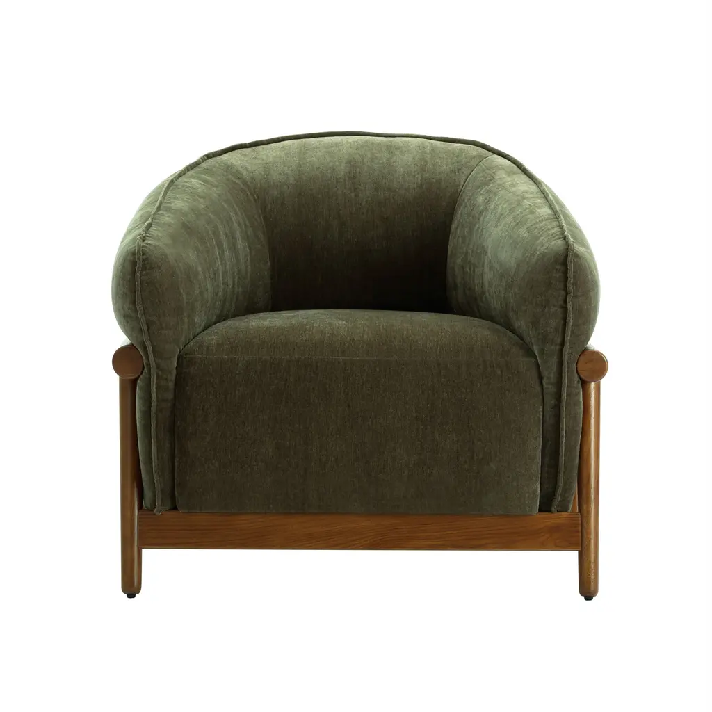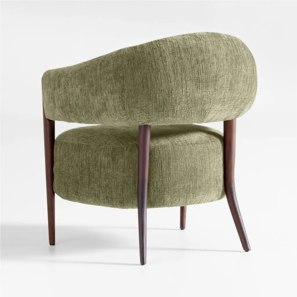Tapered wood and soft, rounded forms add Scandinavian flavor to Santi's contemporary proportions. Turned legs of dark walnut-finished oak frame the curved contours of the barrel back and substantial seat, both thoughtfully cushioned to provide a supportive yet comfortably soft sit. The plush upholstery in sage green offers the luxe feel of chenille with striated texture for an organic look. For an indulgent retreat, pair the chair with the coordinating ottoman.