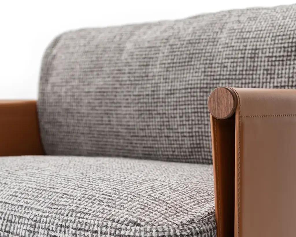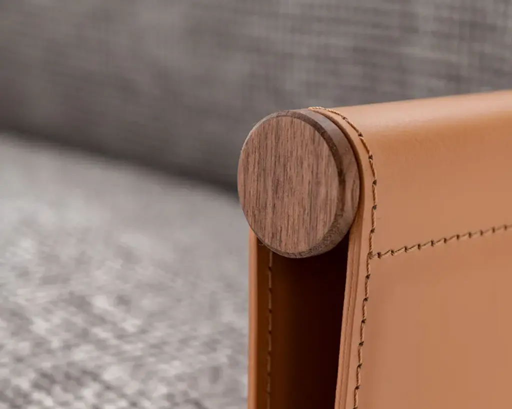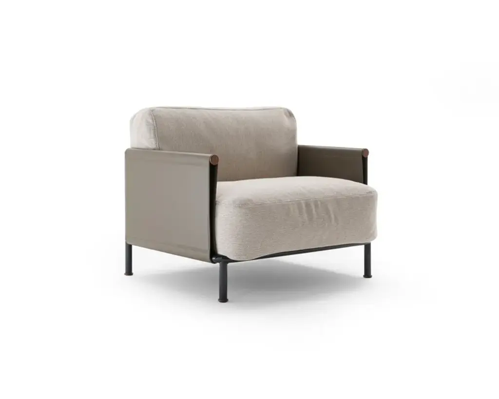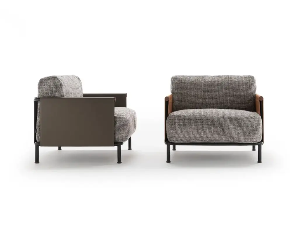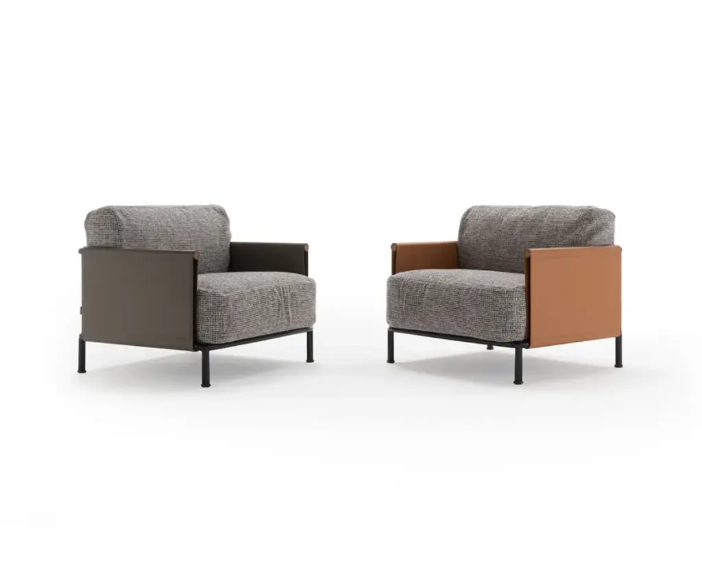 The SC2 armchair perfectly embodies a famous maxim by Bruno Munari: “Complication is easy, simplification is difficult.” SC2 is designed around a black painted tubular cage, adorned with Canaletto walnut details, over which the leather of the armrests and backrest is stretched: a structure with a linear design that houses a seat with soft and inviting cushions available in both leather and fabric options.Varnished metal frame covered on 3 sides with hard leather available in 4 finishes. Seat and back cushion padded with channeled goose down. Upholstery in fabric, leather or faux leather.