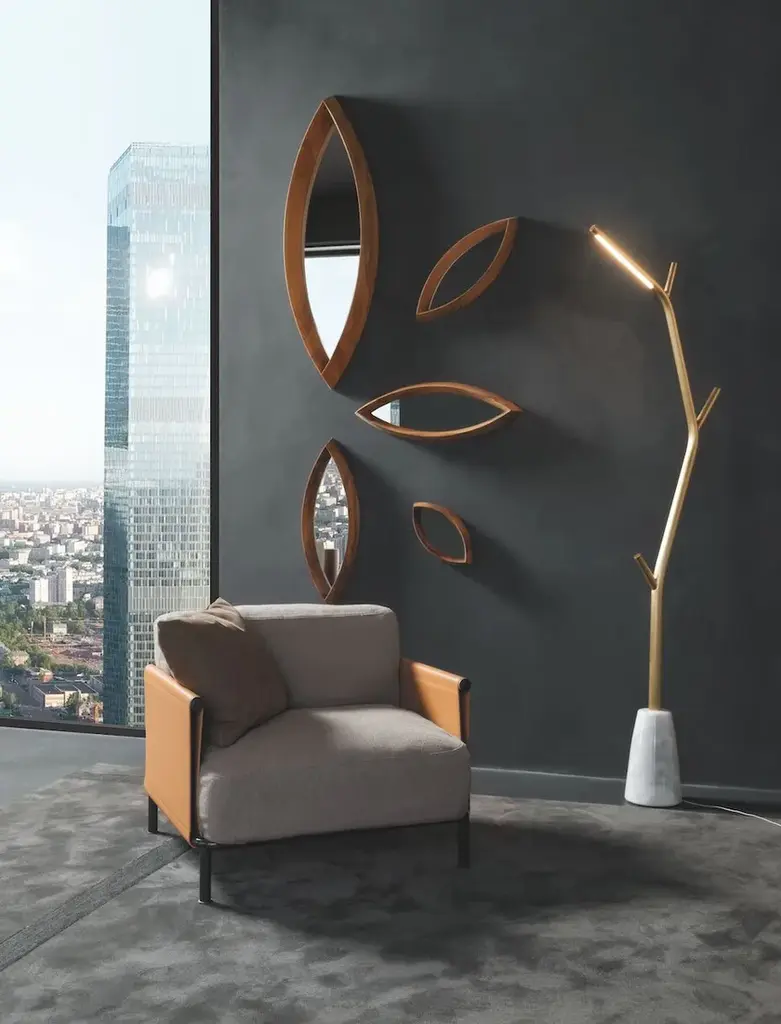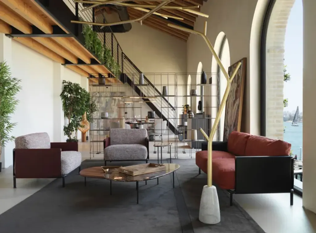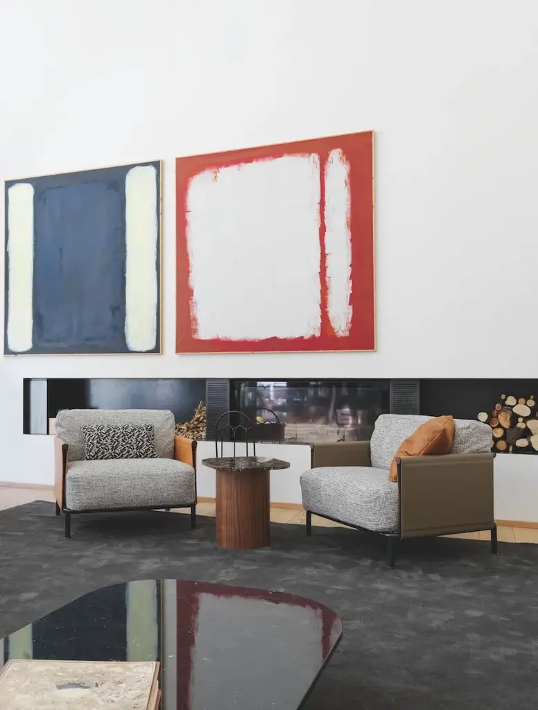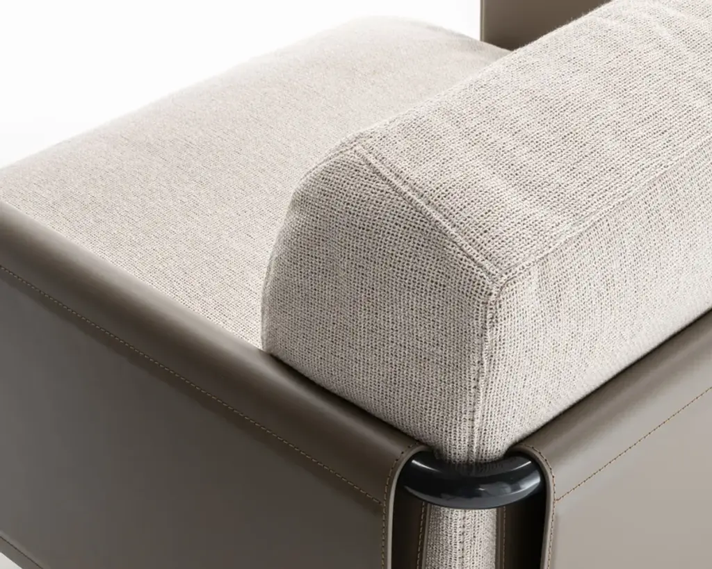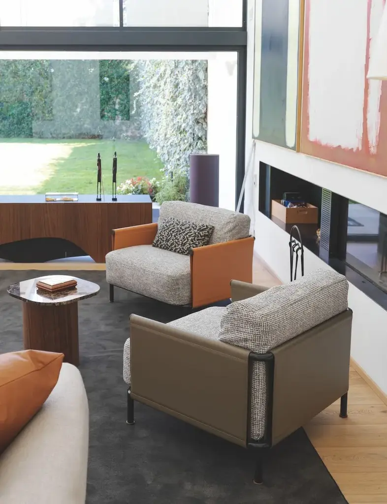 The SC2 armchair perfectly embodies a famous maxim by Bruno Munari: “Complication is easy, simplification is difficult.” SC2 is designed around a black painted tubular cage, adorned with Canaletto walnut details, over which the leather of the armrests and backrest is stretched: a structure with a linear design that houses a seat with soft and inviting cushions available in both leather and fabric options.Varnished metal frame covered on 3 sides with hard leather available in 4 finishes. Seat and back cushion padded with channeled goose down. Upholstery in fabric, leather or faux leather.