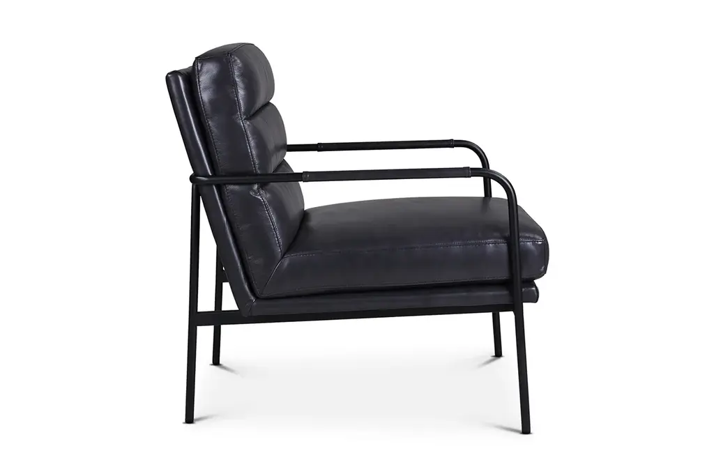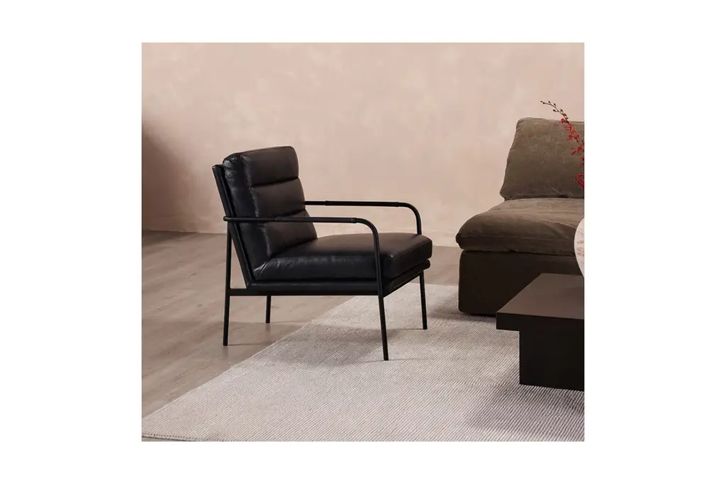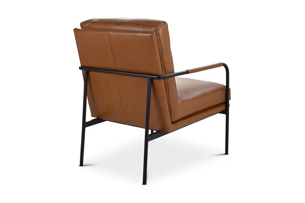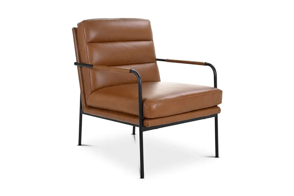 The Scianna Leather Chair is a perfect blend of sleek design and premium comfort, making it an ideal leather accent chair for any modern living space. Upholstered in sumptuous top-grain leather, this modern lounge chair features rich caramel tones complemented by horizontal channel stitching and a padded, tufted backrest that enhances both style and support. Its minimalist black powder-coated metal frame offers sturdy durability while maintaining an airy, open silhouette. The slim metal legs extend seamlessly into leather-wrapped armrests, ensuring comfort without sacrificing elegance. A zigzag spring system completes the design, providing excellent seating support in this top-grain leather furniture piece that effortlessly combines contemporary aesthetics with lasting quality.