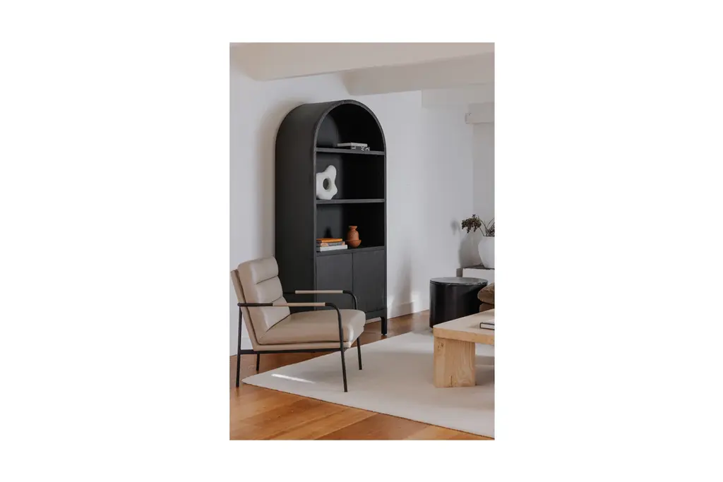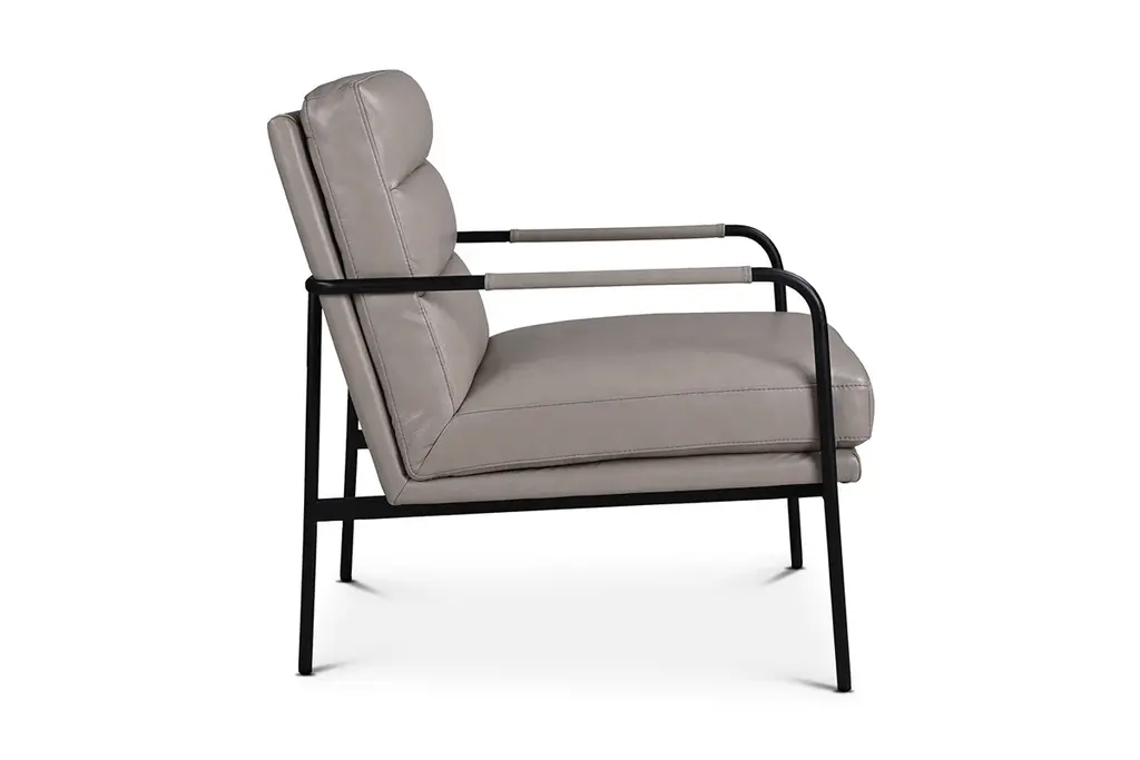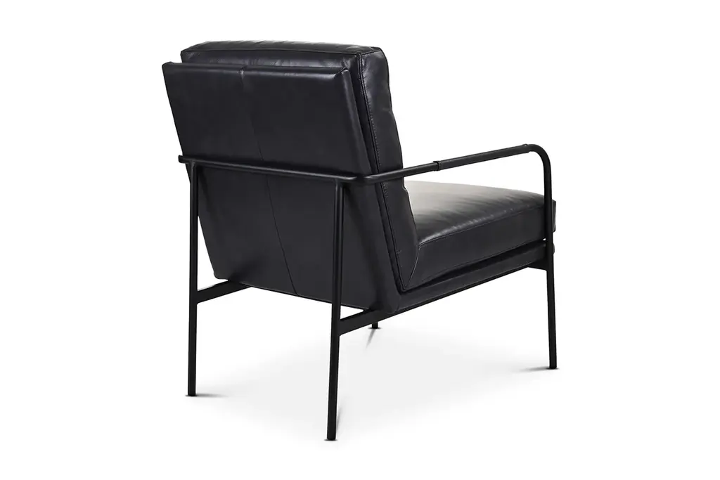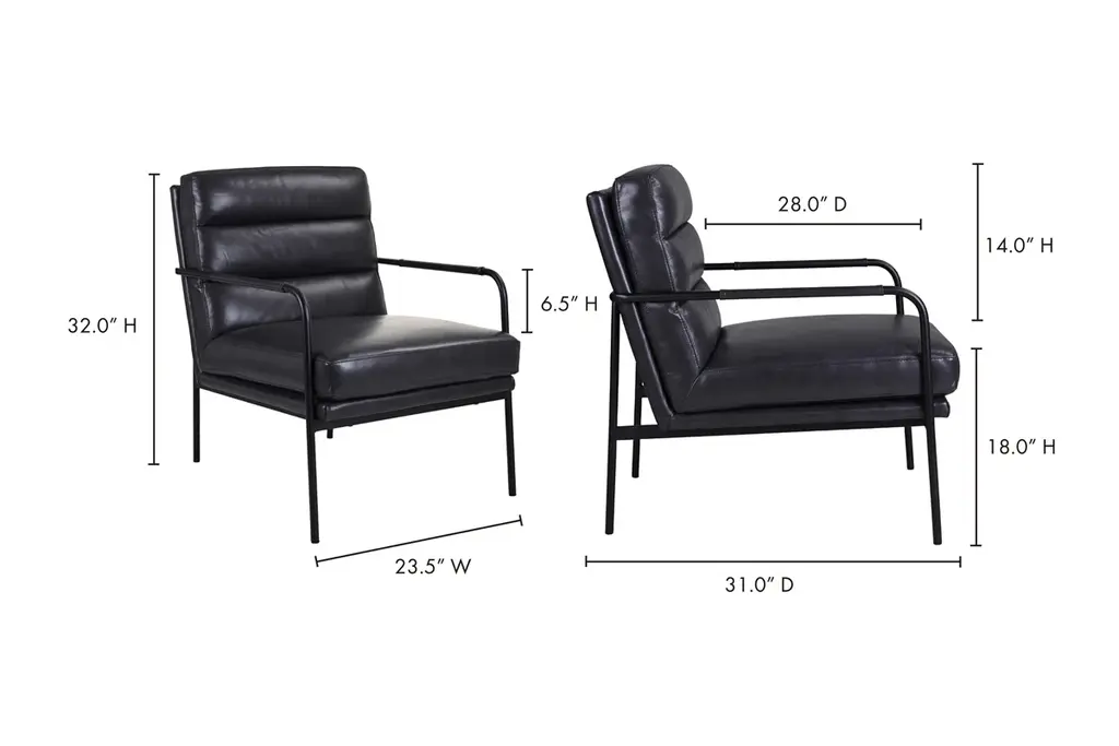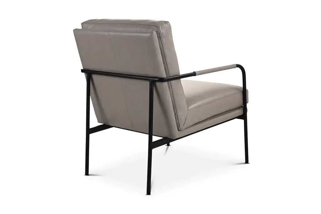 The Scianna Leather Chair is a perfect blend of sleek design and premium comfort, making it an ideal leather accent chair for any modern living space. Upholstered in sumptuous top-grain leather, this modern lounge chair features rich caramel tones complemented by horizontal channel stitching and a padded, tufted backrest that enhances both style and support. Its minimalist black powder-coated metal frame offers sturdy durability while maintaining an airy, open silhouette. The slim metal legs extend seamlessly into leather-wrapped armrests, ensuring comfort without sacrificing elegance. A zigzag spring system completes the design, providing excellent seating support in this top-grain leather furniture piece that effortlessly combines contemporary aesthetics with lasting quality.