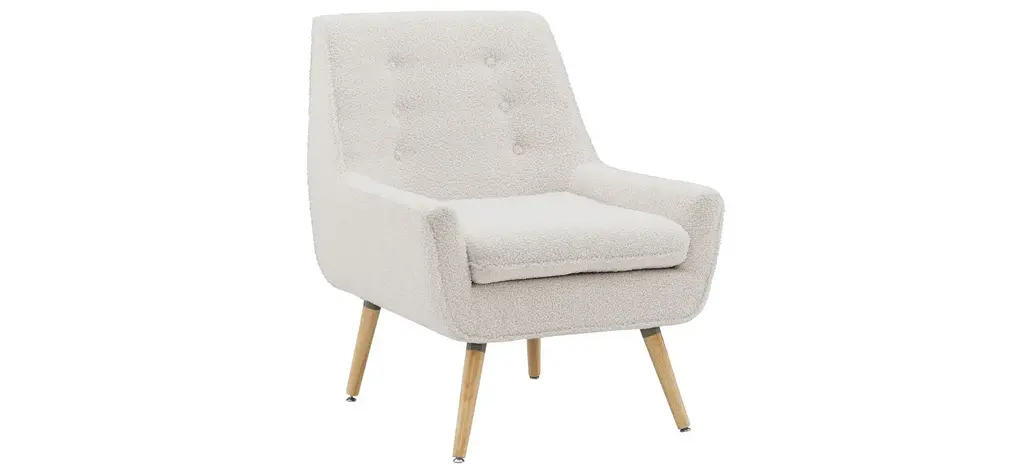 Bring luxurious charm and standout style to your seating collection with the Sculpted Faux Shearling Accent Chair from Threshold™ designed with Studio McGee. This cream accent chair features a sculpted design with curved back and tufted style for an eye-catching look. The wooden legs complement the look and makes this faux-shearling chair a stunning addition to your living room, study area or any other spot.Overall Height: 31 inchesOverall Width: 26.75 inchesOverall Depth: 30 inchesSeat Height: 17.25 inchesSeat Thickness: 9.25 inchesSeat Depth: 23.75 inchesSeat Width: 26.75 inches