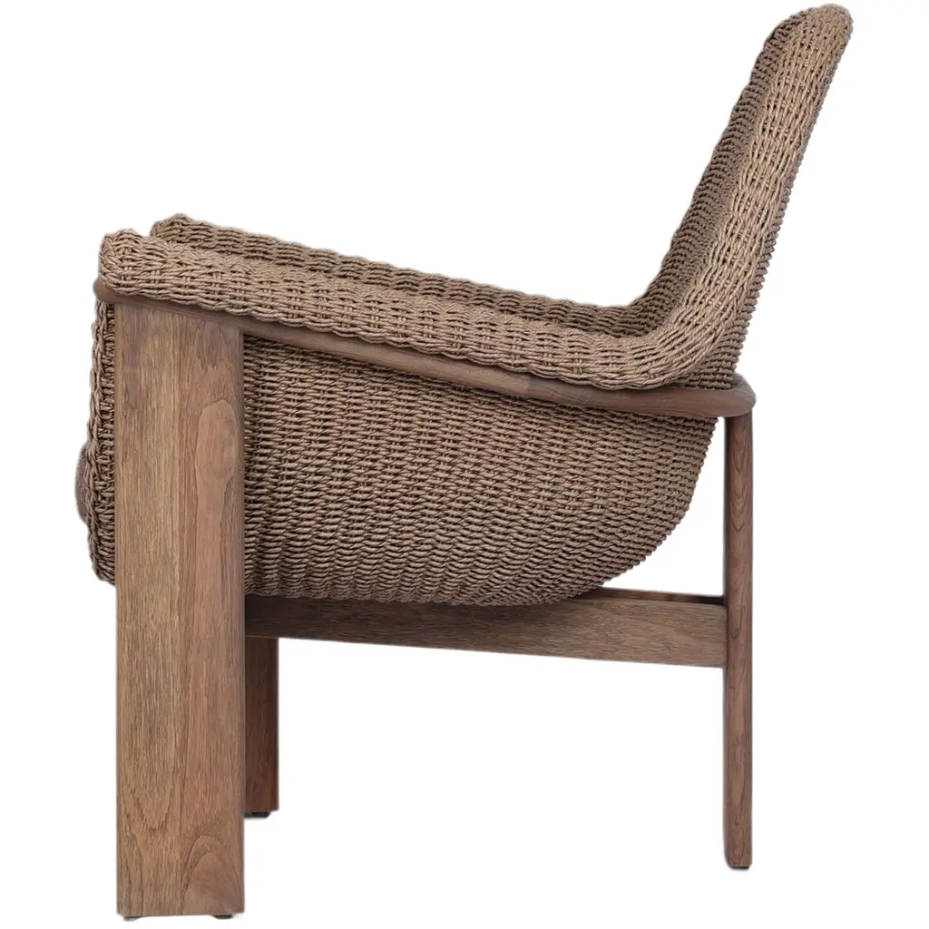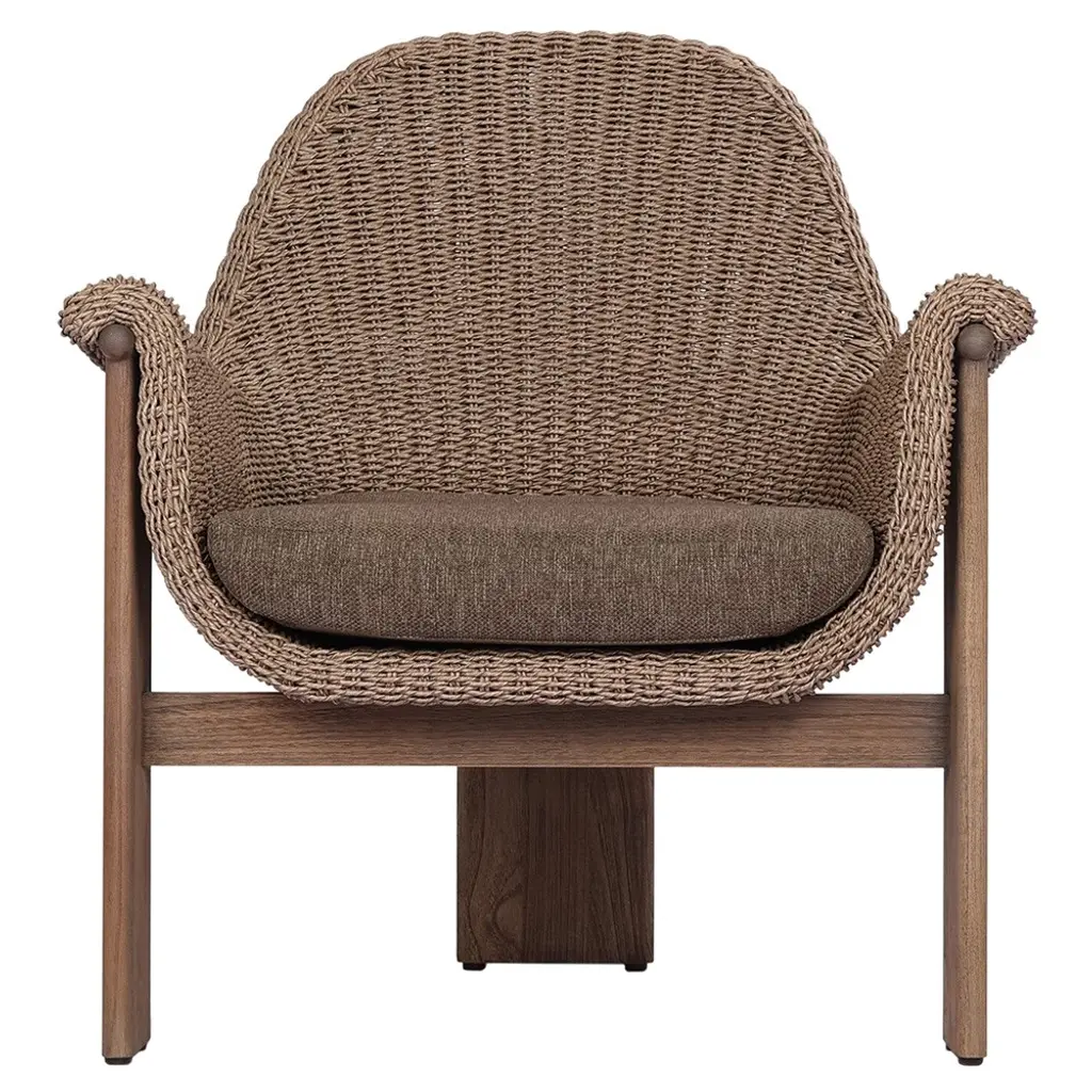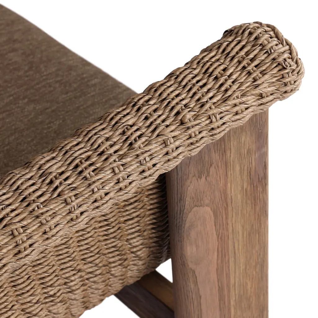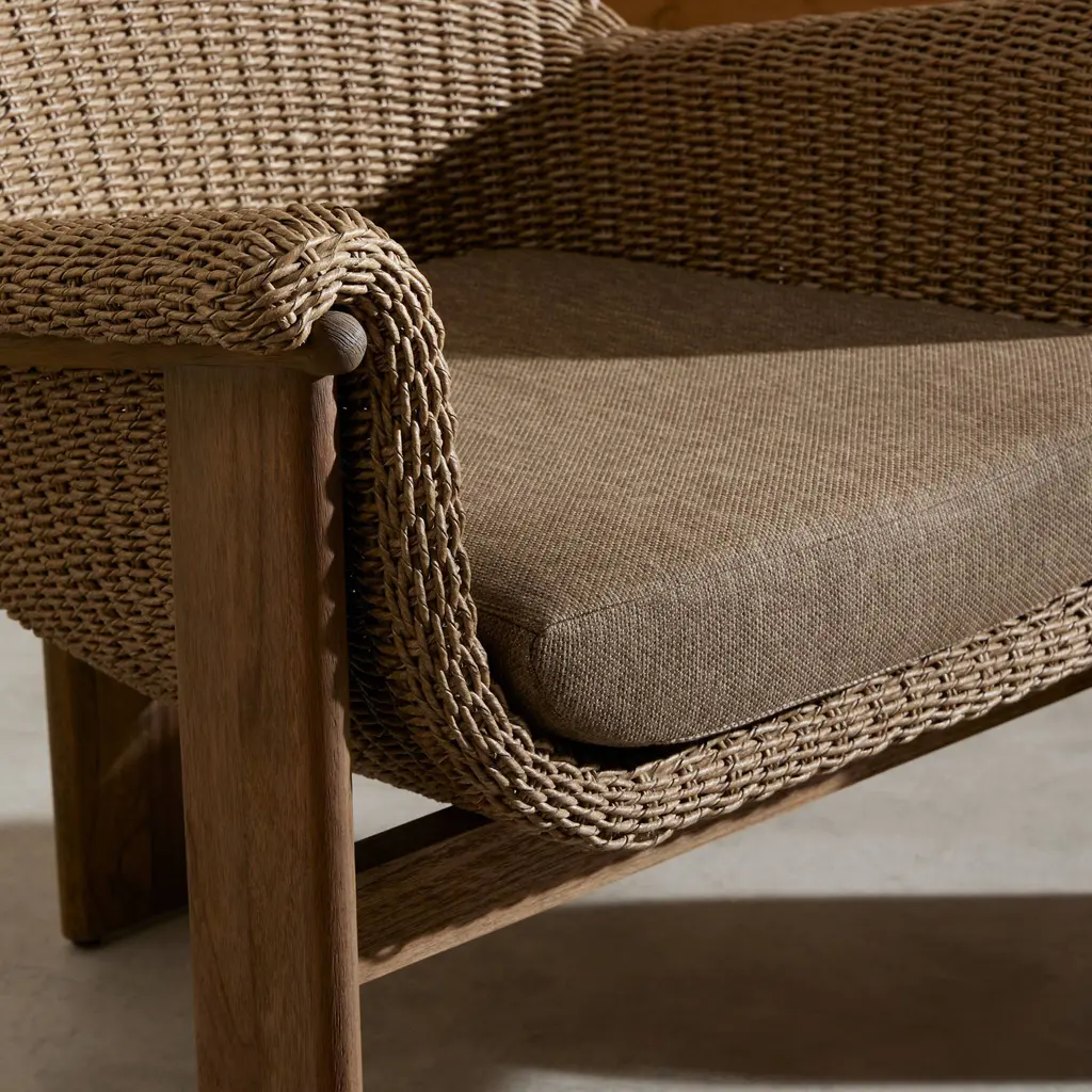 Introducing the Seaflora Outdoor Chair, where comfort and style converge in a vintage-inspired design. This accent chair features a curvy silhouette crafted from faux hyacinth, complemented by classic rolled arms and a loose seat cushion. The exposed frame, made from FSC®-certified teak, adds a fresh, monochromatic appeal to any outdoor setting. It's a perfect blend of elegance and functionality, ideal for enhancing your outdoor space. Remember to cover or store indoors during inclement weather and when not in use to maintain its pristine condition.