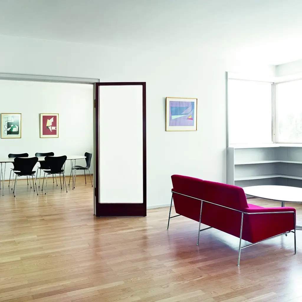 The 3300 series was created for the SAS Terminal at the Royal Hotel in Copenhagen, one of Arne Jacobsen's architectural masterpieces. In harmony with Jacobsen's architectural work at that time, the 3300 series is cool and formal. Furthermore, the 3300 series exudes Jacobsen's unfailing sense of line and proportion and his ability to design everlasting classics. Arne Jacobsen got the inspiration for the 3300 series from a sofa, which he had designed especially for his own home in the 1940s. The 3300 series forms an elegant contrast to the organic shapes of the Egg and Swan chairs, also designed especially for the Royal Hotel. The 3300 series consists of a 1-seater easy chair as well as a 2-seater and 3-seater sofa and is sublime for waiting and lounge areas as well as for private homes. The series 3300 is available in various types of leather and fabric upholstery and always with a chromed base.