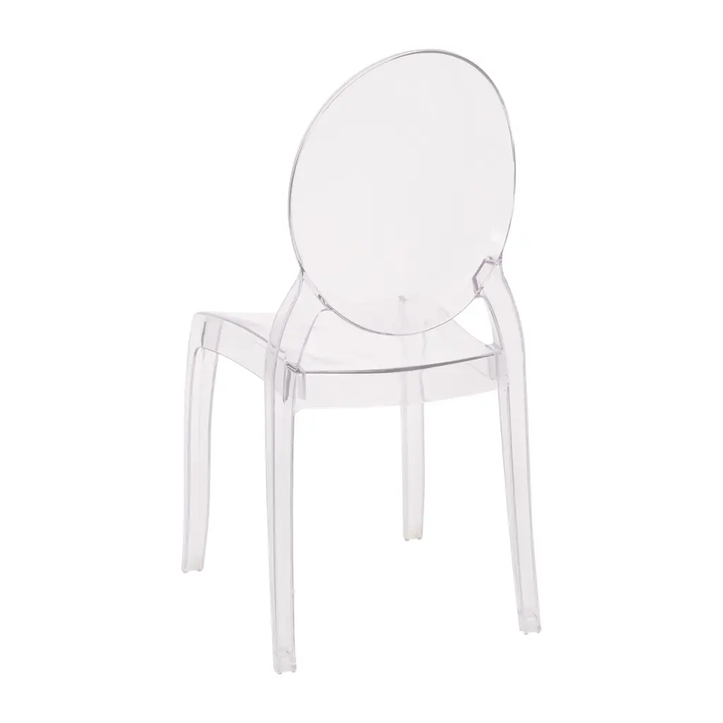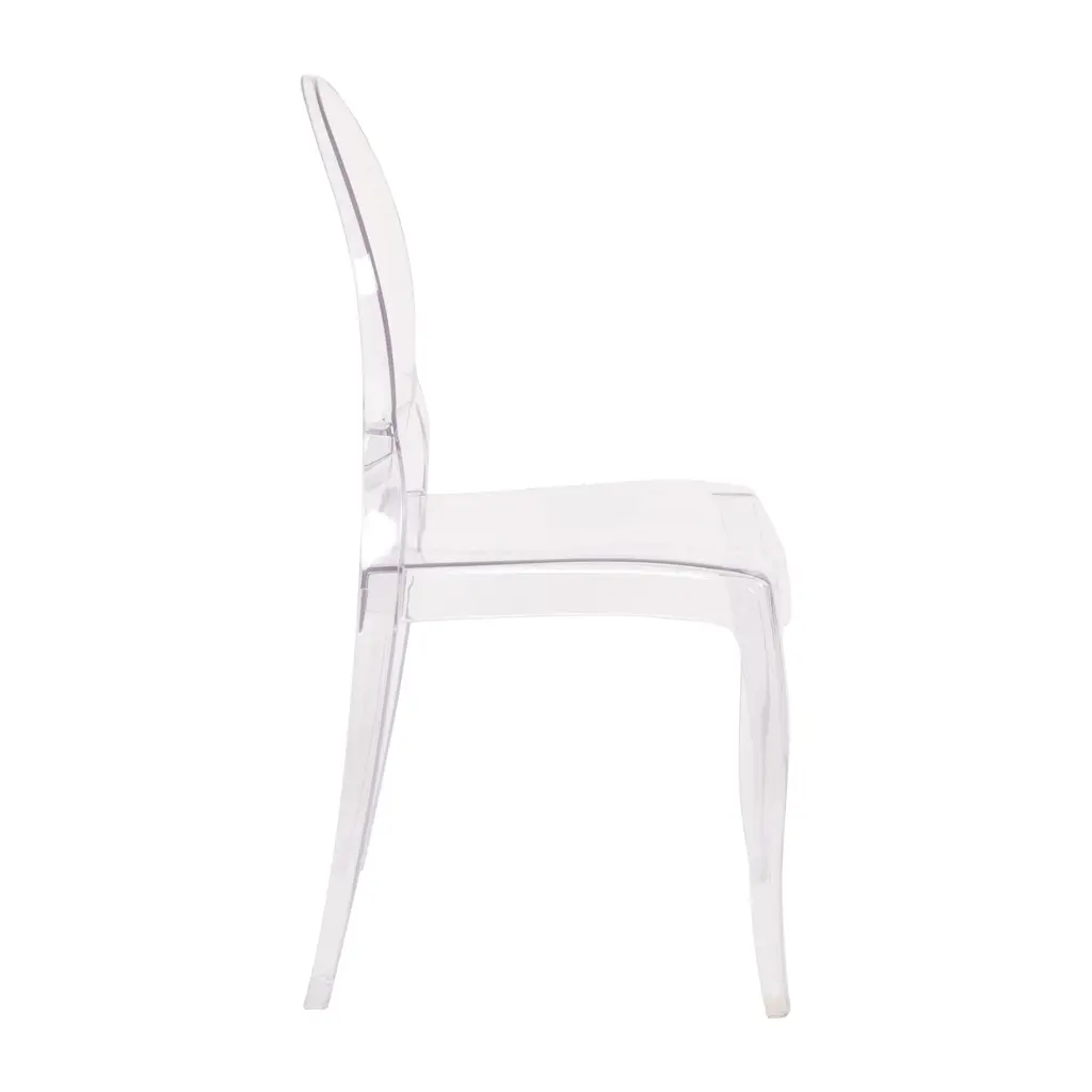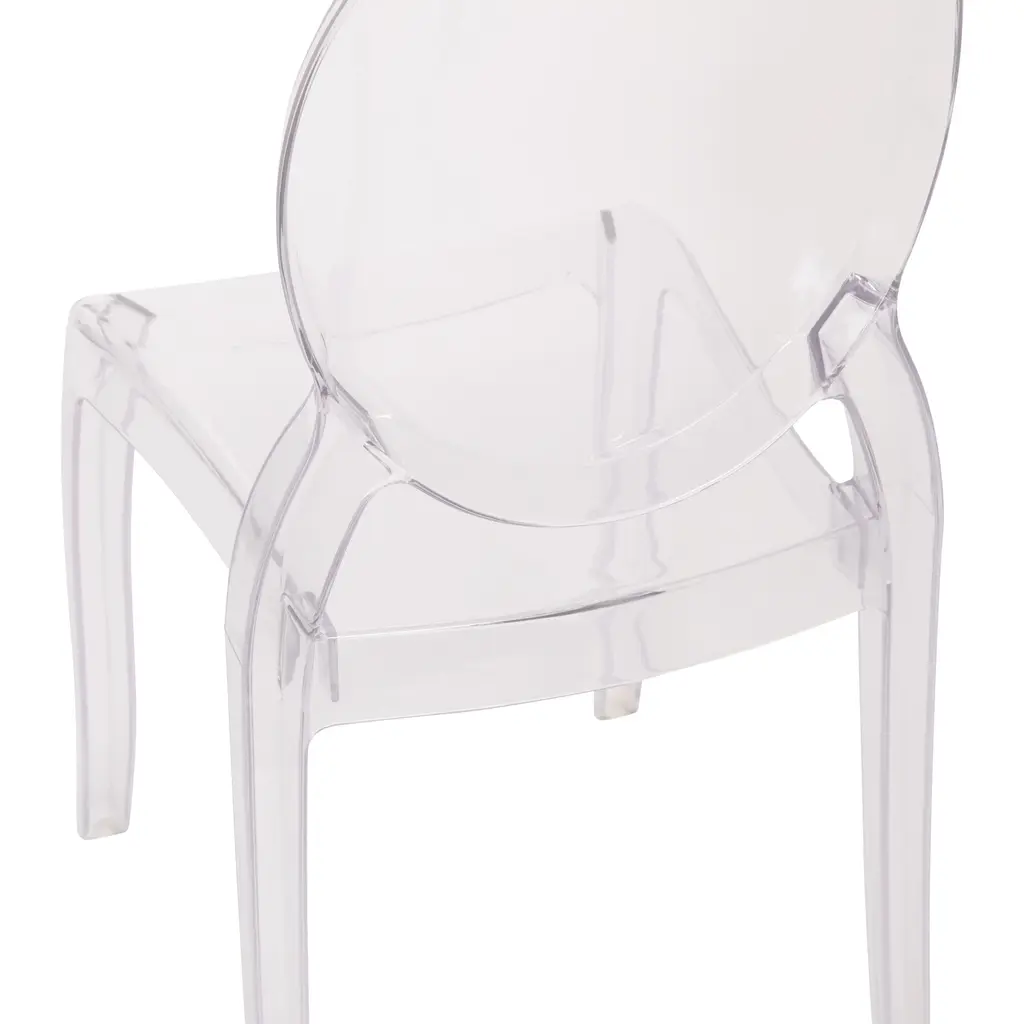 Offer your clients the versatility that comes with this set of 4 transparent crystal ghost chairs. The clear design of these all occasion chairs will blend with any decorating theme or decor to give you unparalleled decorating options in any venue. This resin stackable accent chair brings modern design, elegance and function to your home, restaurant and special events. The near invisibility of this modern chair highlights your artwork and other furniture, lightens a crowded space and can make a small room appear larger. An extra wide contoured seat makes this chair comfortable and the polycarbonate molded structure makes it shock, scratch and water resistant. Soft plastic floor glides protect your hard flooring surfaces by sliding smoothly when you need to move these beautiful chairs. Designed for indoor-outdoor and commercial use, this understated ghost chair is a classic accent chair that highlights almost any decor.