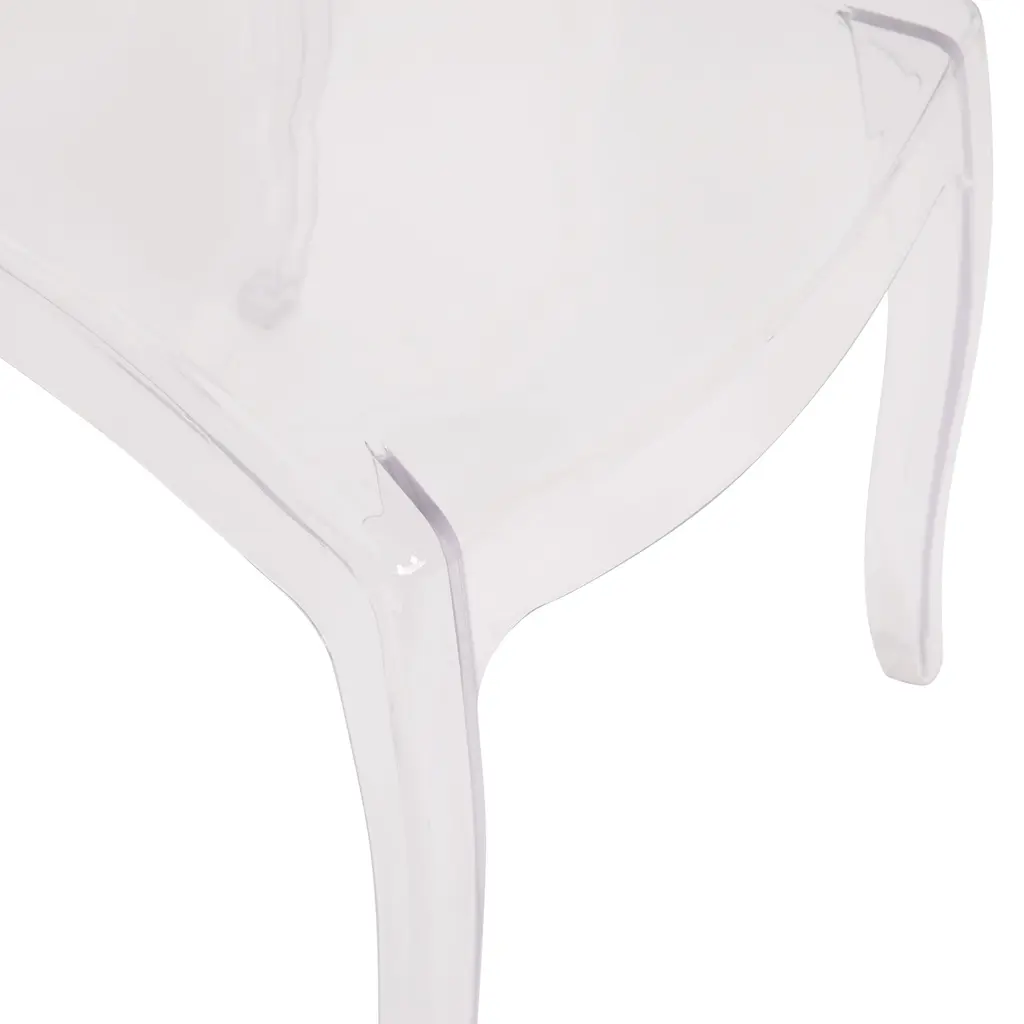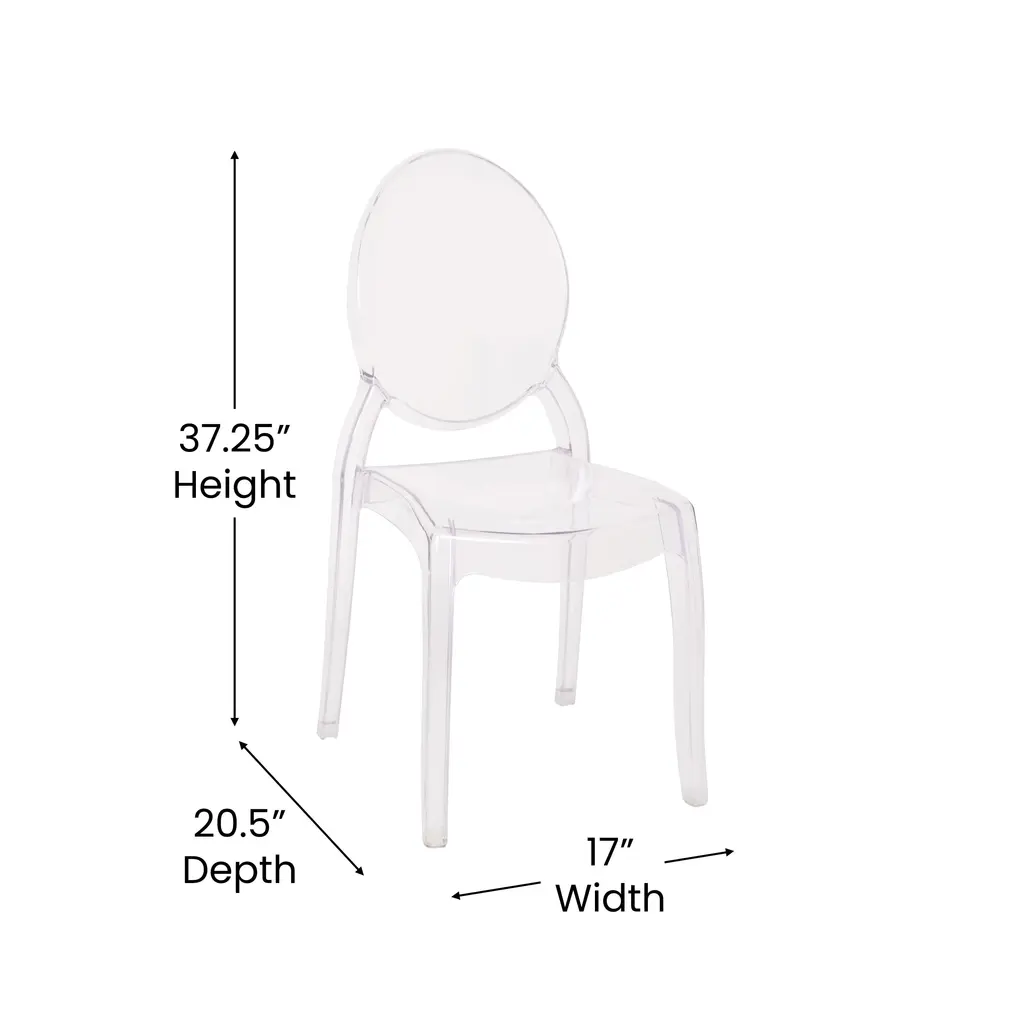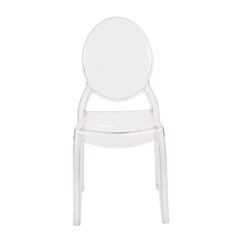 Offer your clients the versatility that comes with this set of 4 transparent crystal ghost chairs. The clear design of these all occasion chairs will blend with any decorating theme or decor to give you unparalleled decorating options in any venue. This resin stackable accent chair brings modern design, elegance and function to your home, restaurant and special events. The near invisibility of this modern chair highlights your artwork and other furniture, lightens a crowded space and can make a small room appear larger. An extra wide contoured seat makes this chair comfortable and the polycarbonate molded structure makes it shock, scratch and water resistant. Soft plastic floor glides protect your hard flooring surfaces by sliding smoothly when you need to move these beautiful chairs. Designed for indoor-outdoor and commercial use, this understated ghost chair is a classic accent chair that highlights almost any decor.