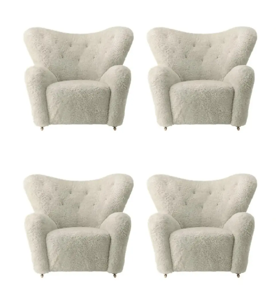 Set of 4 green tea sheepskin The Tired Man lounge chair by Lassen.Dimensions: W 102 x D 87 x H 88 cm Materials: SheepskinFlemming Lassen designed the overstuffed easy chair, The Tired Man, for The Copenhagen Cabinetmakers’ Guild Competition in 1935. It is characterised by organic, bearlike shapes and then as now it created a sensation with its curved form and voluminous armrests. Sitting in the chair should, in Flemming Lassen’s own ords, be ”as warm and safe as a polar bear cub in the arms of its mother in the middle of the ice CAP”. The family man Flemming Lassen valued intimate relationships - with its warm exterior, The Tired Man invokes domestic cosiness and socialising by candlelight.By Lassen is a Danish design brand focused on iconic designs created by Mogens and Flemming Lassen, founded by Lassens’ relatives in 2008. Brothers Mogens (1901-1987) and Flemming (1902-1984) Lassen are known as two of Denmark’s greatest architects and designers. Both were renowned pioneers of Danish functionalism and modernist architecture, honoured with numerous prestigious medals and awards. Headed by Mogens Lassen’s grandson Søren Lassen, By Lassen carries on the brothers’ design philosophy by manufacturing their iconic designs as well as products by other designers that complement the Lassen’s functionalist style. The company’s Mission is to continue the tradition of timelessness, functionality and quality, and to introduce the Lassen’s design heritage to new generations.