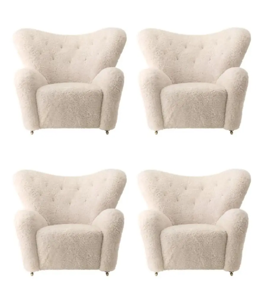 Set of 4 moonlight sheepskin The Tired Man lounge chair by LassenDimensions: W 102 x D 87 x H 88 cm Materials: SheepskinFlemming Lassen designed the overstuffed easy chair, The Tired Man, for The Copenhagen Cabinetmakers’ Guild Competition in 1935. It is characterised by organic, bearlike shapes and then as now it created a sensation with its curved form and voluminous armrests. Sitting in the chair should, in Flemming Lassen’s own ords, be” as warm and safe as a polar bear cub in the arms of its mother in the middle of the ice CAP”. The family man Flemming Lassen valued intimate relationships - with its warm exterior, The Tired Man invokes domestic cosiness and socialising by candlelight.By Lassen is a Danish design brand focused on iconic designs created by Mogens and Flemming Lassen, founded by Lassens’ relatives in 2008. Brothers Mogens (1901-1987) and Flemming (1902-1984) Lassen are known as two of Denmark’s greatest architects and designers. Both were renowned pioneers of Danish functionalism and modernist architecture, honoured with numerous prestigious medals and awards. Headed by Mogens Lassen’s grandson Søren Lassen, By Lassen carries on the brothers’ design philosophy by manufacturing their iconic designs as well as products by other designers that complement the Lassen’s functionalist style. The company’s Mission is to continue the tradition of timelessness, functionality and quality, and to introduce the Lassen’s design heritage to new generations.