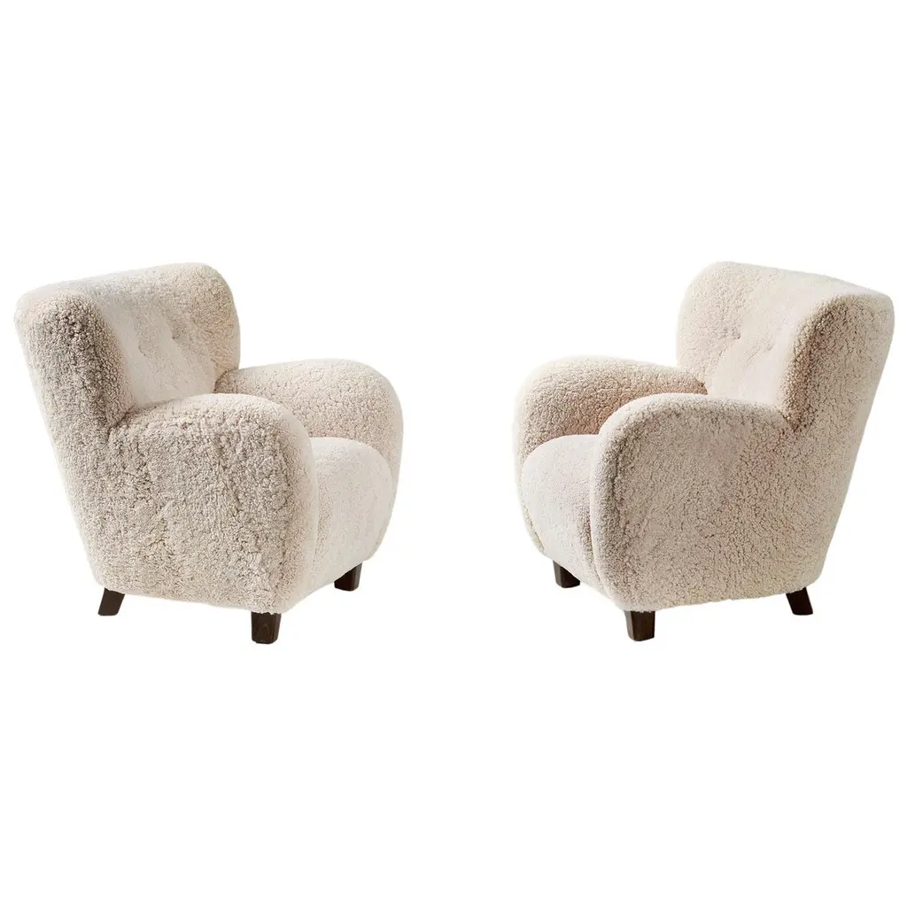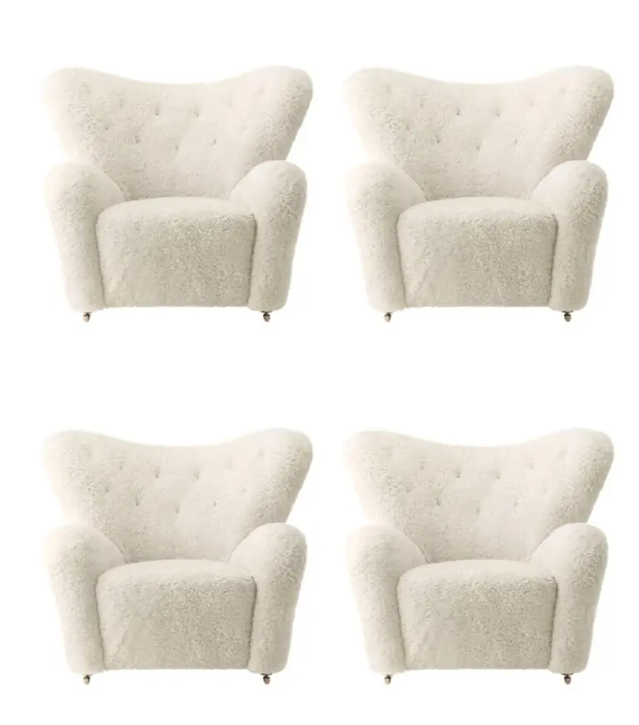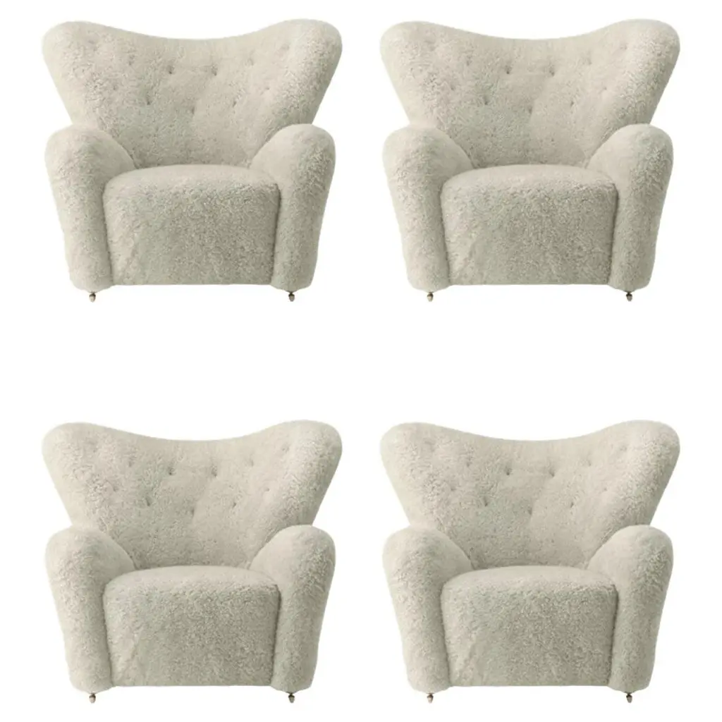 Set of 4 off white sheepskin the tired man lounge chair by LassenDimensions: W 102 x D 87 x H 88 cm Materials: SheepskinFlemming Lassen designed the overstuffed easy chair, The Tired Man, for The Copenhagen Cabinetmakers’ Guild Competition in 1935. It is characterised by organic, bearlike shapes and then as now it created a sensation with its curved form and voluminous armrests. Sitting in the chair should, in Flemming Lassen’s own ords, be ”as warm and safe as a polar bear cub in the arms of its mother in the middle of the ice cap”. The family man Flemming Lassen valued intimate relationships - with its warm exterior, The Tired Man invokes domestic cosiness and socialising by candlelight.By Lassen is a Danish design brand focused on iconic designs created by Mogens and Flemming Lassen, founded by Lassens’ relatives in 2008. Brothers Mogens (1901-1987) and Flemming (1902-1984) Lassen are known as two of Denmark’s greatest architects and designers. Both were renowned pioneers of Danish functionalism and modernist architecture, honoured with numerous prestigious medals and awards. Headed by Mogens Lassen’s grandson Søren Lassen, By Lassen carries on the brothers’ design philosophy by manufacturing their iconic designs as well as products by other designers that complement the Lassen’s functionalist style. The company’s mission is to continue the tradition of timelessness, functionality and quality, and to introduce the Lassen’s design heritage to new generations.