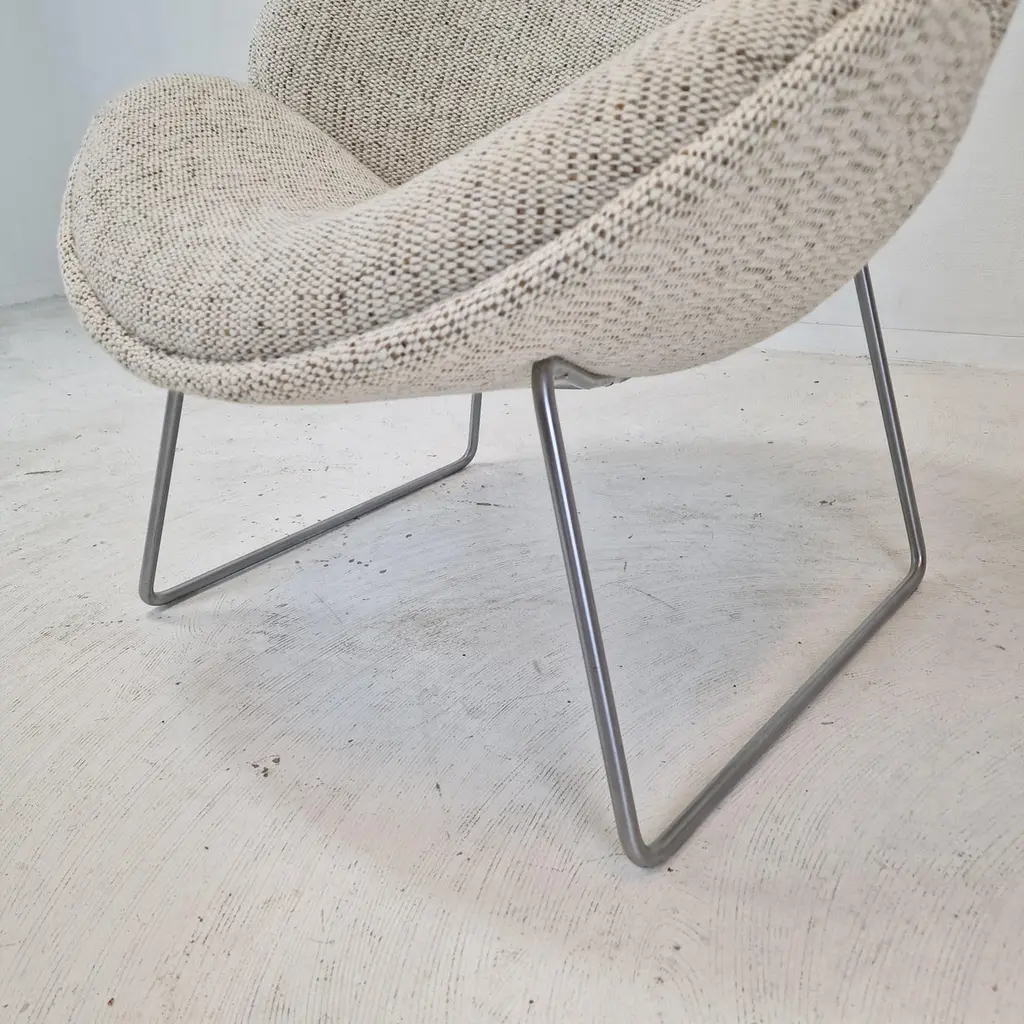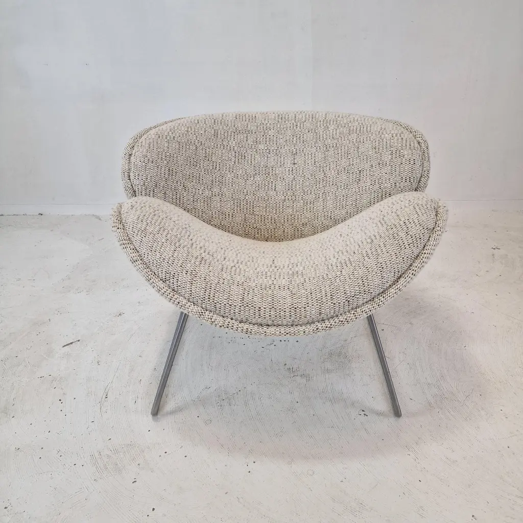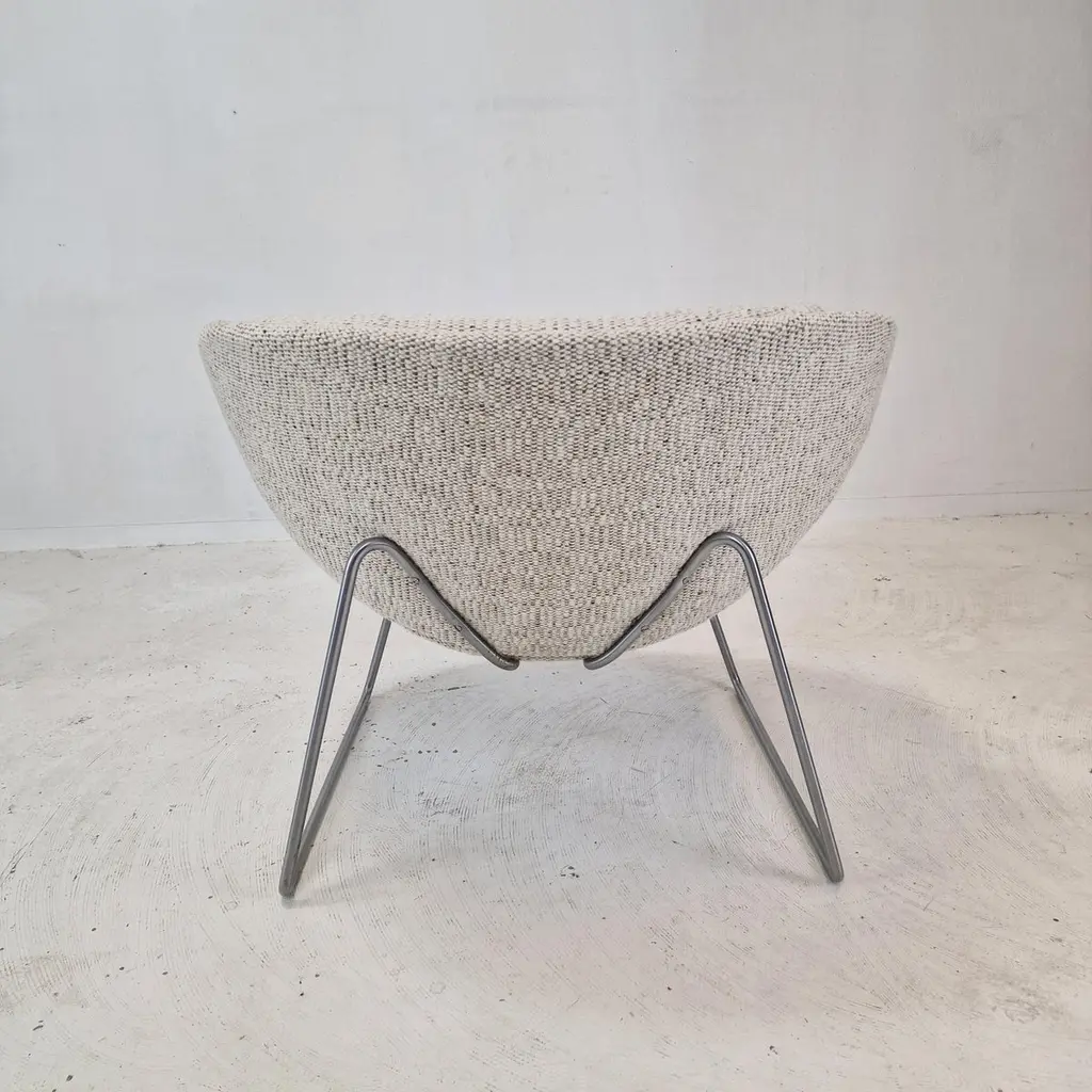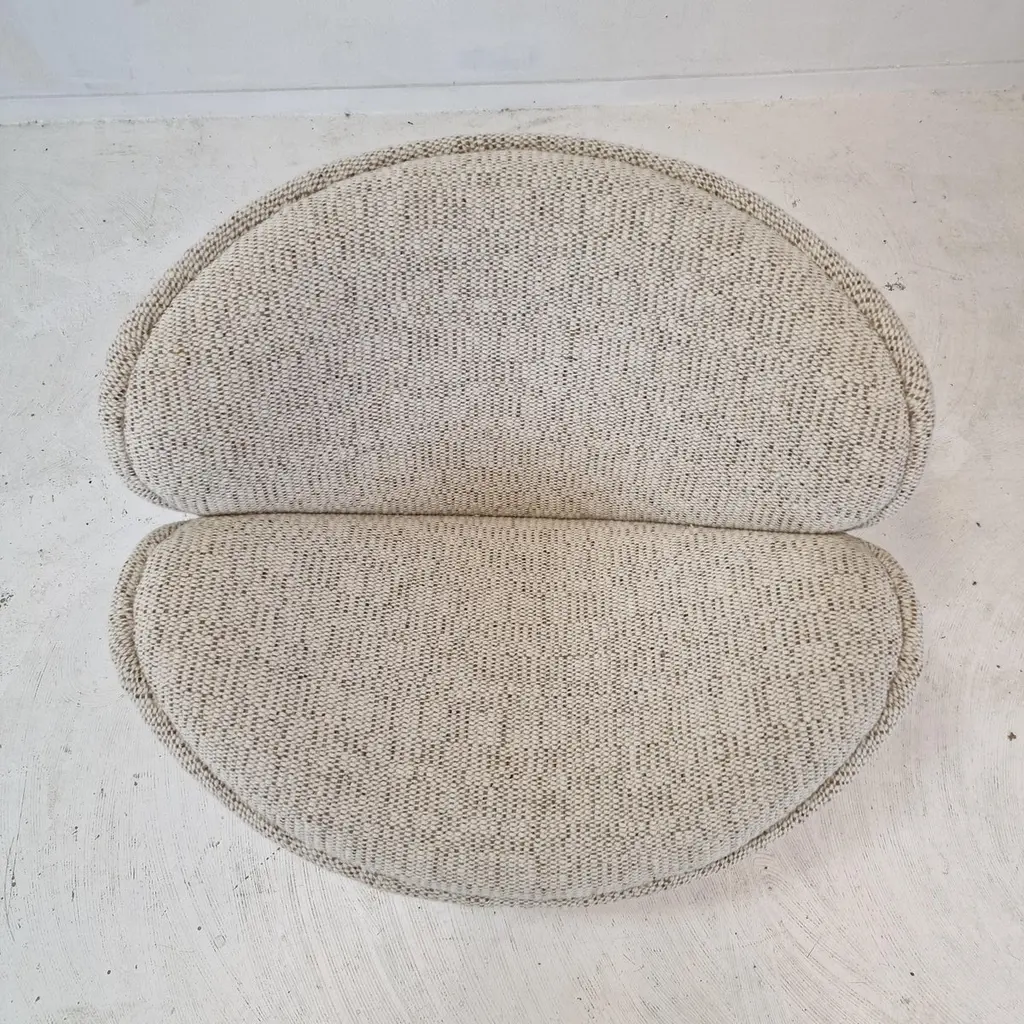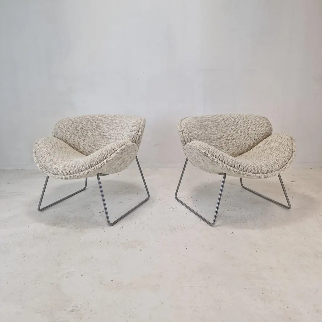 A beautiful set of the F438 Easy Chairs or Orange Slice Chairs.This comfortable chair is designed in the late 1950's by Pierre Paulin for Artifort. This model was manufactured for a short period in the early 1960's as an anniversary, that's why it is a very rare edition and a collectors item.The shape of the legs are different from its brother, the F437.The chairs have been restored with new fabric and new foam.They are upholstered wit a stunning wool Danish Art fabric.It is also possible to choose the color or fabric you want. We work with professional upholsterers and specialists. Please ask for the options. We work with professional packers and shippers, we can deliver worldwide within 5 to 10 days.