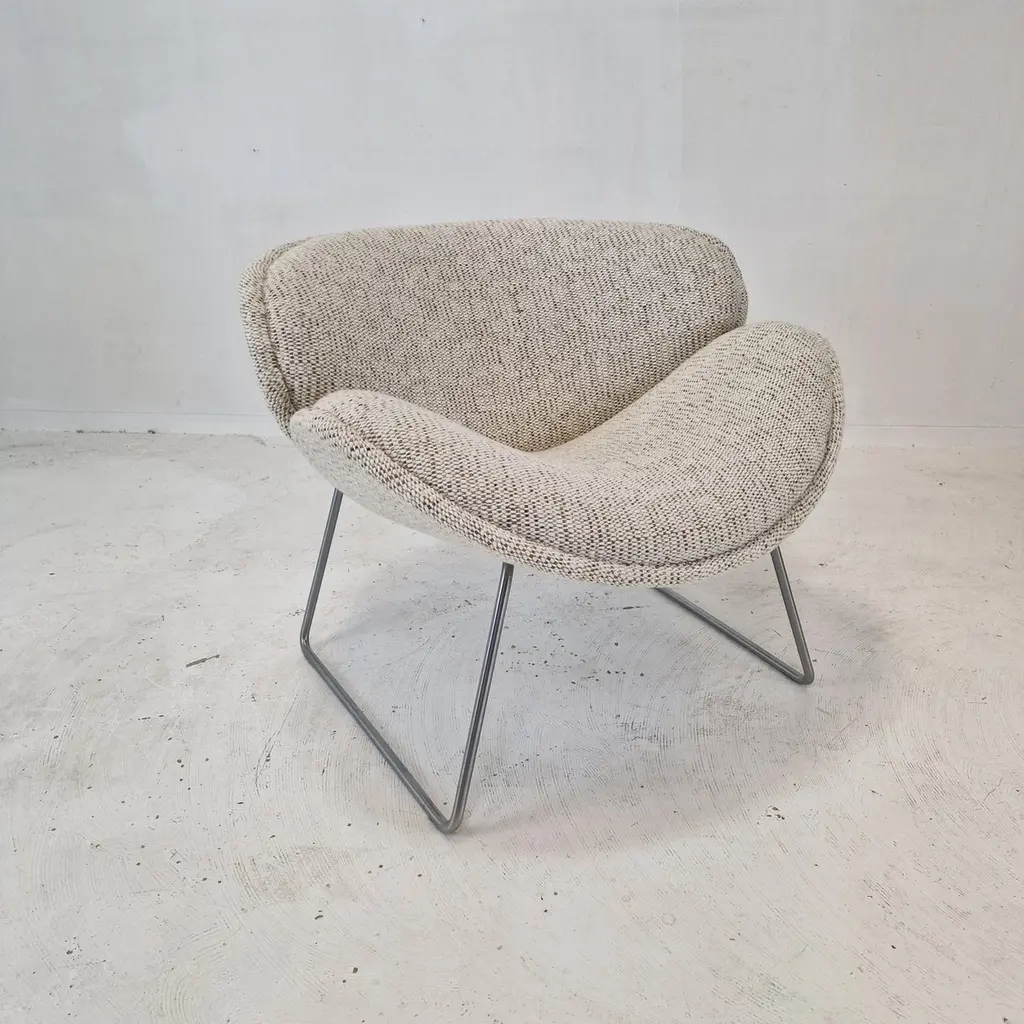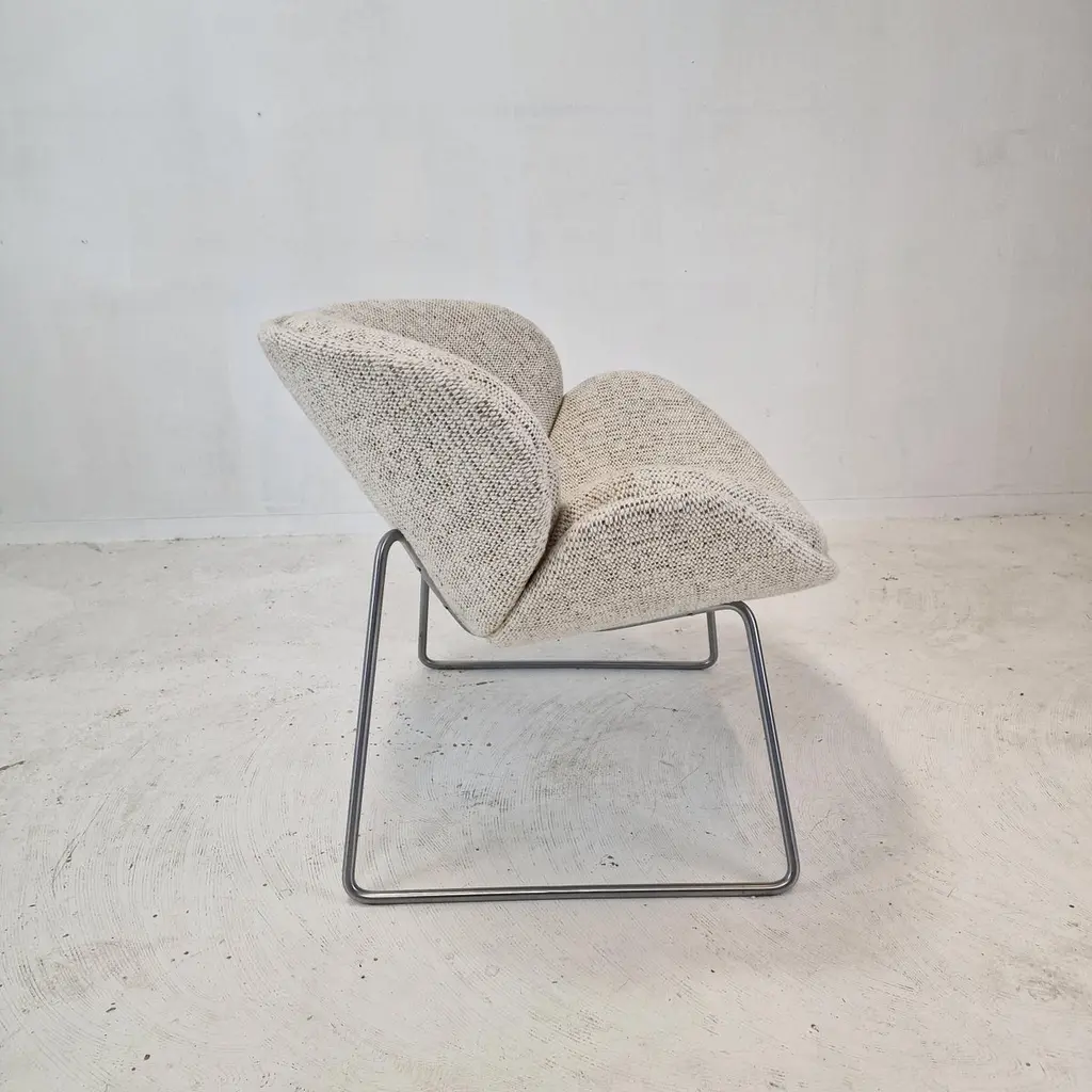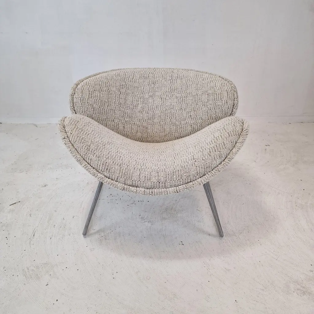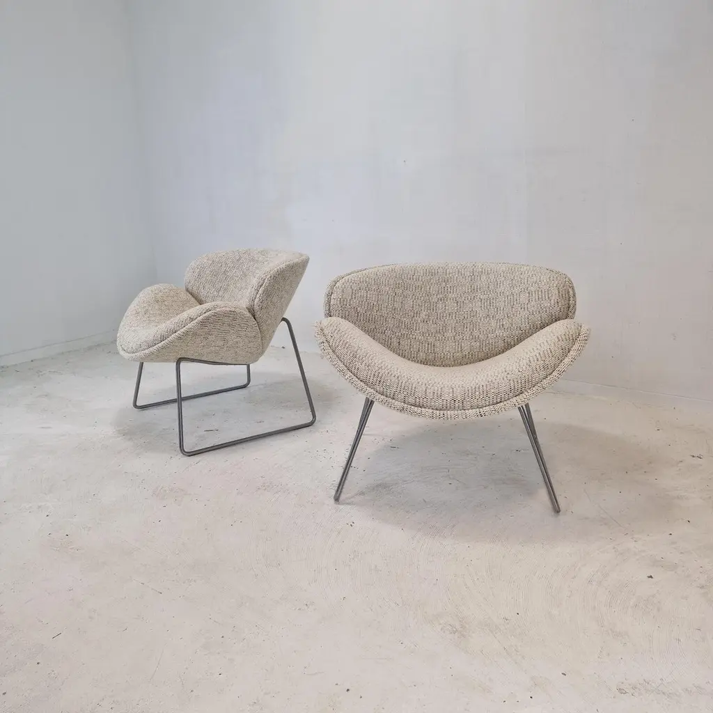 A beautiful set of the F438 Easy Chairs or Orange Slice Chairs.This comfortable chair is designed in the late 1950's by Pierre Paulin for Artifort. This model was manufactured for a short period in the early 1960's as an anniversary, that's why it is a very rare edition and a collectors item.The shape of the legs are different from its brother, the F437.The chairs have been restored with new fabric and new foam.They are upholstered wit a stunning wool Danish Art fabric.It is also possible to choose the color or fabric you want. We work with professional upholsterers and specialists. Please ask for the options. We work with professional packers and shippers, we can deliver worldwide within 5 to 10 days.