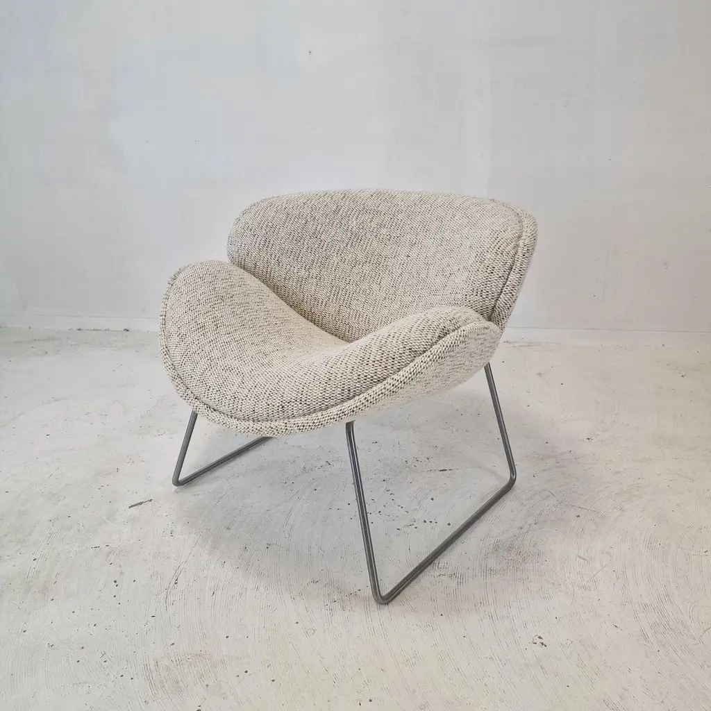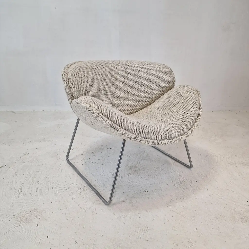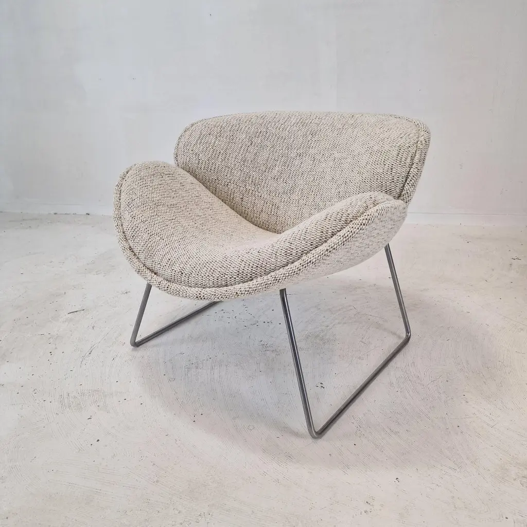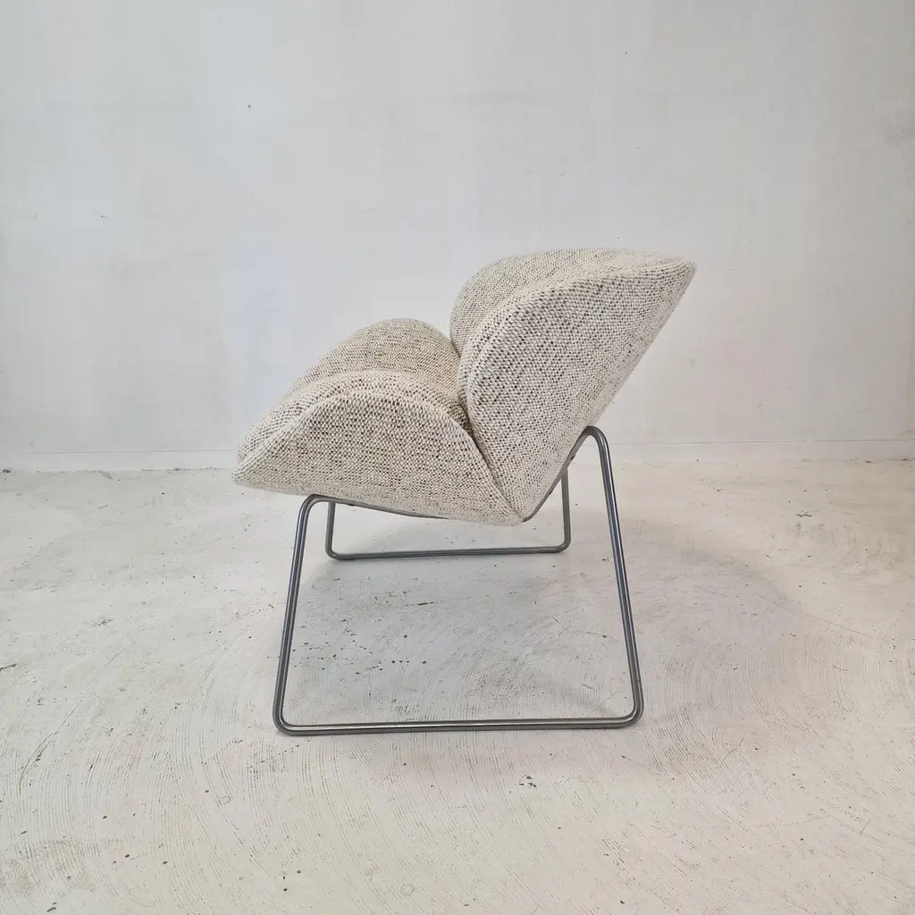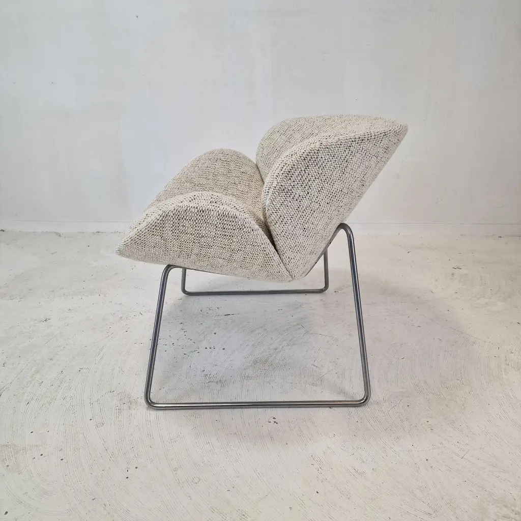 A beautiful set of the F438 Easy Chairs or Orange Slice Chairs.This comfortable chair is designed in the late 1950's by Pierre Paulin for Artifort. This model was manufactured for a short period in the early 1960's as an anniversary, that's why it is a very rare edition and a collectors item.The shape of the legs are different from its brother, the F437.The chairs have been restored with new fabric and new foam.They are upholstered wit a stunning wool Danish Art fabric.It is also possible to choose the color or fabric you want. We work with professional upholsterers and specialists. Please ask for the options. We work with professional packers and shippers, we can deliver worldwide within 5 to 10 days.