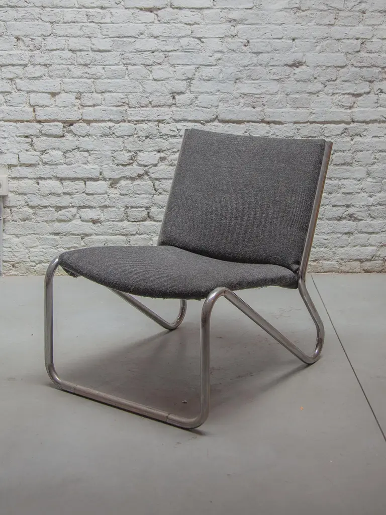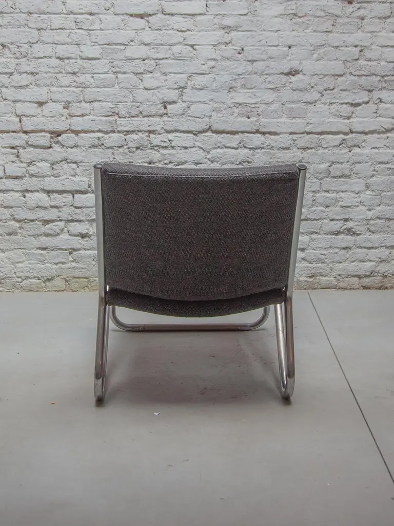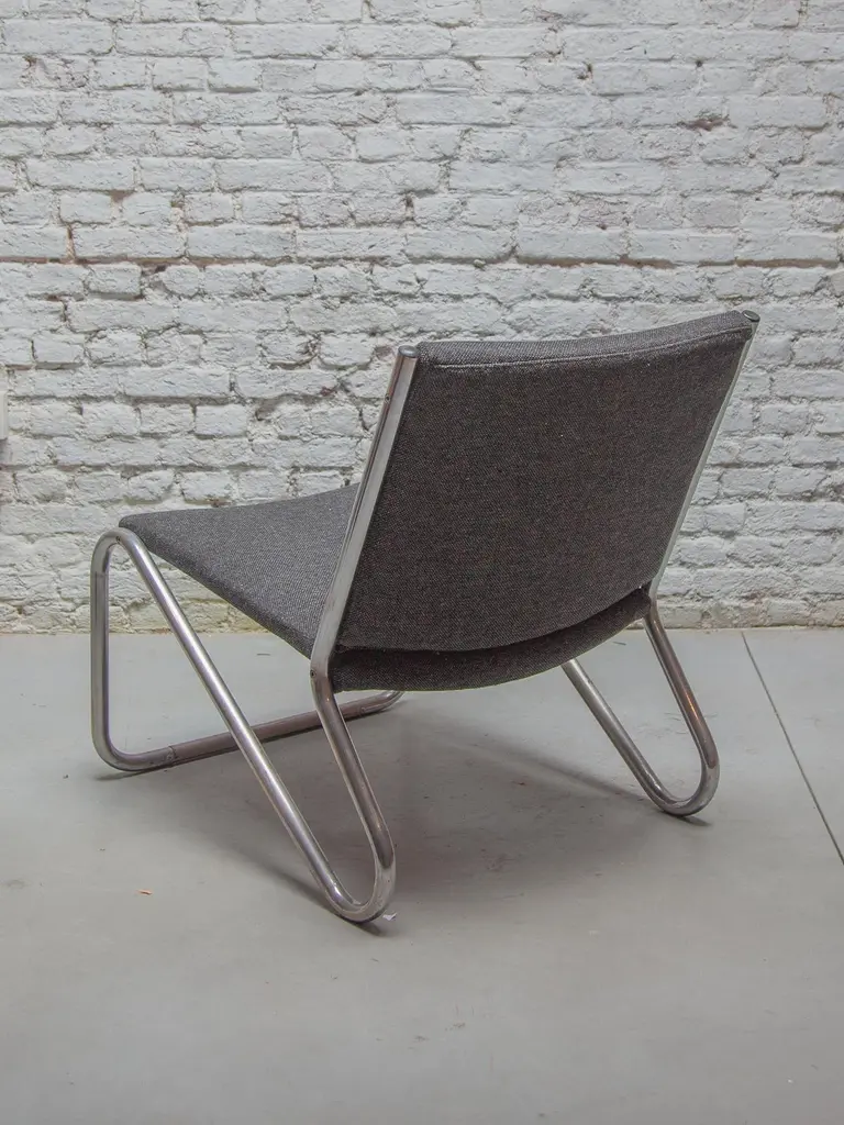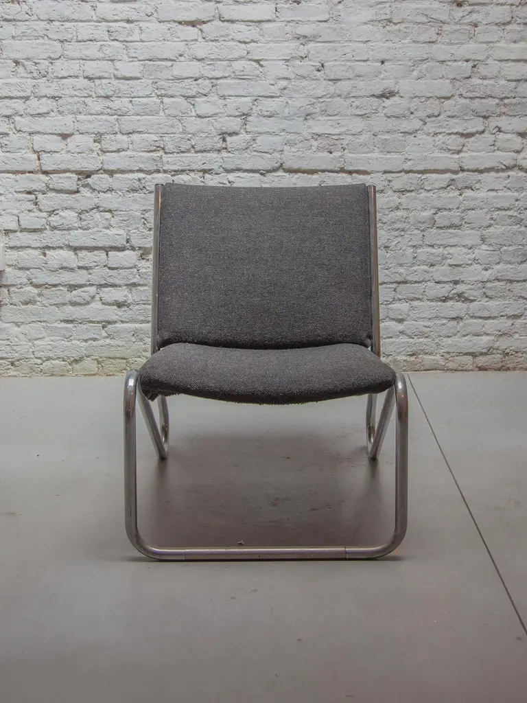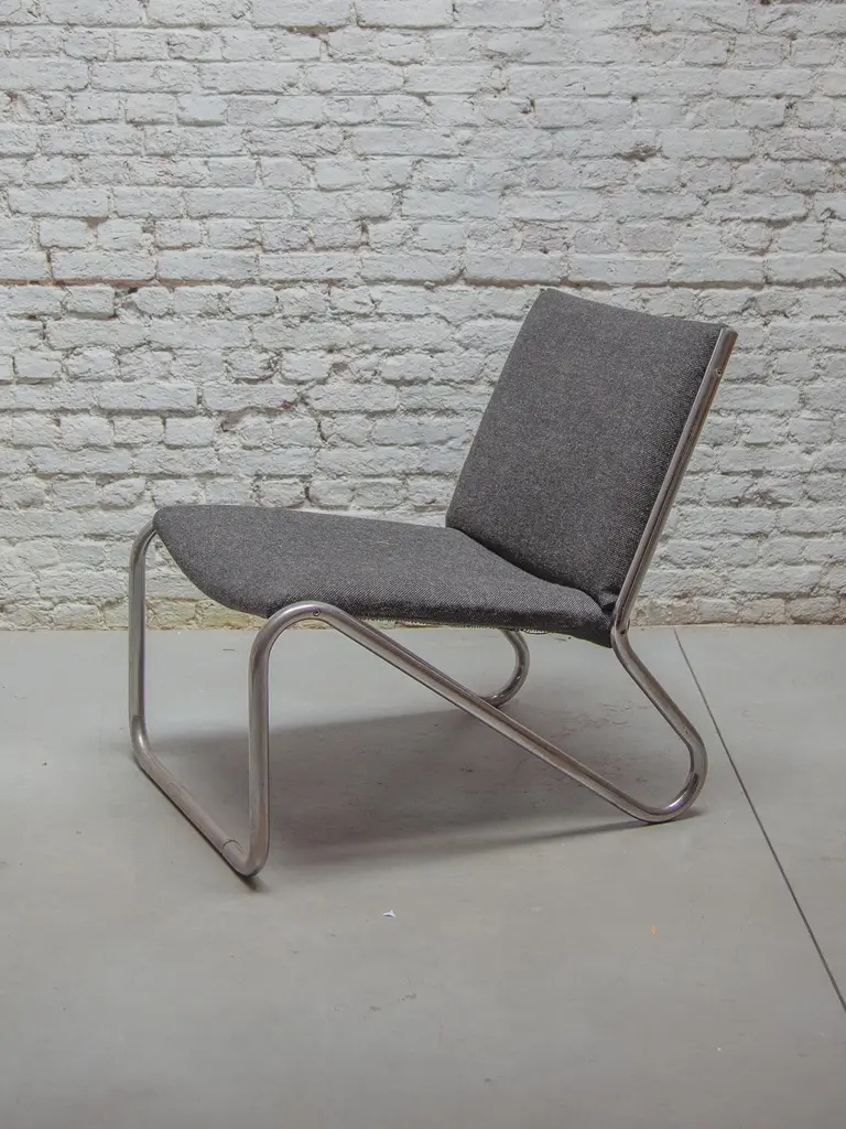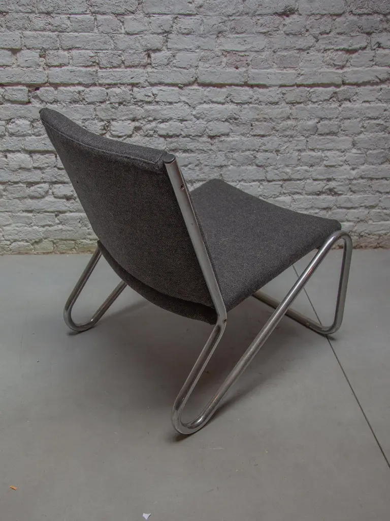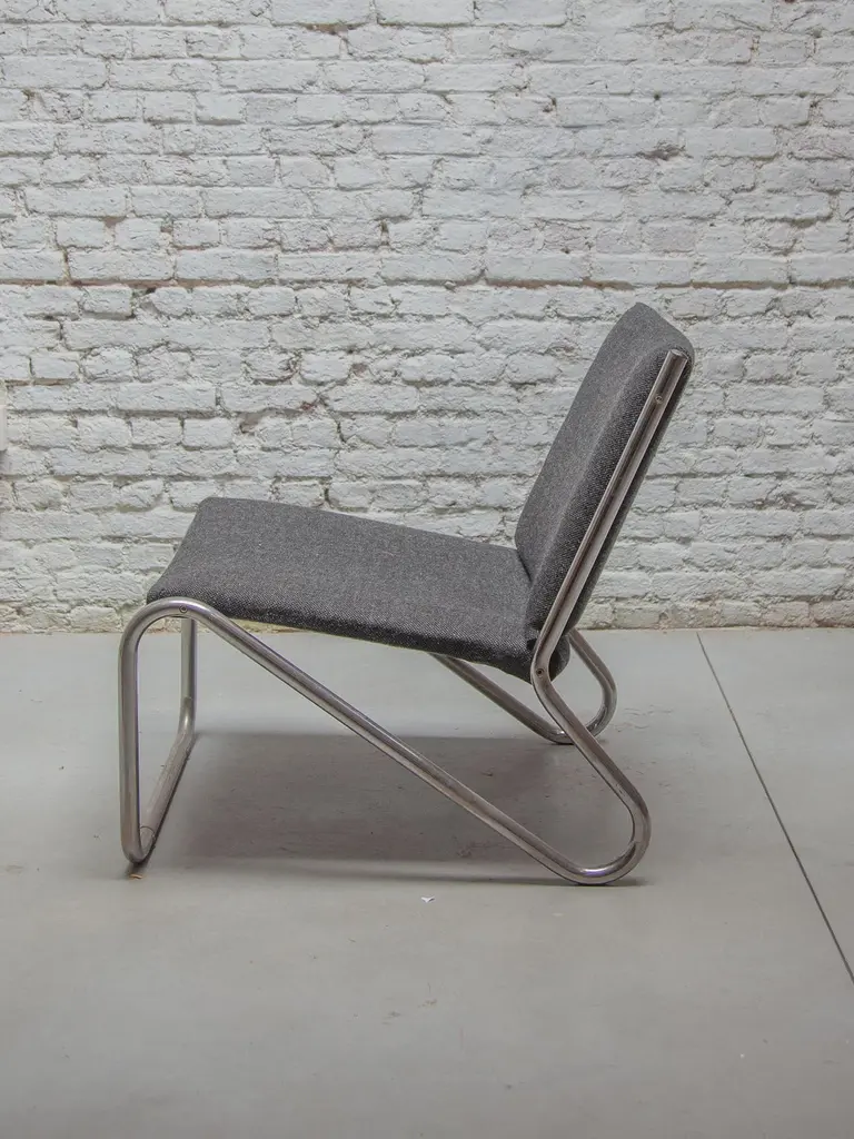 A set of Five Bauhaus style stackable tubular steel chrome lounge chairs a classic streamline design in original vintage condition. The wool fabric in different shades of gray looks almost new at the backrest and seating area. The chrome frame is also in excellent condition. The lounge chairs, manufactured in the 1960s, have a very good seating comfort. Price item.