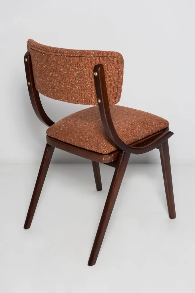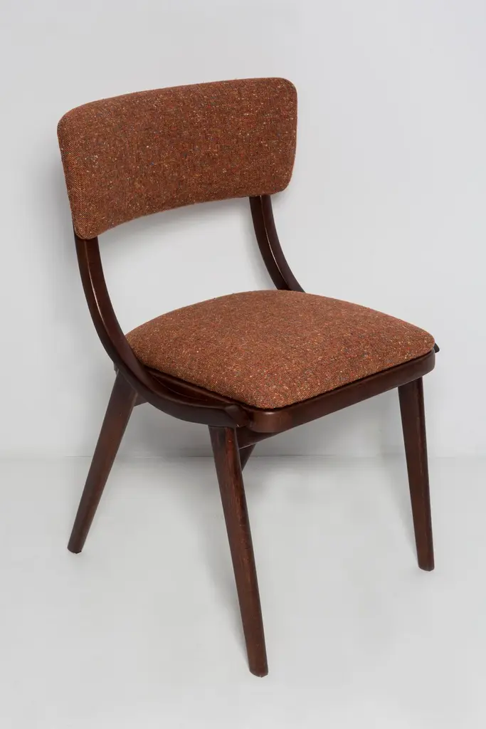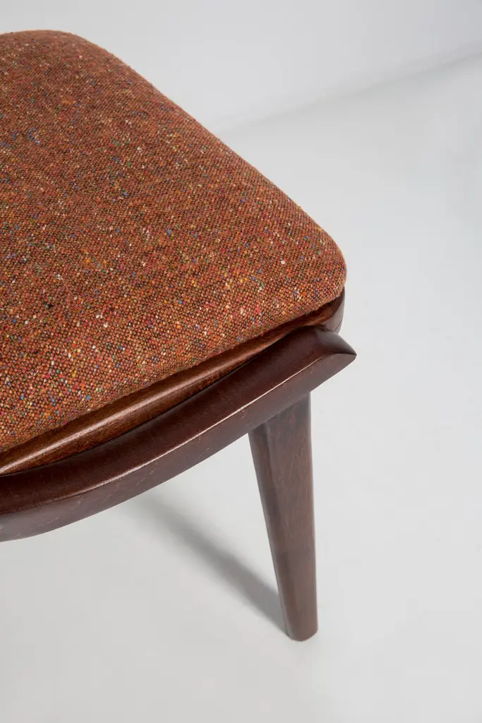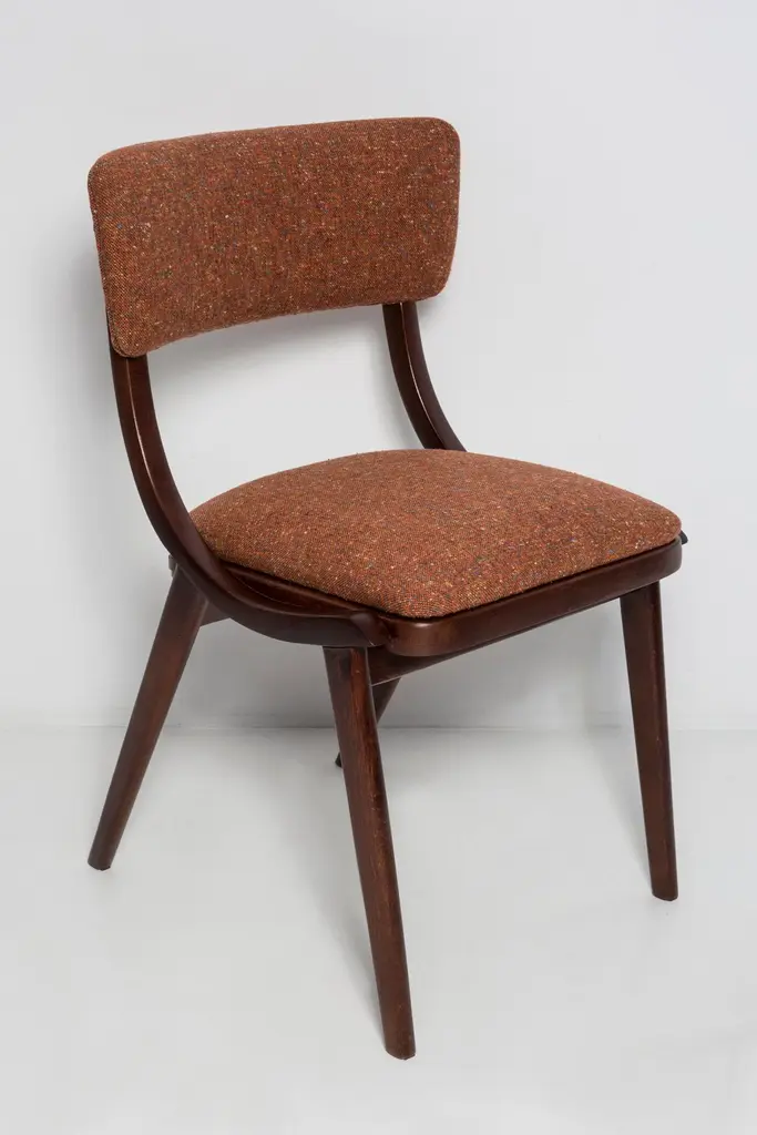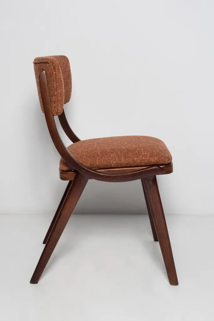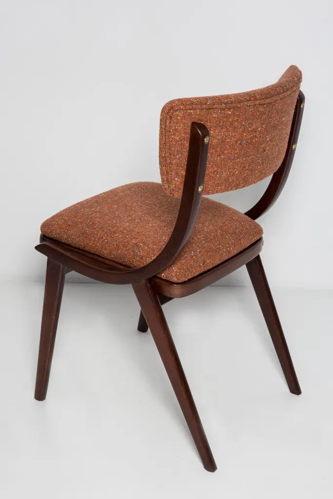 The “Bumerang Chair” is a characteristic piece of furniture from the Polish People’s Republic (PRL) era. Its name comes from the distinctive shape of the backrest, resembling a boomerang. The chair was often made from wood or wood-like materials, featuring simple and minimalist lines, and it was commonly painted in walnut or brown colors. This iconic chair serves as an example of design from that period.The Bumerang Chair was a popular furniture item during the PRL era due to its simplicity, functionality, and affordable price. Its design reflected the minimalist trends of that time. The backrest of the chair indeed had a shape reminiscent of a boomerang, giving it a unique appearance.Despite being a relatively simple piece of furniture, the Bumerang Chair gained significant popularity and became a symbol of that era in Polish design. Thanks to its functionality it was widely used in various places such as homes, offices, schools, and public institutions.Today, the Bumerang Chair can be seen as a nostalgic element, harkening back to the aesthetics of the PRL years. Its distinctive design appeals to collectors and vintage enthusiasts who seek furniture and items from that era.About the fabric:A multi-coloured, mélange upholstery fabric inspired by Ireland's signature Donegal tweed style. Colourful accents on a uniform background are very fine – from a distance the fabric gives the impression of uniform, from close up you can see small weaves of silk. Granola visually resembles the Prato collection, but is more subtle and has a greater variety of colour. Its mélange weave makes it a perfect match for interiors inspired by the 1960s style. It can be used to renovate vintage furniture and produce contemporary models of chairs, armchairs and sofas.It comes in 16 colour variants: from more subdued earth colours to pastels.Composition: Recycled Cotton 31%Recycled wool 22%Acrylic 21%Polyester 16%Silk 10%Weight: 535 g/m2Martindale: 70 000 Martindale cyclesWe can prepare this chair also in another wood and fabric color.Please ask for options.Here set of four chairs is available.
