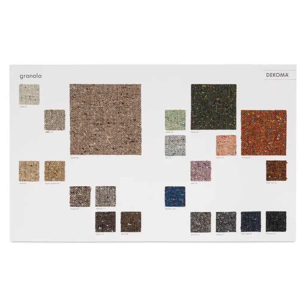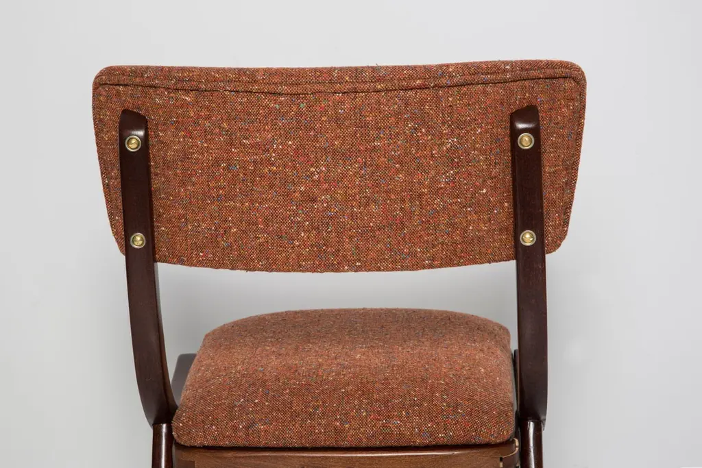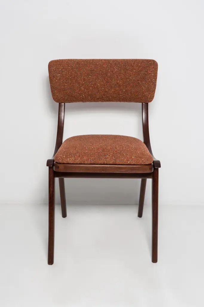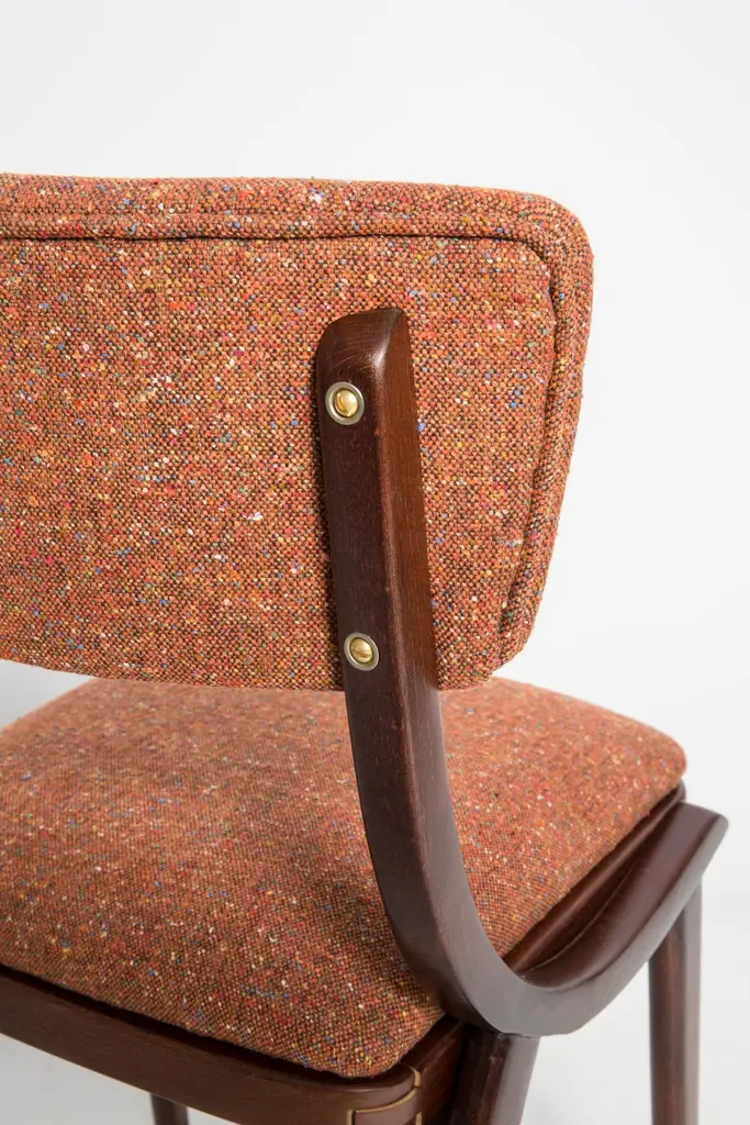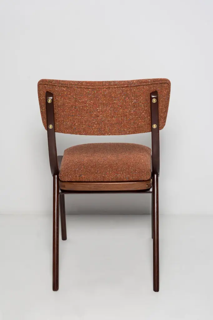 The “Bumerang Chair” is a characteristic piece of furniture from the Polish People’s Republic (PRL) era. Its name comes from the distinctive shape of the backrest, resembling a boomerang. The chair was often made from wood or wood-like materials, featuring simple and minimalist lines, and it was commonly painted in walnut or brown colors. This iconic chair serves as an example of design from that period.The Bumerang Chair was a popular furniture item during the PRL era due to its simplicity, functionality, and affordable price. Its design reflected the minimalist trends of that time. The backrest of the chair indeed had a shape reminiscent of a boomerang, giving it a unique appearance.Despite being a relatively simple piece of furniture, the Bumerang Chair gained significant popularity and became a symbol of that era in Polish design. Thanks to its functionality it was widely used in various places such as homes, offices, schools, and public institutions.Today, the Bumerang Chair can be seen as a nostalgic element, harkening back to the aesthetics of the PRL years. Its distinctive design appeals to collectors and vintage enthusiasts who seek furniture and items from that era.About the fabric:A multi-coloured, mélange upholstery fabric inspired by Ireland's signature Donegal tweed style. Colourful accents on a uniform background are very fine – from a distance the fabric gives the impression of uniform, from close up you can see small weaves of silk. Granola visually resembles the Prato collection, but is more subtle and has a greater variety of colour. Its mélange weave makes it a perfect match for interiors inspired by the 1960s style. It can be used to renovate vintage furniture and produce contemporary models of chairs, armchairs and sofas.It comes in 16 colour variants: from more subdued earth colours to pastels.Composition: Recycled Cotton 31%Recycled wool 22%Acrylic 21%Polyester 16%Silk 10%Weight: 535 g/m2Martindale: 70 000 Martindale cyclesWe can prepare this chair also in another wood and fabric color.Please ask for options.Here set of four chairs is available.