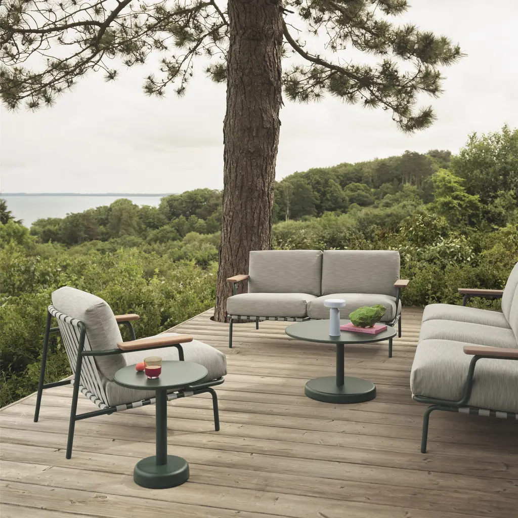 The Settle Lounge Chair features a minimalist steel frame paired with natural materials for a refined and airy design. FSC™-certified sapele mahogany armrests provide a warm, tactile contrast to the sleek metal structure. The seat and back cushions, made with quick-dry foam and durable outdoor fabrics, resist weather and are easy to maintain. Visible strap details add character, while the ergonomic design offers lasting comfort.